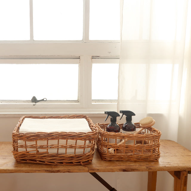 風合いの良い皮付きスクエアバスケットです。 アンティークな風合いと、どこか懐かしい素朴なデザインです。 素材には、表皮をそのまま残した「皮つきラタン」を使用。 使い込むにつれて色艶が増し、ラタンの味わいも深まっていきます。