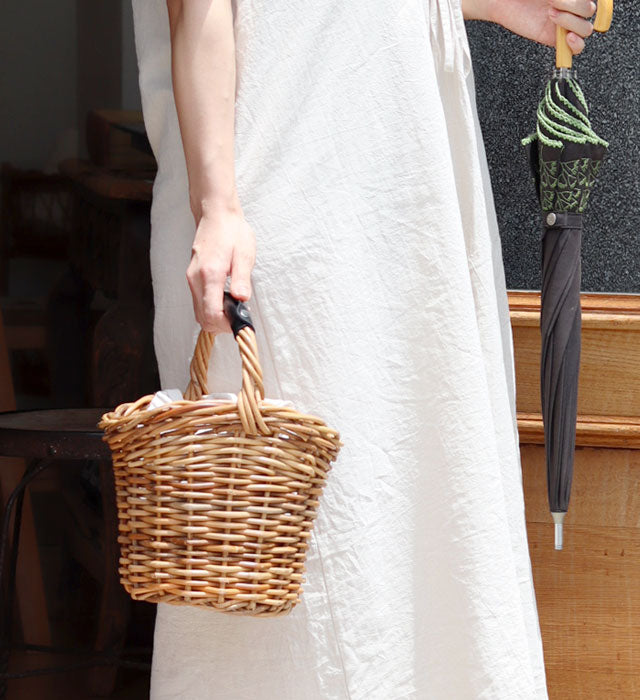 夏だけでなく冬も人気の天然素材アラログ使用のカゴバッグ。 アンティーク感を残すため、表皮をそのまま編みこんでおり、 なんともいえない味が人気です。 持ち手部分をリボンを巻いてアレンジするなど、お楽しみいただけます。
