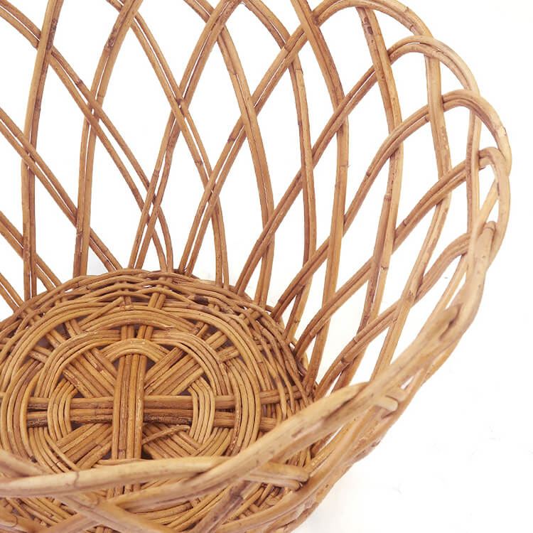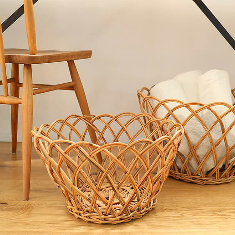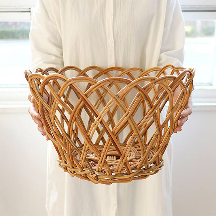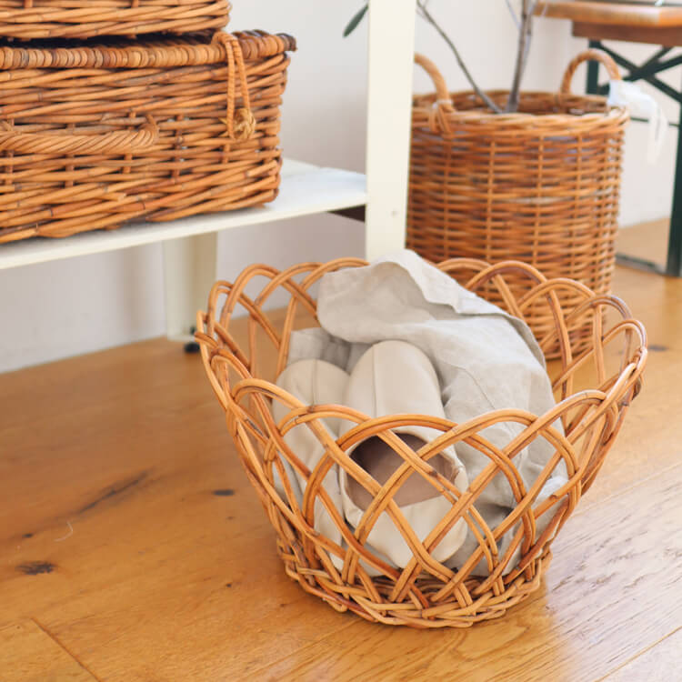 皮付きラタンを一つ一つ丁寧に編み込んだお花のようなレトロなデザインが人気のバスケットです。すべて天然素材で作り上げたこだわりの逸品です。たっぷり収納でき、軽量なので持ち運びもとても楽です。昔ながらの懐かしい人気のデザインでランドリースペースにあるだけで雰囲気があります。