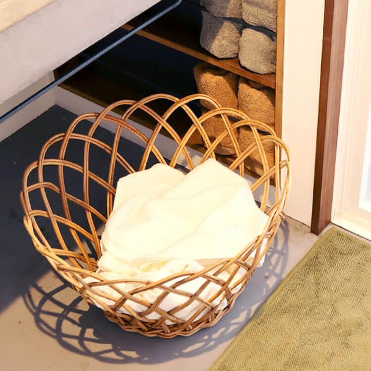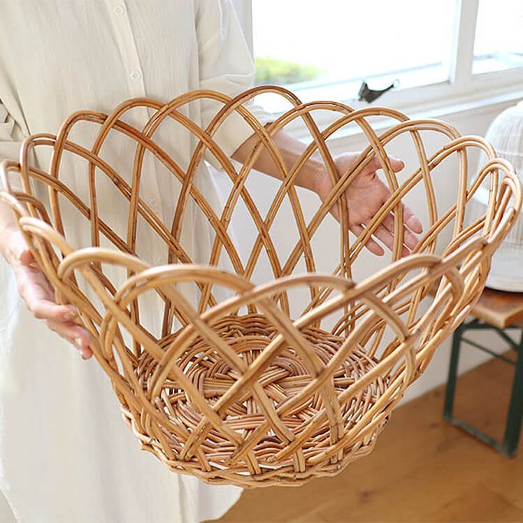 皮付きラタンを一つ一つ丁寧に編み込んだお花のようなレトロなデザインが人気のバスケットです。すべて天然素材で作り上げたこだわりの逸品です。たっぷり収納でき、軽量なので持ち運びもとても楽です。昔ながらの懐かしい人気のデザインでランドリースペースにあるだけで雰囲気があります。