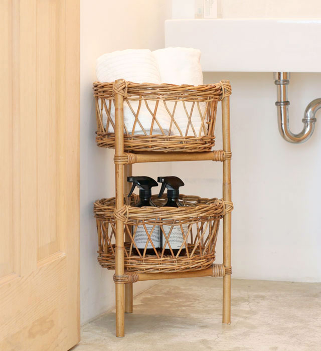 ヨーロッパのアンティークデザインを思わせる、風合い豊かな皮つきラタンの2段バスケット。 置いているだけでお部屋を温もりある空間にしてくれます。 一人暮らしの部屋やトイレなど、狭いスペースでも邪魔にならない丁度良いサイズ感です。 バスケットの深さも約17cmあるので、高さのあるボトルやボリュームのあるタオルなどもすっぽり収まります。 お掃除道具や、バスルームの脱いだ服を入れたりと様々なシーンで役立つアイテムです。 ラタンは経年の変化で、段々と味わいが増していく素材です。 自分色に染まっていき愛着が湧いてくるのも天然素材の魅力の1つです。