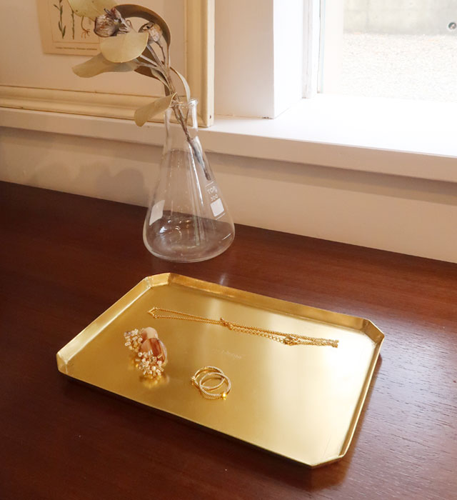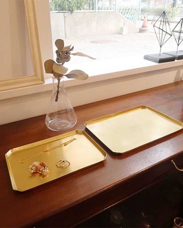 シンプルな真鍮風のトレイです。 全てハンドメイドなので、1点1点違った風合いが楽しめます。 レクトトレイSはネックレスやアクセサリーなど入れぴったり。 玄関の必需品入れとしてもおすすめです。 S、Lの2種類のサイズがございます。 サイズ違いで並べてもとっても可愛いです。