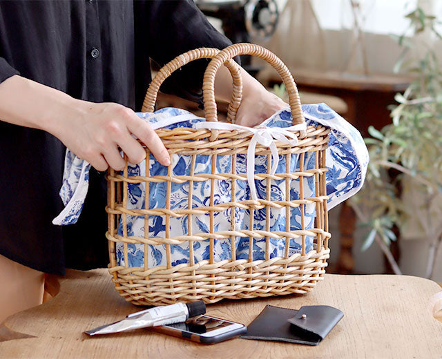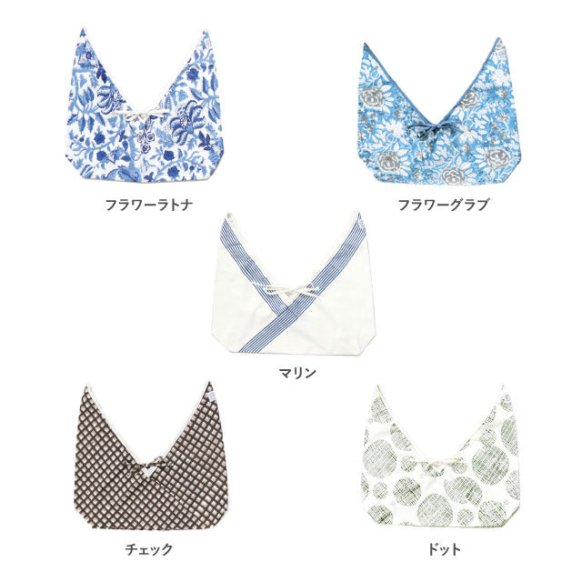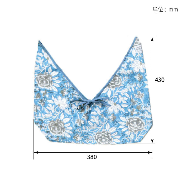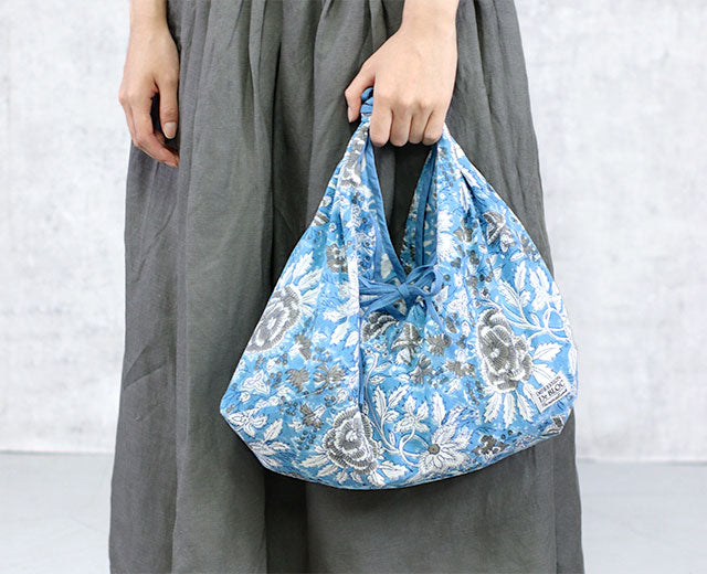 インドの伝統技法ブロックプリントを使った、1点1点表情が異なる風合い豊かなあずま袋です。 風呂敷としても使えるマルチなアイテム。 内袋としても、蓋がないカゴバッグなどに付けると目隠しにも。