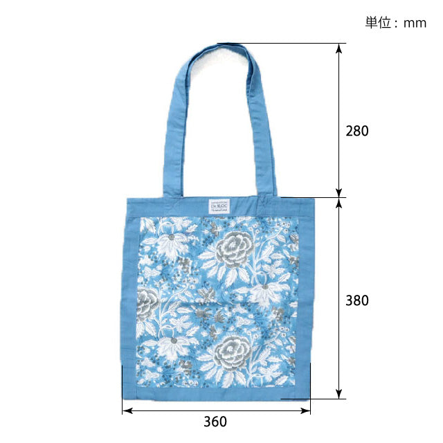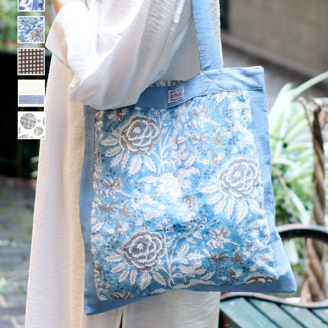 インドの伝統技法ブロックプリントを使った、1点1点表情が異なる風合い豊かなトートバッグです。A4サイズがすっぽり入るサイズ感。 買い物のエコバッグとしてはもちろん、普段使いのバッグとしてもおすすめです。ポケッタブル用の内ポケット付きで、コンパクトに収納が可能。メインバッグに入れておいても邪魔になりません。ブルーのラインが効いたシンプルで爽やかなデザイン。コーデを選ばない使いやすいデザインです。ブラックと薄いブラウンのラインがポイントになったデザイン。男性でも使いやすいシンプルなデザインです。柄は全4パターン。どれも大人女性にぴったりなナチュラルで上品なデザインです。