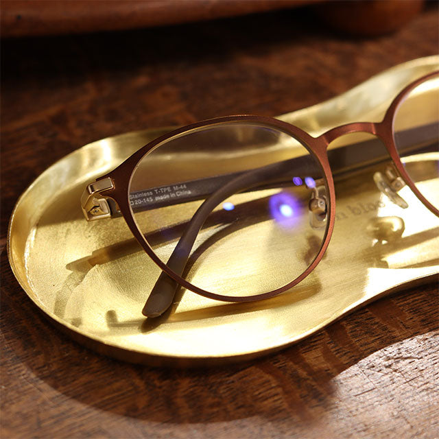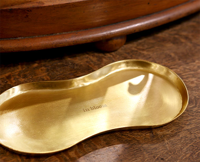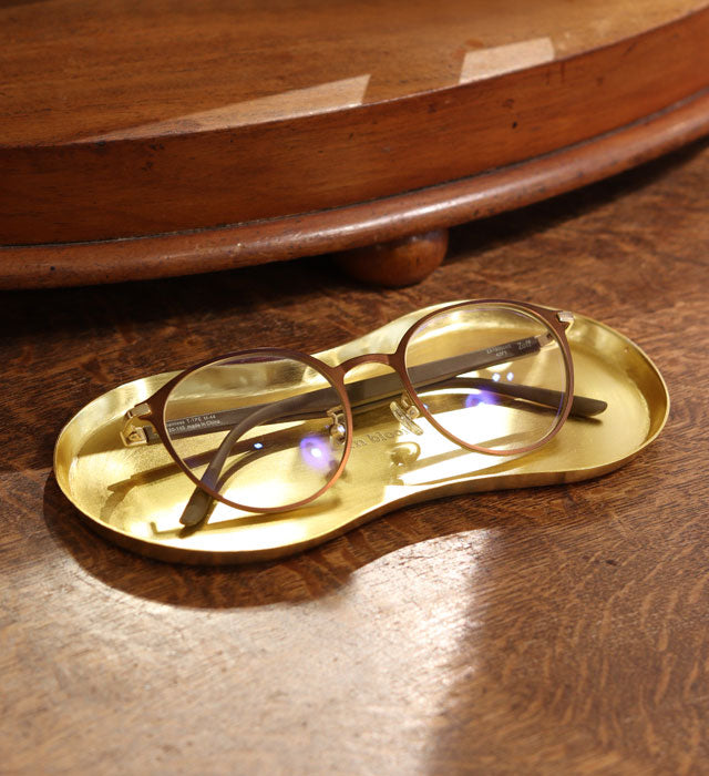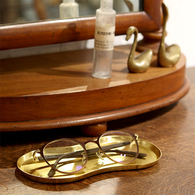使いやすさやサイズにこだわったメガネトレイ。1点1点ハンドメイドの繊細なデザインが特徴です。光沢のあるゴールド仕上げで、デスク周りを華やかにしてくれます。上品な雰囲気が◎メガネ以外にも小物やアクセサリー入れとしてもおすすめです。ハンドメイドならではの色ムラがアンティークな風合いを醸し出しています。同じinbloomシリーズで収納を揃えると統一感が出てさらに◎