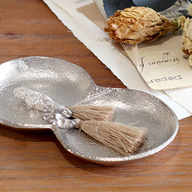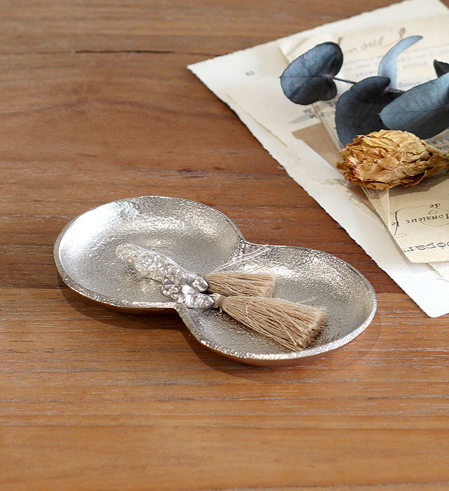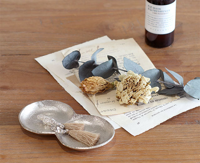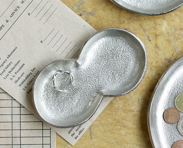 アルミ本来のシルバー色を活かしたハンドメイドのアルミトレイ。 アクセサリーや鍵、ステーショナリーなどの収納に。 デスクにあると便利なアイテムです。 形が歪なところや、表面の凹凸の個体差など、多様な表情が魅力のひとつ。 アンティークな風合いがデスクに置いてあるだけで雰囲気をグッと引き締めてくれますよ。 ダブルトレイは小さめのアクセサリーなどの収納におすすめのサイズ感。 同じシリーズのサイズ違いで並べても◎ 裏面には「santolina」のロゴが刻印されています。