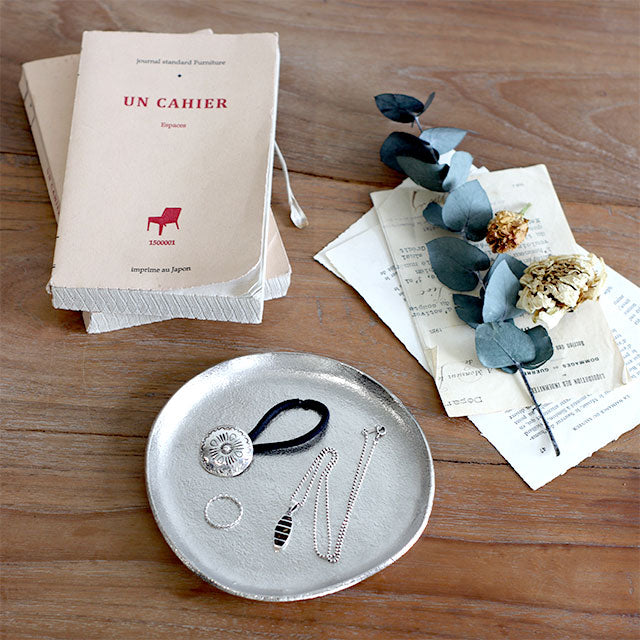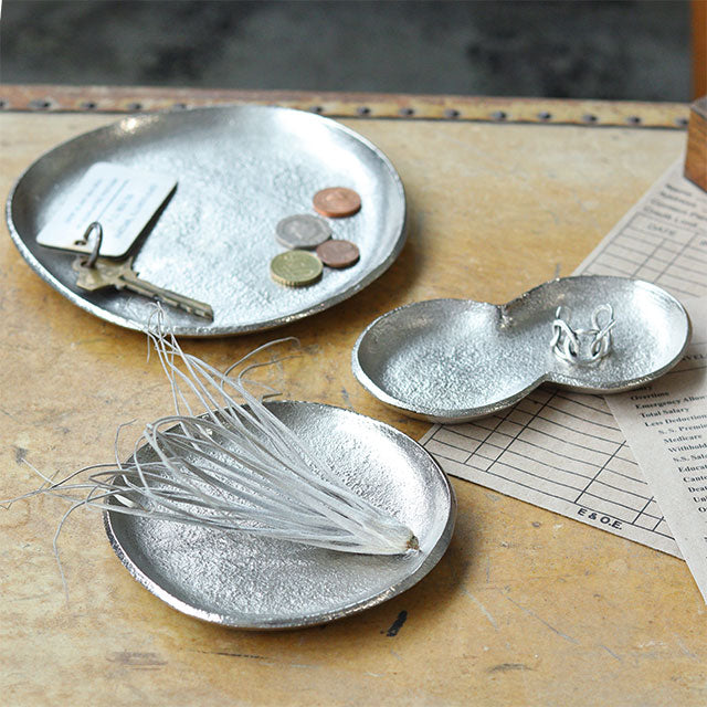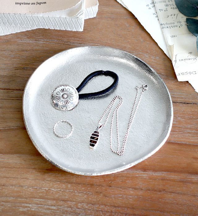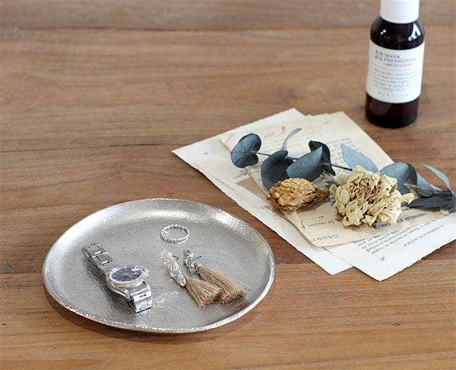 アルミ本来のシルバー色を活かしたハンドメイドのアルミトレイ。 アクセサリーや鍵、ステーショナリーなどの収納に。 デスクにあると便利なアイテムです。 形が歪なところや、表面の凹凸の個体差など、多様な表情が魅力のひとつ。 アンティークな風合いがデスクに置いてあるだけで雰囲気をグッと引き締めてくれますよ。 Sより一回り大きいMサイズは、玄関の鍵置きとしても便利なサイズ感。 同じシリーズのサイズ違いで並べても◎ 裏面には「santolina」のロゴが刻印されています。