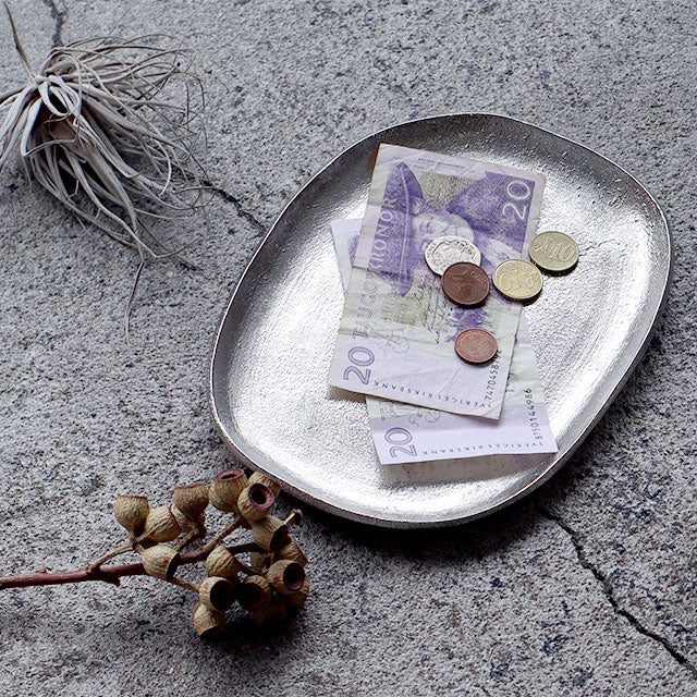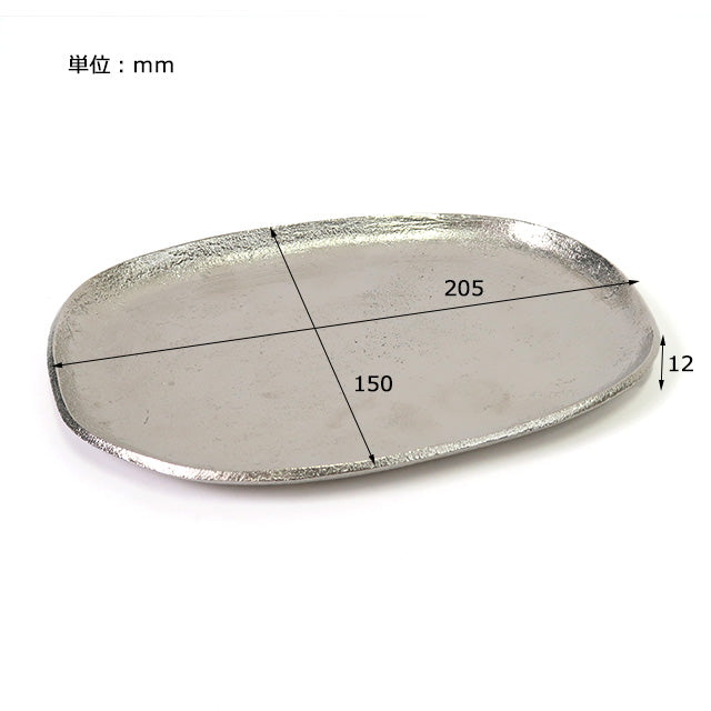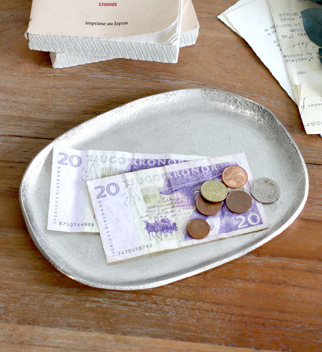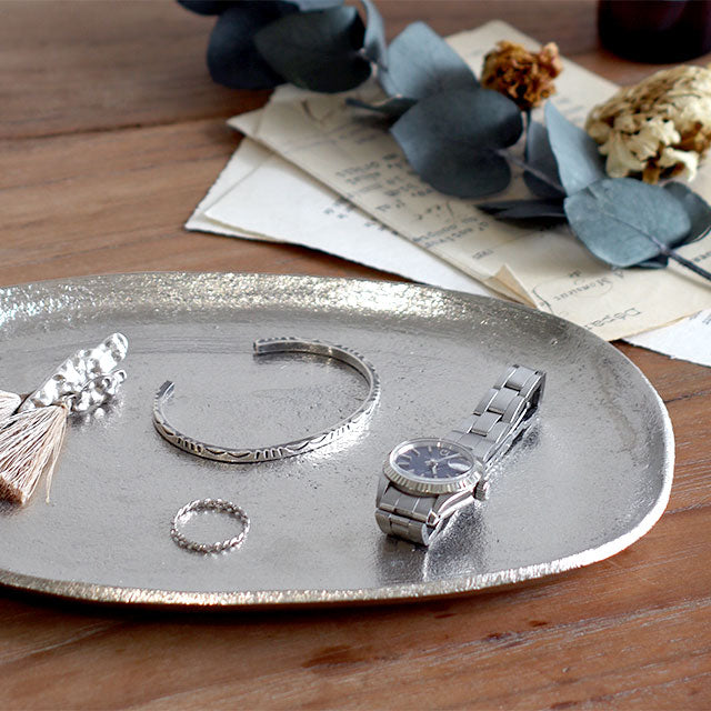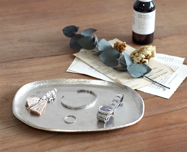 アルミ本来のシルバー色を活かしたハンドメイドのアルミトレイ。 アクセサリーや鍵、ステーショナリーなどの収納に。 デスクにあると便利なアイテムです。 形が歪なところや、表面の凹凸の個体差など、多様な表情が魅力のひとつ。 アンティークな風合いがデスクに置いてあるだけで雰囲気をグッと引き締めてくれますよ。 オーバルトレイはメガネを置いたり、大きめのアクセサリーもしっかり収まるサイズ感。 同じシリーズのサイズ違いで並べても◎ 裏面には「santolina」のロゴが刻印されています。