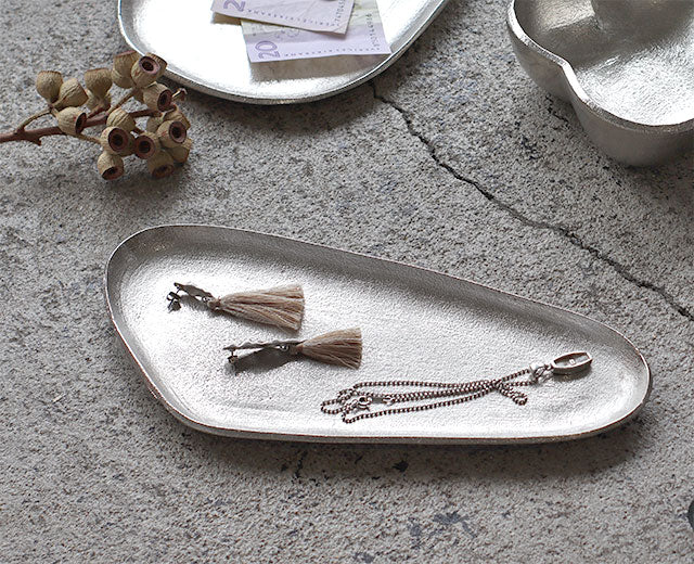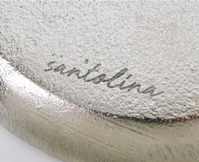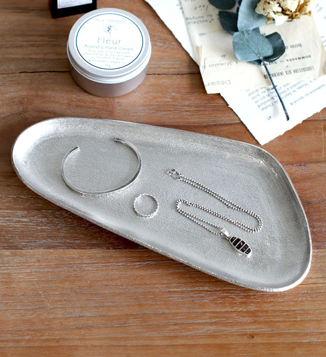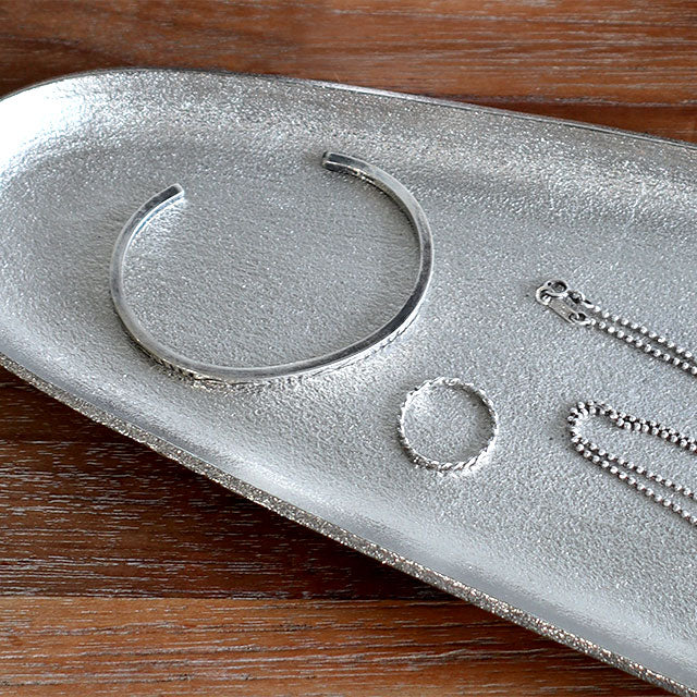 アルミ本来のシルバー色を活かしたハンドメイドのアルミトレイ。 アクセサリーや鍵、ステーショナリーなどの収納に。 デスクにあると便利なアイテムです。 形が歪なところや、表面の凹凸の個体差など、多様な表情が魅力のひとつ。 アンティークな風合いがデスクに置いてあるだけで雰囲気をグッと引き締めてくれますよ。 ロングトレイはメガネを置いたり、大きめのアクセサリーもしっかり収まるサイズ感。 同じシリーズのサイズ違いで並べても◎ 裏面には「santolina」のロゴが刻印されています。