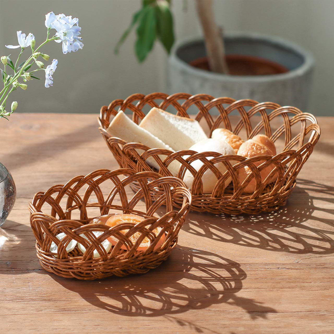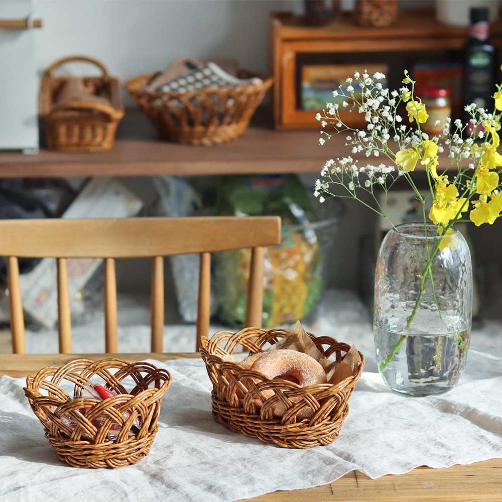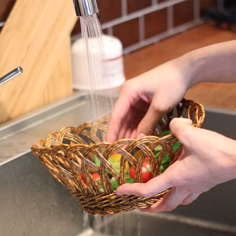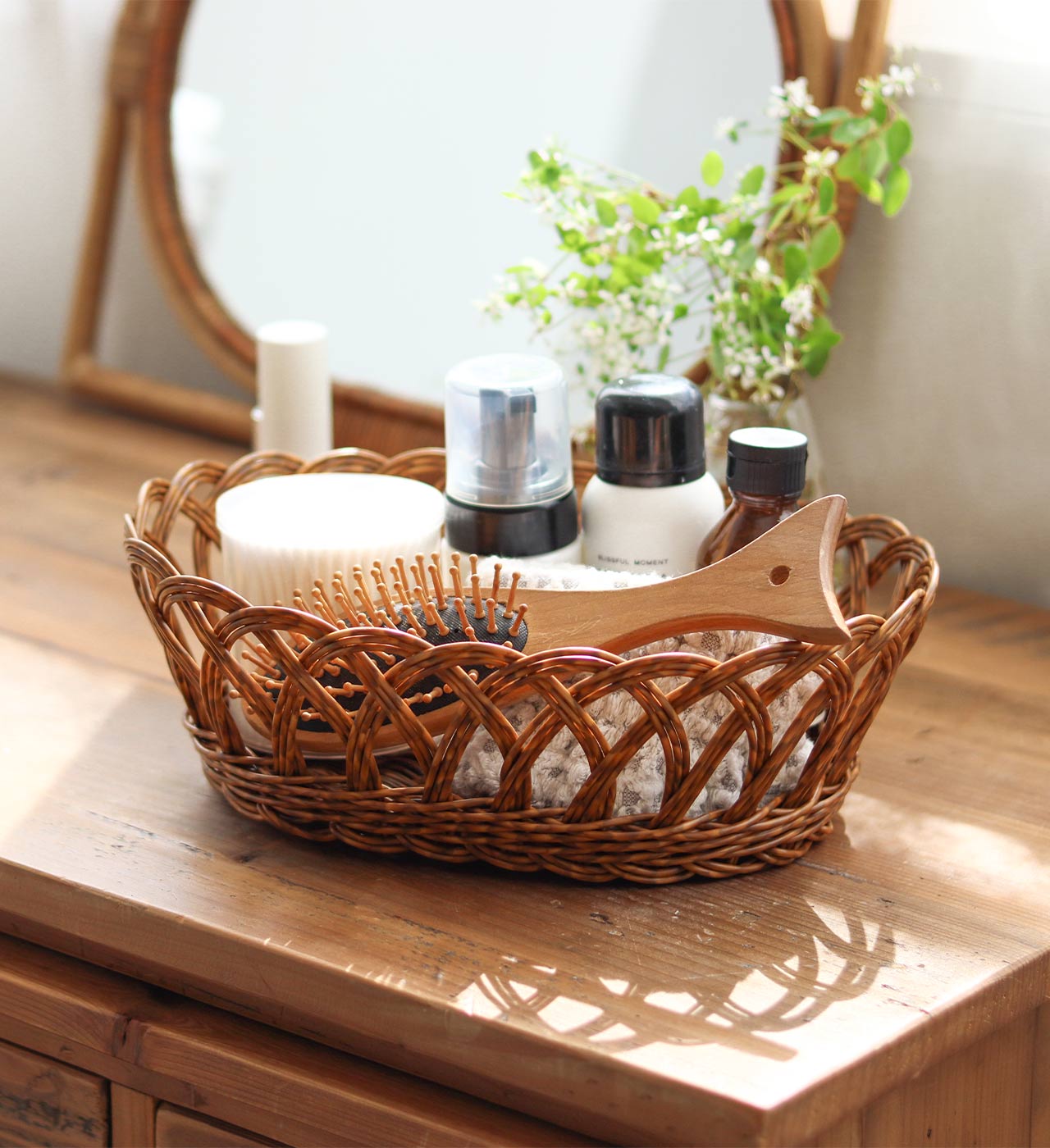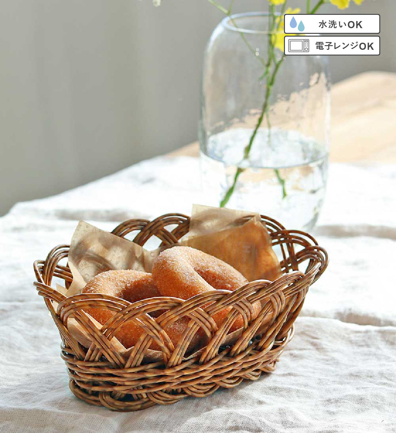 水洗いができる、見た目と機能性にこだわった手編みのバスケット。 見た目はまるで天然素材のバスケットのよう。 ナチュラルな雰囲気のお部屋にぴったりのデザインです。 汚れても水洗いが出来るので、キッチン周りの収納にもおすすめ。 ざっくり物を入れても様になります。 オーバルタイプは横長タイプなので、お菓子など並べるのにもおすすめです。 サイズはSとLの2サイズ。 Lサイズは、 毎日使う化粧品やケア用品をまとめるバスケットにおすすめです。 キッチンではパンやお菓子置き場として。電子レンジに対応しているので、温めたあとにそのまま食卓に出すことができます。 編み目の大きいデザインですが、ペーパーナプキンを敷けばクッキーなどの細かいお菓子も並べられます。 気軽に使えて、天然素材のバスケットのような雰囲気の楽しめるユティルシリーズです。