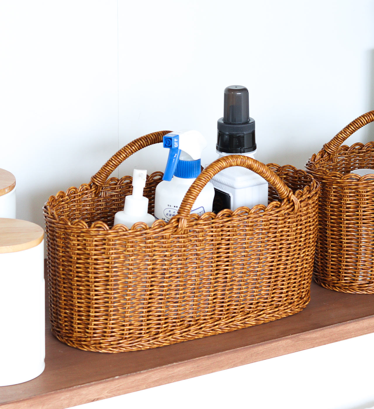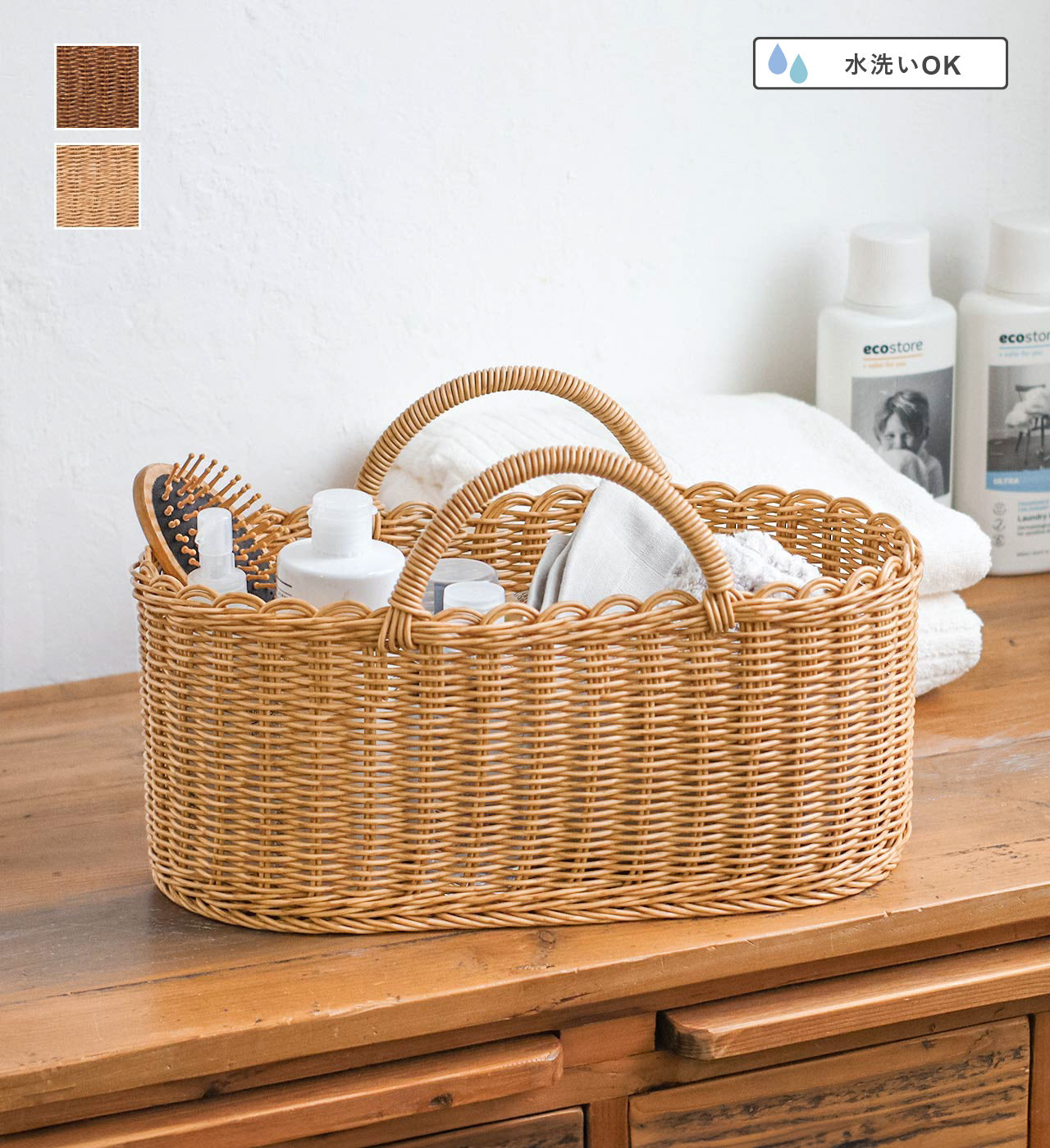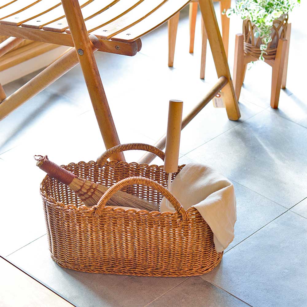 水洗いができる、見た目と機能性にこだわった手編みのバスケット。見た目はまるで天然素材のバスケットのよう。 ナチュラルな雰囲気のお部屋にぴったりのデザインです。汚れても水洗いが出来るので、キッチン周りやランドリースペースの収納にもおすすめ。ざっくり物を入れても様になります。収納としてはもちろん、買い物かごにもご使用頂けます。 サイズはSとLの2サイズ。Lサイズは横長タイプなので、 掃除道具など大きめの物もすっぽり納まります。汚れても水洗いできる機能性の高いバスケットです。その他ユティルシリーズで収納を揃えても統一感が出ておすすめです。