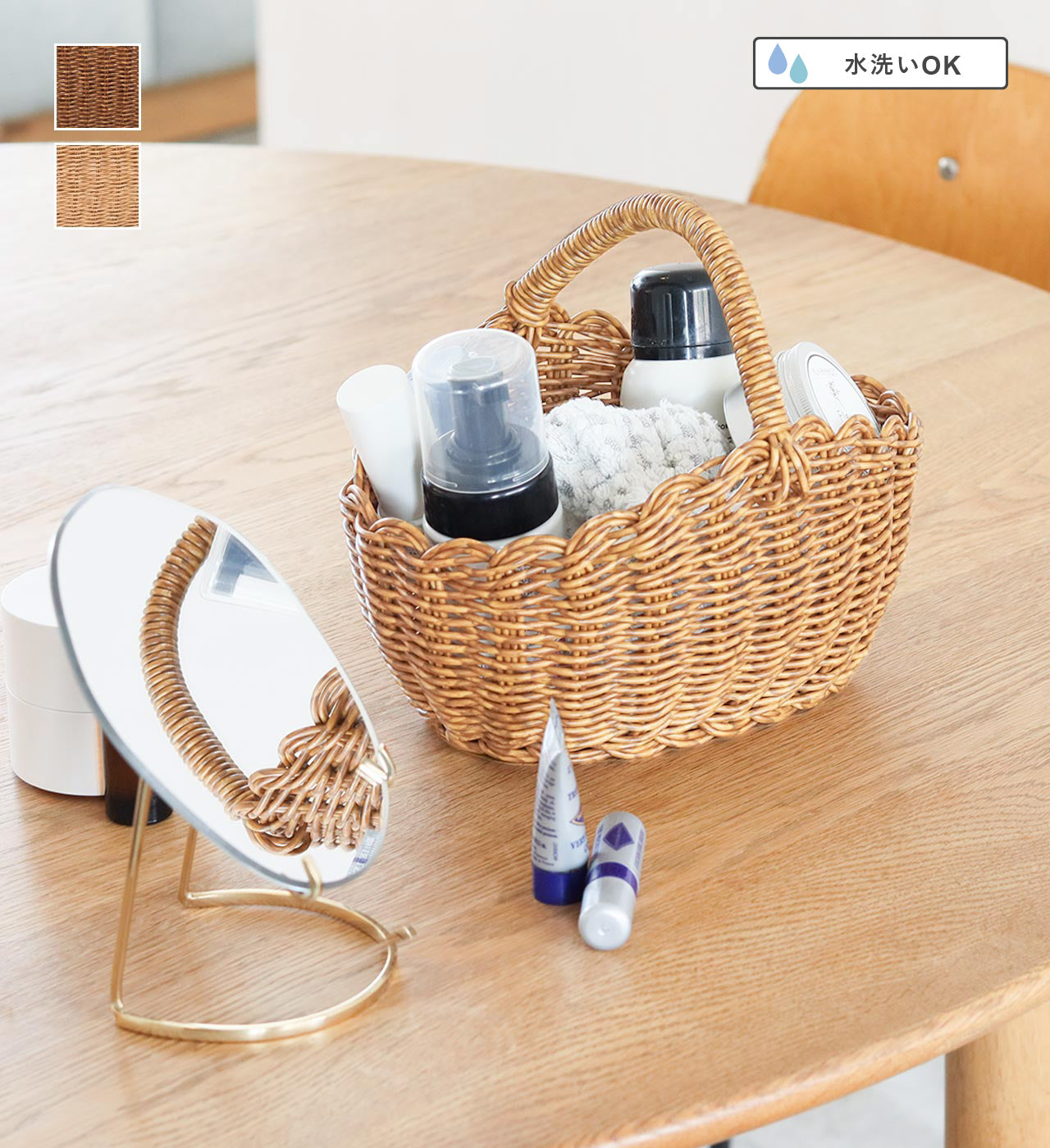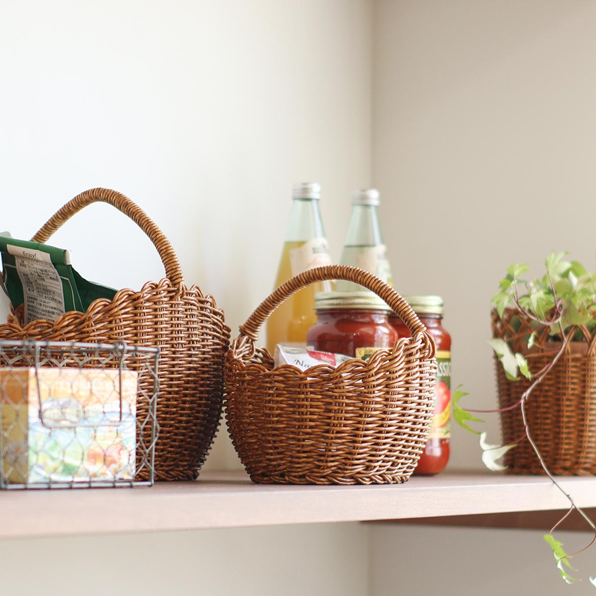 水洗いができる、見た目と機能性にこだわった手編みのバスケット。見た目はまるで天然素材のバスケットのよう。ナチュラルな雰囲気のお部屋にぴったりのデザインです。ワンハンドルで持ちやすく、高い所に置いても出し入れがしやすいデザインです。汚れても水洗いが出来るので、キッチンやガーデン用品など 汚れが気になる場所でもお使いいただけます。サイズはSとLサイズの2サイズ。並べて飾ると統一感が出てさらに◎