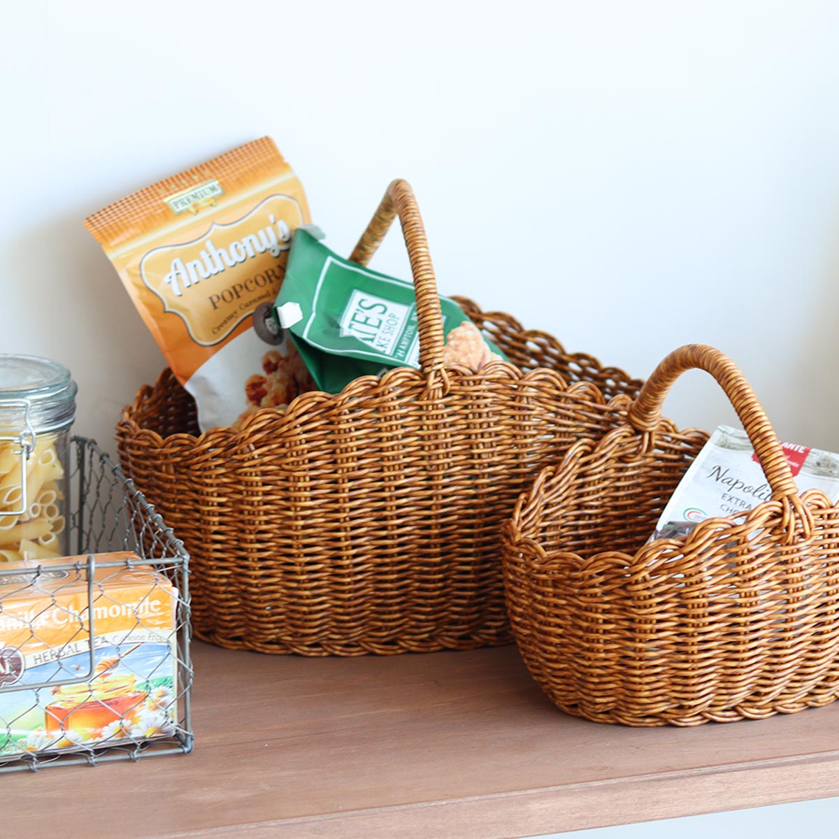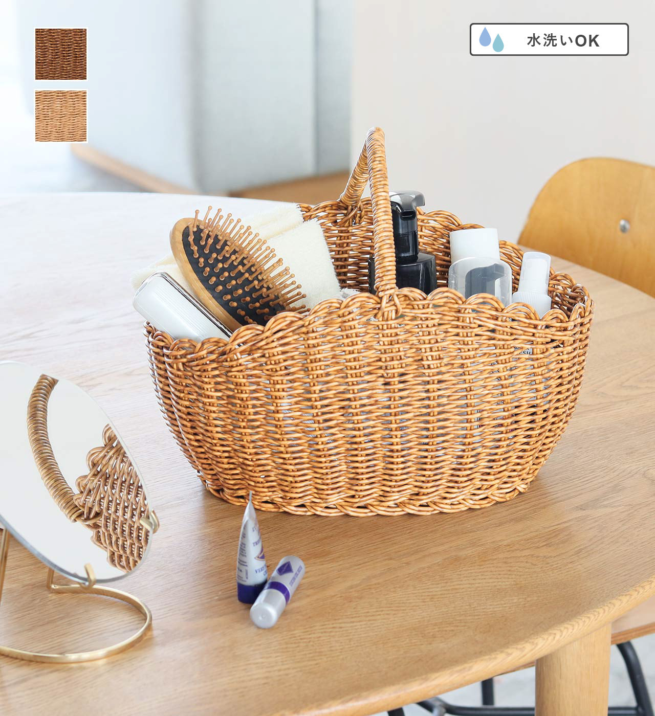 水洗いができる、見た目と機能性にこだわった手編みのバスケット。見た目はまるで天然素材のバスケットのよう。ナチュラルな雰囲気のお部屋にぴったりのデザインです。ワンハンドルで持ちやすく、高い所に置いても出し入れがしやすいデザインです。汚れても水洗いが出来るので、キッチンやガーデン用品など 汚れが気になる場所でもお使いいただけます。深さのあるLサイズは小さめの鉢や観葉植物を 寄せ植えのように詰めるのにぴったり。サイズはSとLサイズの2サイズ。並べて飾ると統一感が出てさらに◎