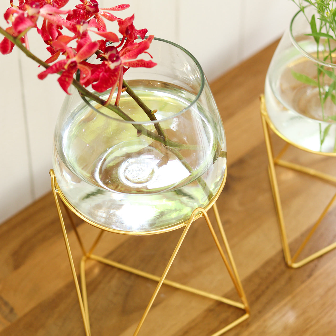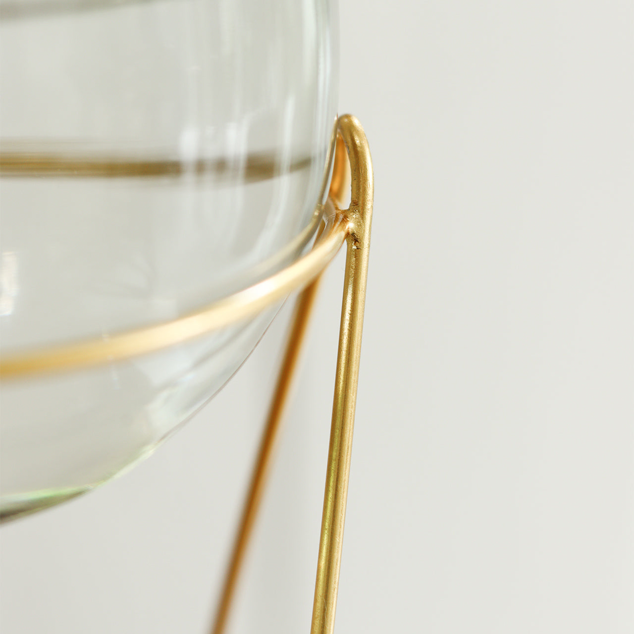 アクセサリーや小物を華やかにディスプレイできるinbloomシリーズに、ゴールド仕上げのスタンド付きガラスベースが加わりました。 ワイングラスのような丸みを帯びたガラスベースに華奢なゴールドの組み合わせが魅力的です。 スタンドの高さ約190mmのLサイズは存在感抜群。 小物との組み合わせも楽しめます。 口の広いガラスベースは ボリュームのあるお花から繊細なお花まで幅広く飾ることができます。 ゴールド仕上げのアイアンのスタンドがガラスベースをしっかりと支えてくれます。 スタンド部分にはさりげなく「inbloom」の刻印が。 サイズはSとLの2サイズ。 2つ並べて飾るのもおすすめです。