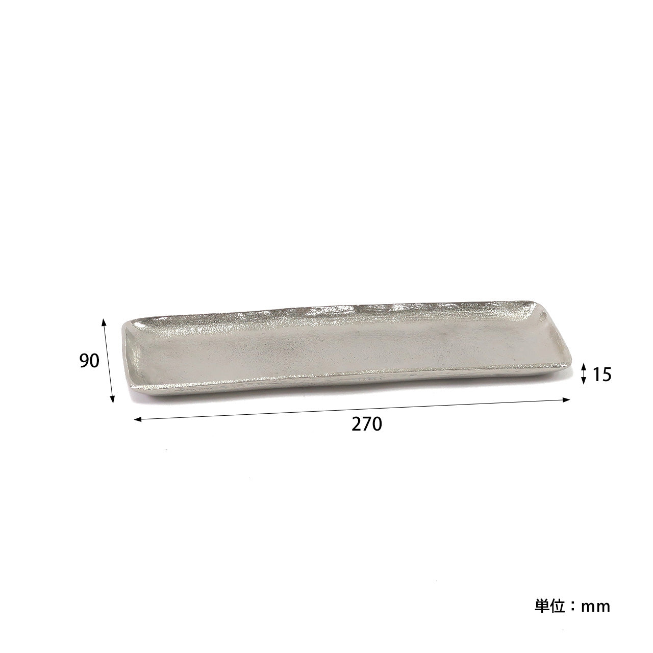 アルミ本来のシルバー色を活かしたハンドメイドのアルミトレイ。ネックレスなどの収納に便利なレクトタイプ。サントリナのシリーズにアクセサリーの収納に便利なレクトタイプが仲間入りしました。お気に入りや毎日つけるネックレスの保管場所に、まっすぐ置けるレクトタイプはチェーンが絡まる心配がなくスムーズに取り出せます。アクセサリートレイのほかに、御香立てと合わせて香皿としての使い方もおすすめです。長さと幅にゆとりのあるLサイズは、ネックレス以外にリングやピアスなどの小物も並べて収納いただけます。アルミ本来のシルバー色を活かしたシリーズ。表面の凹凸の個体差など多用な表情が魅力です。同シリーズでよりディスプレイにぴったりのスタンドタイプもございます。