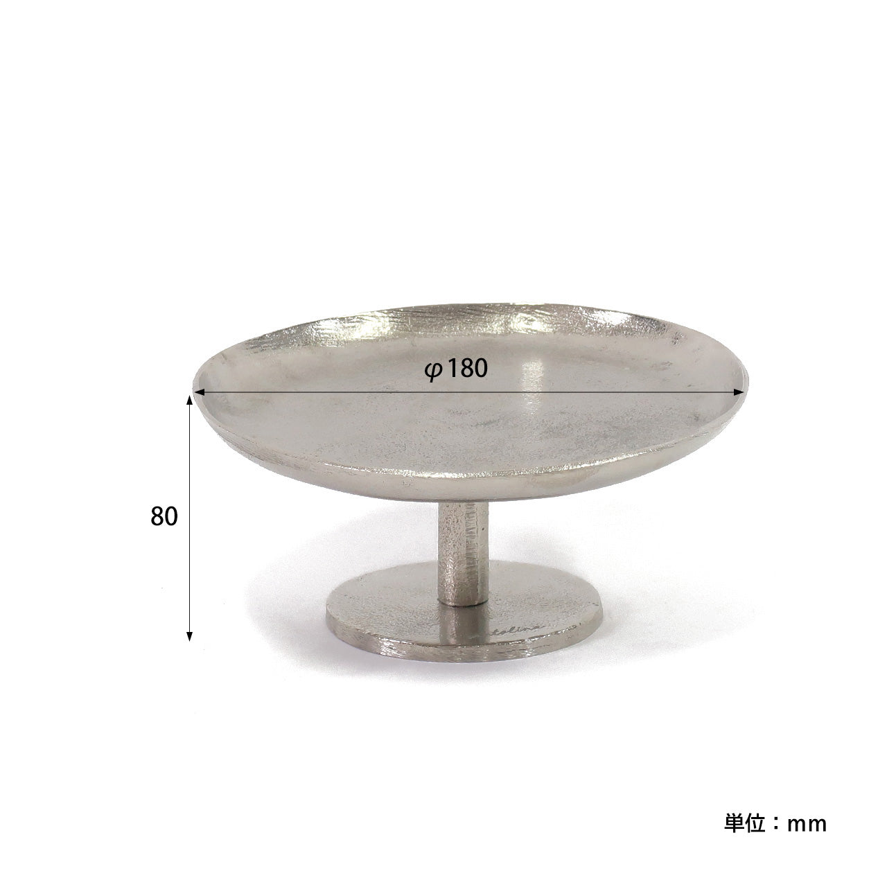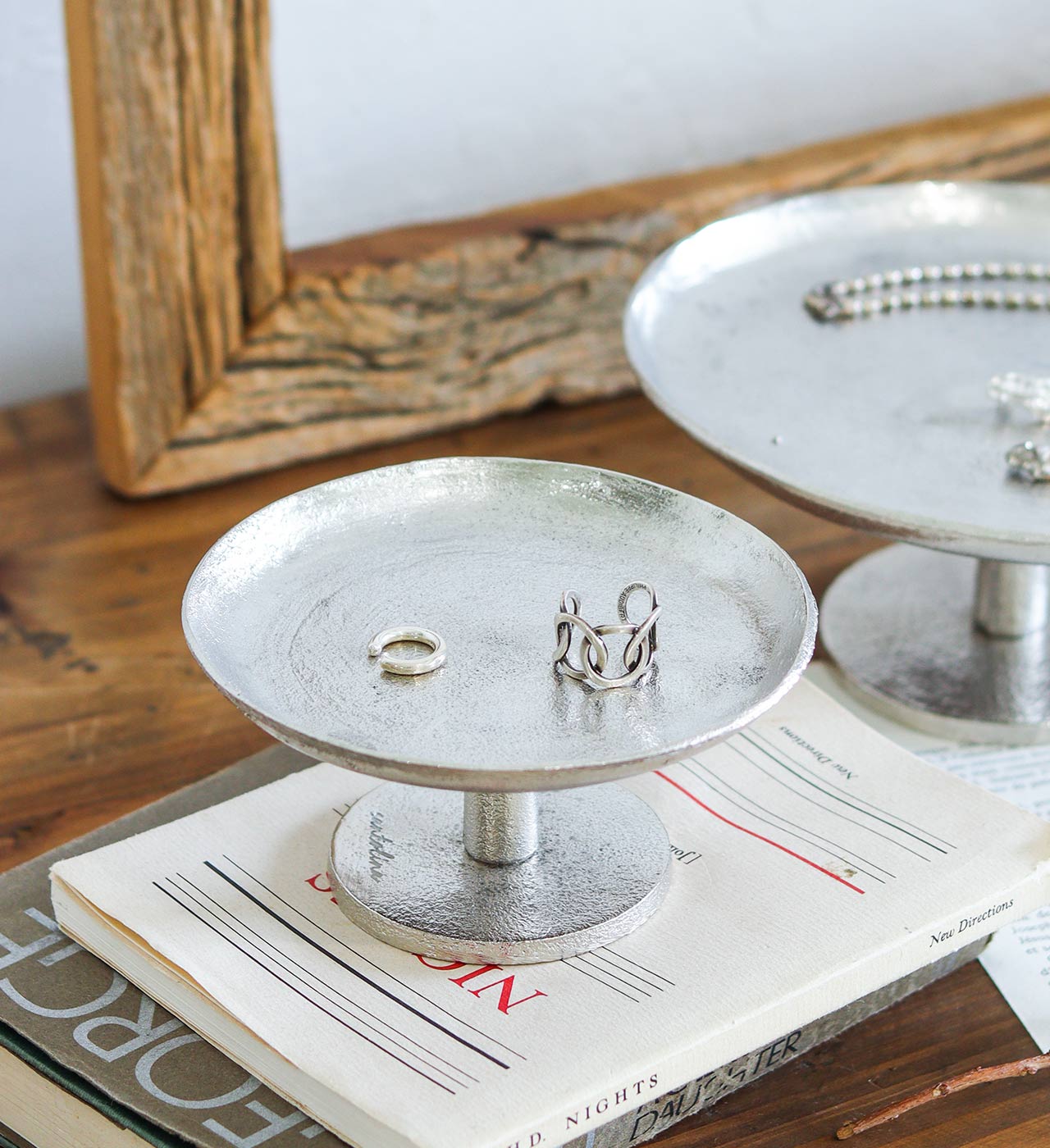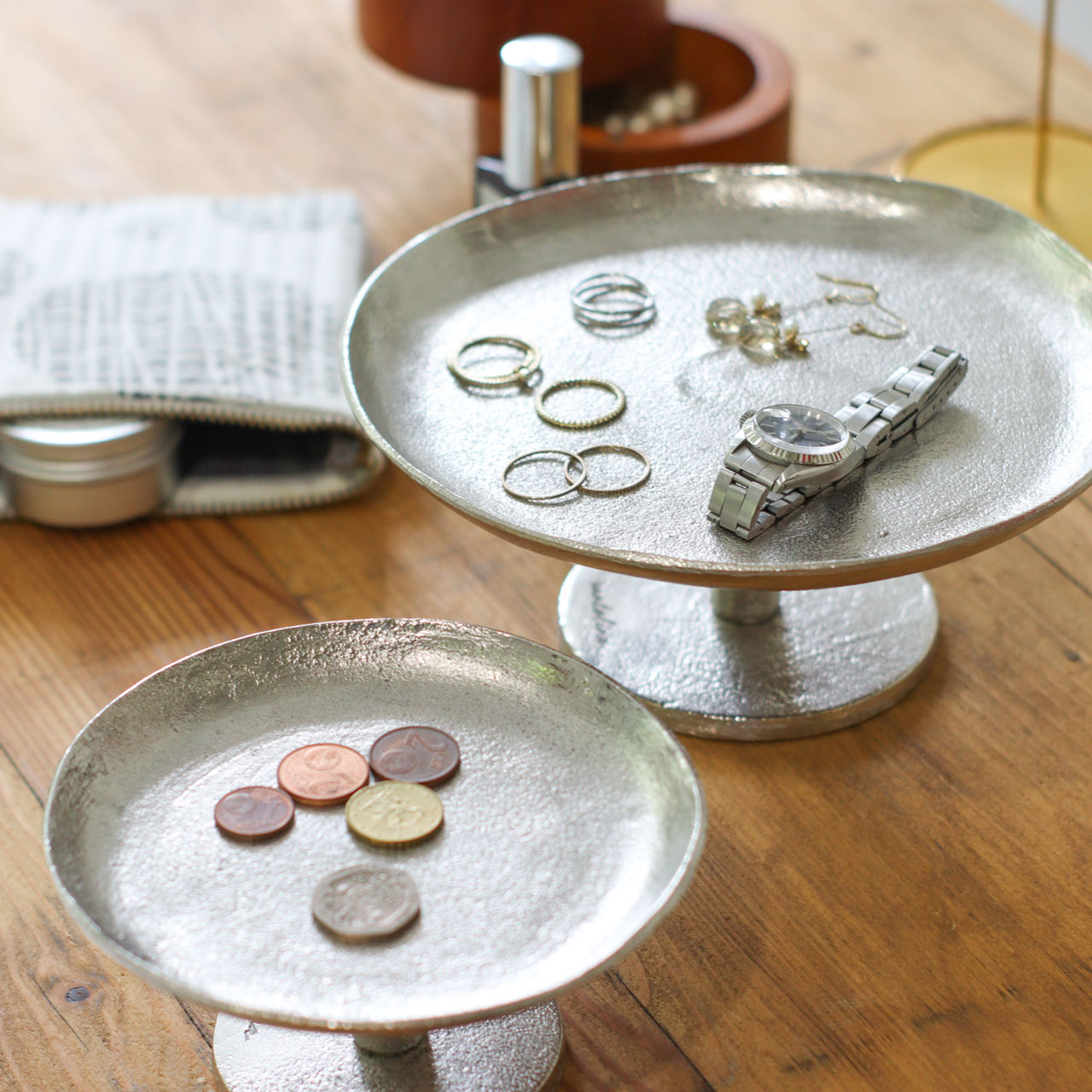 アルミ本来のシルバー色を活かしたハンドメイドのアルミトレイ。ピアスやリングの見せる収納に便利なスタンドタイプ。サントリナのシリーズにリングやピアスなど小物の見せる収納にぴったりなスタンドタイプが仲間入りしました。アクセサリーの他に、玄関先に置いてキートレイとしてもお使いいただけます。SとLの2サイズ。小ぶりなSサイズは毎日使うお気に入りや大切なアクセサリーをディスプレイするのにぴったりです。余裕のあるLサイズは腕時計からブレスレット、ネックレスまで普段身に着けるアイテムをそのまま 収納いただけます。机の上にあると空気がすこし引き締まるような、アルミの本来のシルバー色の魅力が引き立つアイテムです。木製品やゴールド小物との相性も◎