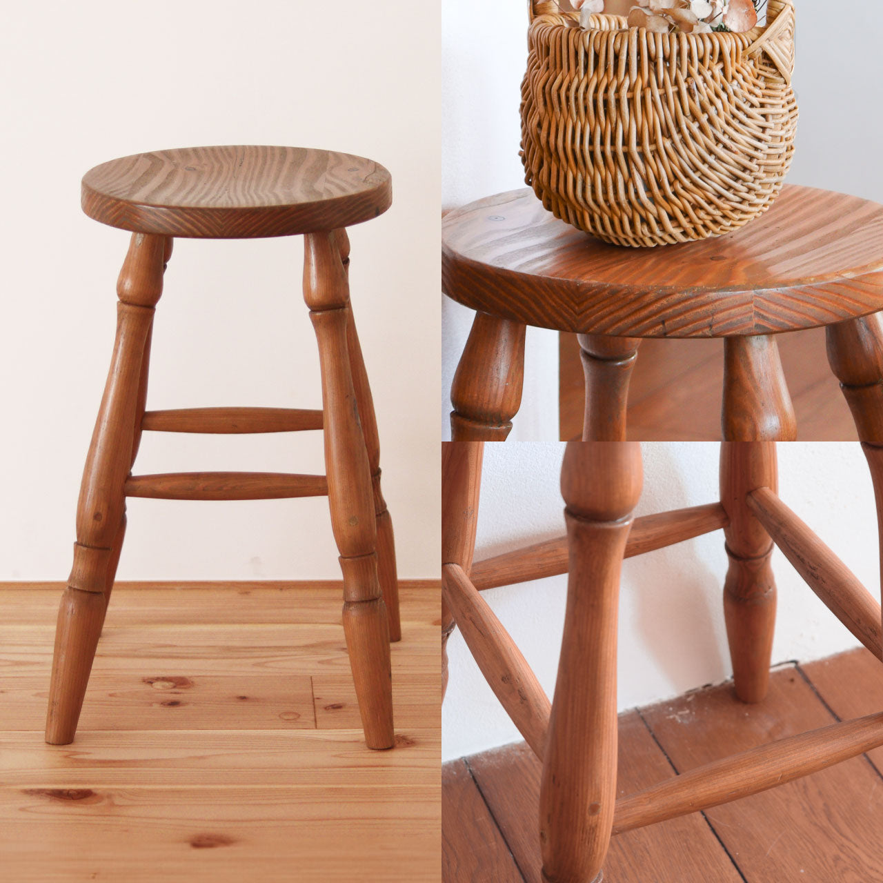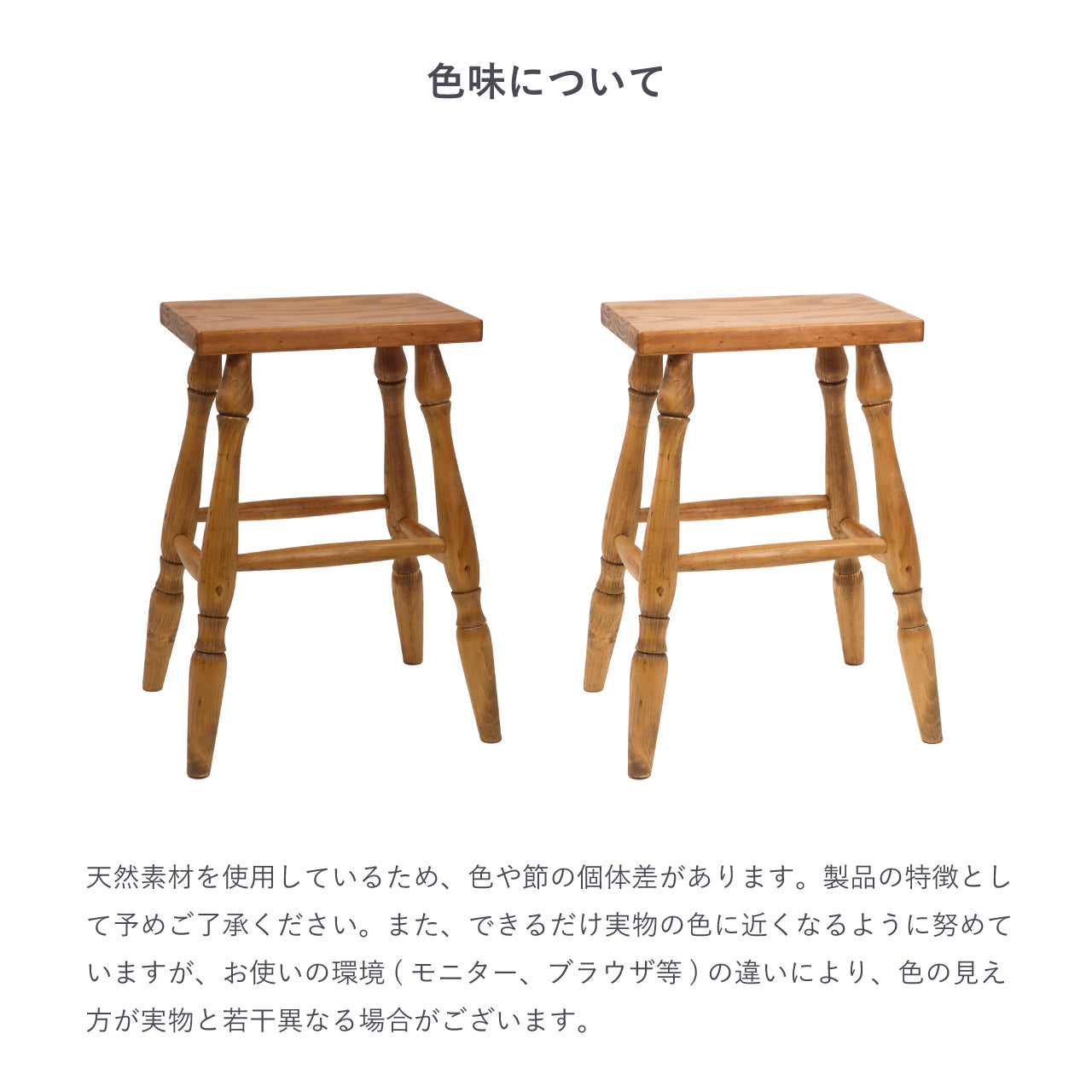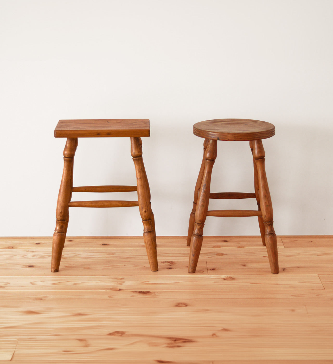 アンティークのような風合いにこだわったパイン材のスツールです。同じ高さの「ラウンドスツール」「レクトスツール」の2タイプ。キッチンで少し腰かけたい時や来客時の椅子としてはもちろん、ソファサイドに置いてサイドテーブルのような使い方もおすすめです。(モデル身長:155cm)アンティークのような雰囲気に仕上げたスツールは、花台やバスケットなどインテリアのディスプレイとしてもお使いいただけます。木材ならではの曲線を活かす脚のデザインや、座りやすいように座面に少し凹みをつける加工など細部にもこだわりました。【色味について】天然素材を使用しているため、色や節の個体差があります。製品の特徴として予めご了承ください。また、できるだけ実物の色に近くなるように努めていますが、お使いの環境(モニター、ブラウザ等)により、色の 見え方が実物と若干異なる場合がございます。