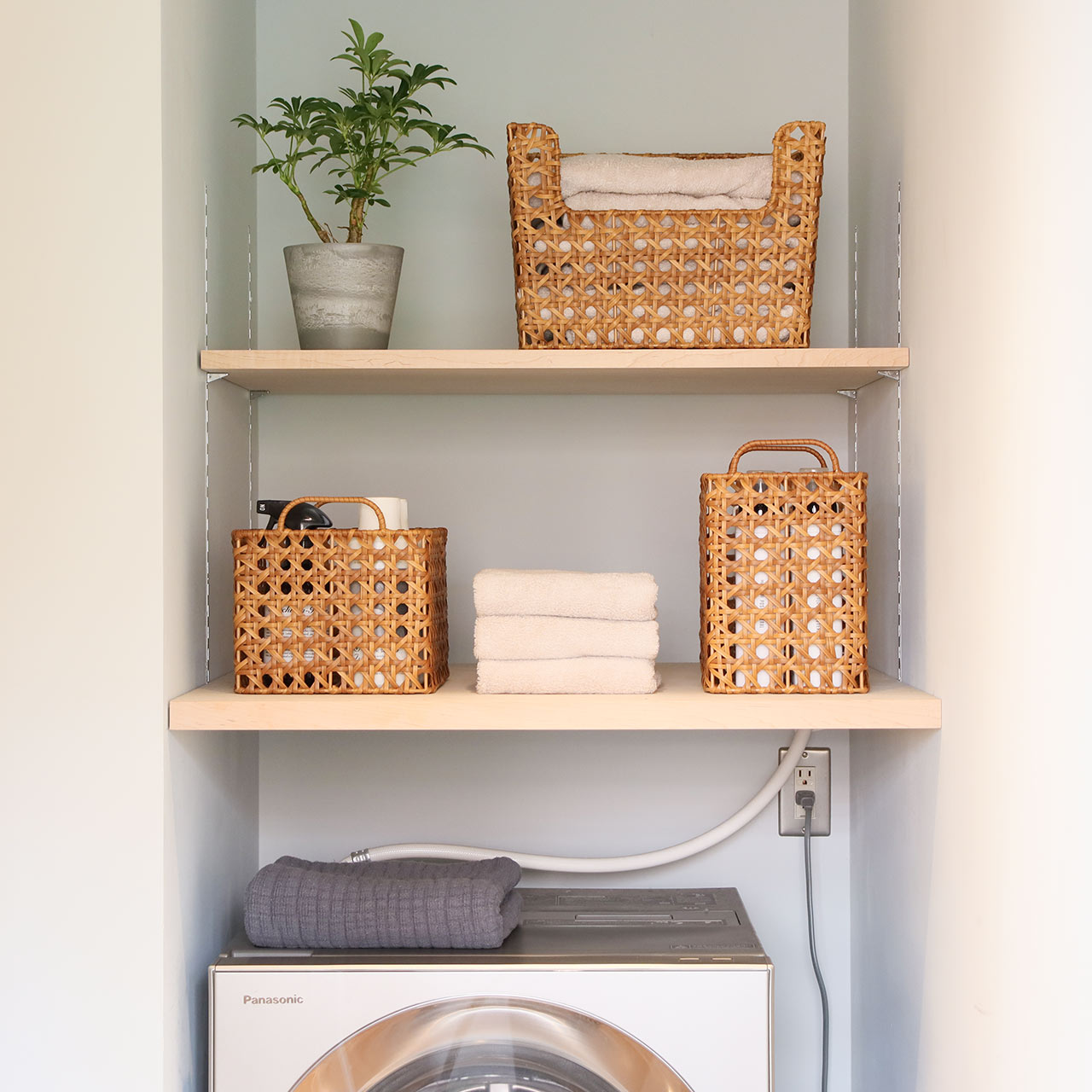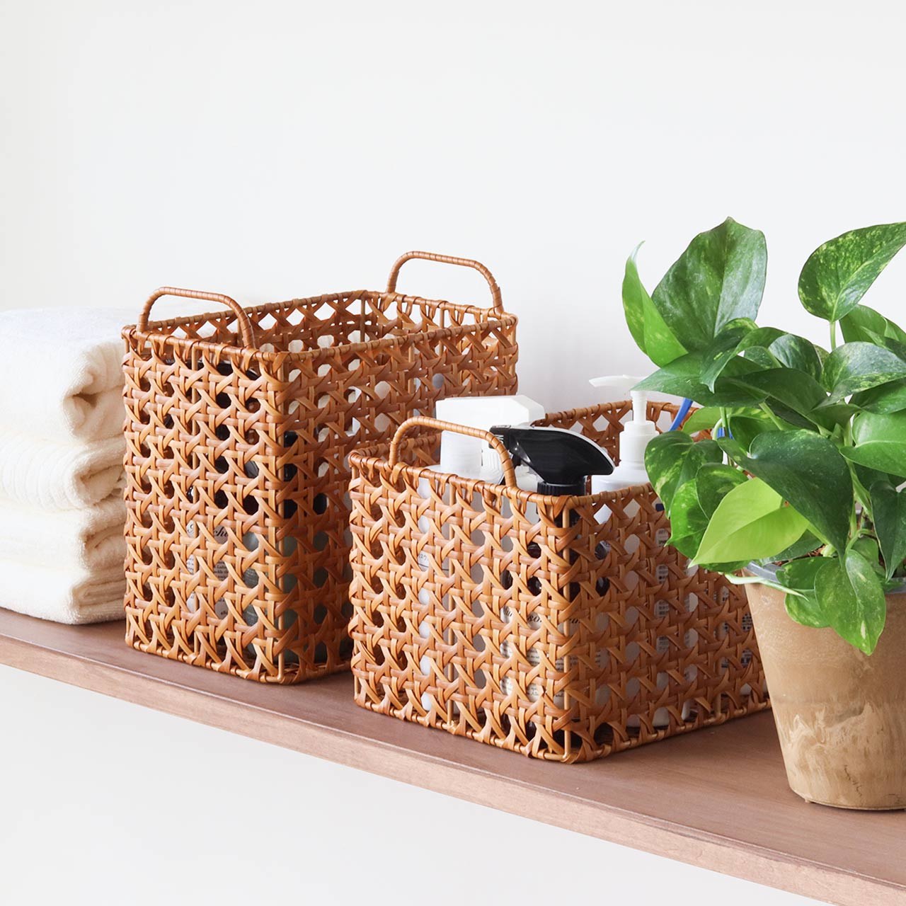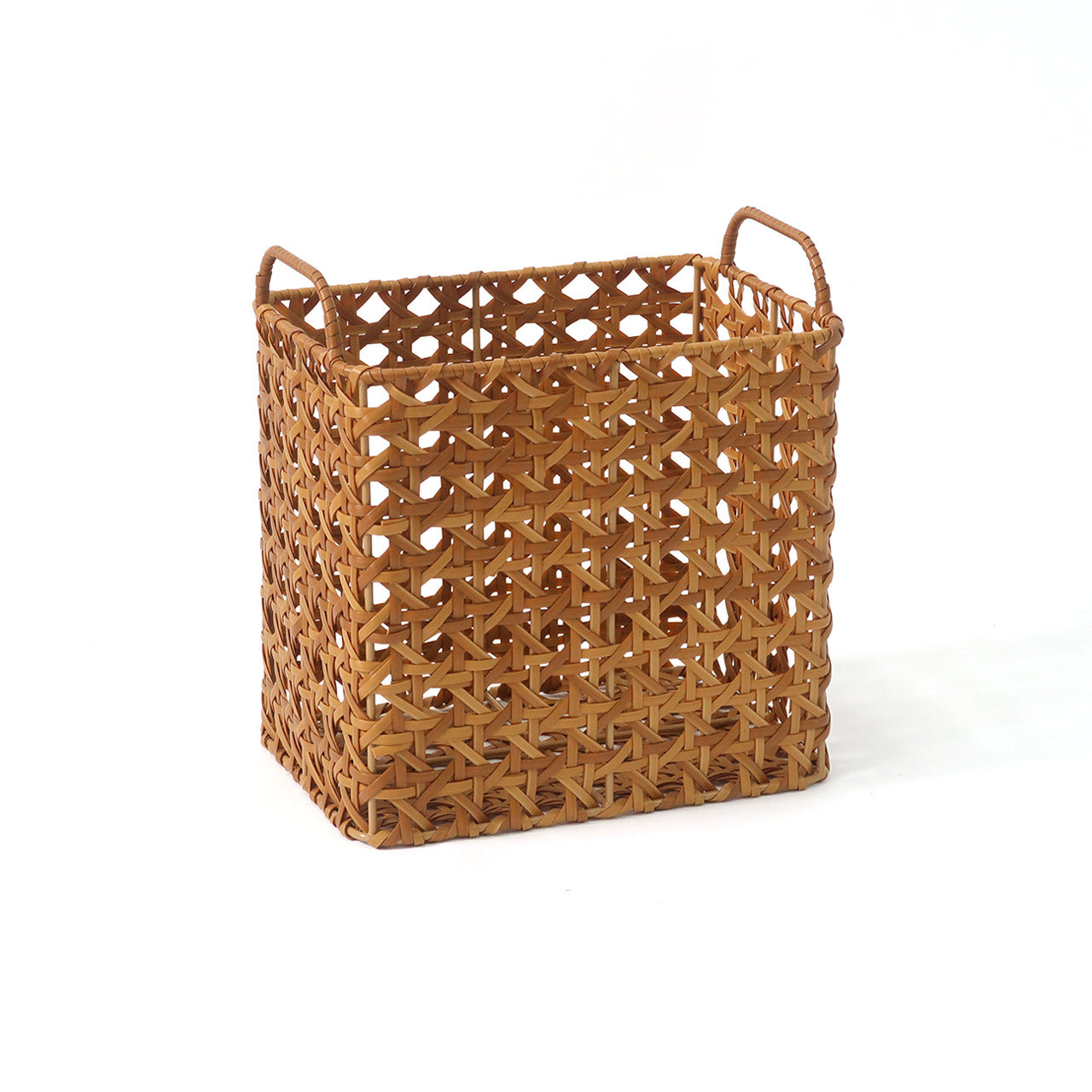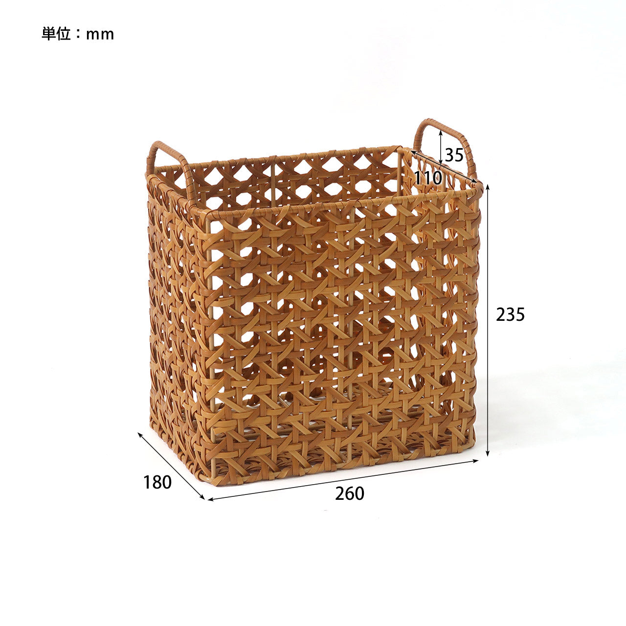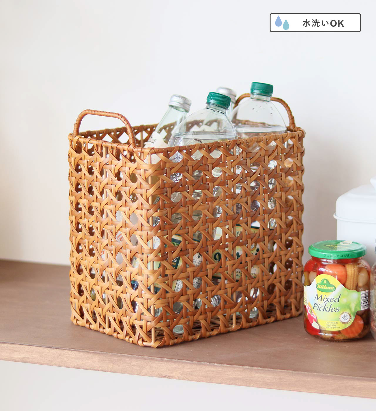 八つ目編みのレクトバスケット。深さや幅の異なる2タイプ。 ポリプロピレン、ポリエチレンチューブを使って手作業で編まれたバスケットです。 水に強い素材なので、汚れた時は水洗いも可能。ナチュラルな雰囲気で見える場所に置いていても 気になりません。(※濡れたままの状態で長期間放置すると錆の原因となりますのでご注意ください。 バスケット ハイタイプの深さは約23.5cm。柔軟剤などの毎日よく使うアイテムをすっきり収納できます。 ナチュラルなデザインなので見せる収納バスケットにぴったり。レクトバスケットの深さは約17.5cm。レトルトカレーの外箱が立てて入れられるサイズ感です。その他のサイズと合わせてのご使用も統一感が出ておすすめです。