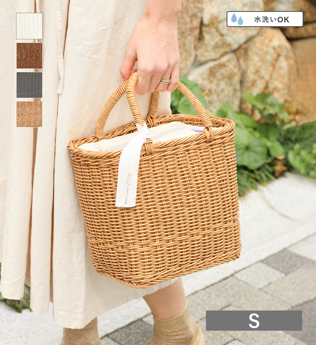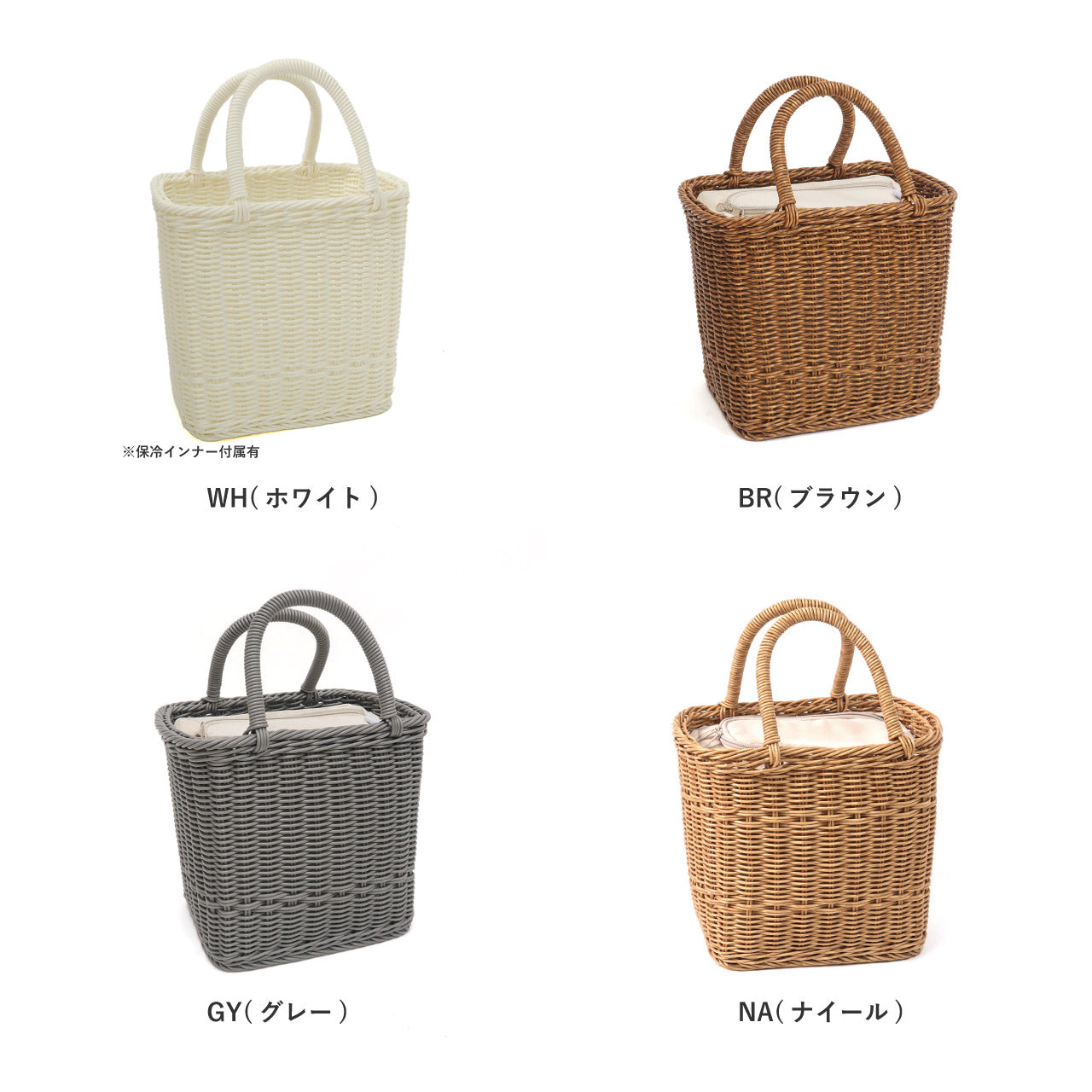 水洗いができる素材で編まれた保冷インナー付きバッグ。 WH(ホワイト)/BR(ブラウン)/GY(グレイ・WEB限定)の3カラーに、新色ナイールが仲間入りしました。 水に強い「PPラタン」素材を使って編まれたバッグと保冷インナーをセットにしました。 ドリンクや飲み物、お弁当などちょっとした荷物を運びやすいSサイズ。 保冷インナーを取り外して、バッグのみでのご使用も可能です。 ピクニックのランチやビーチやジムでの使用、普段のお買い物や野菜ストッカーなど様々な使い方ができるバッグです。 一回り大きいLサイズもあります。