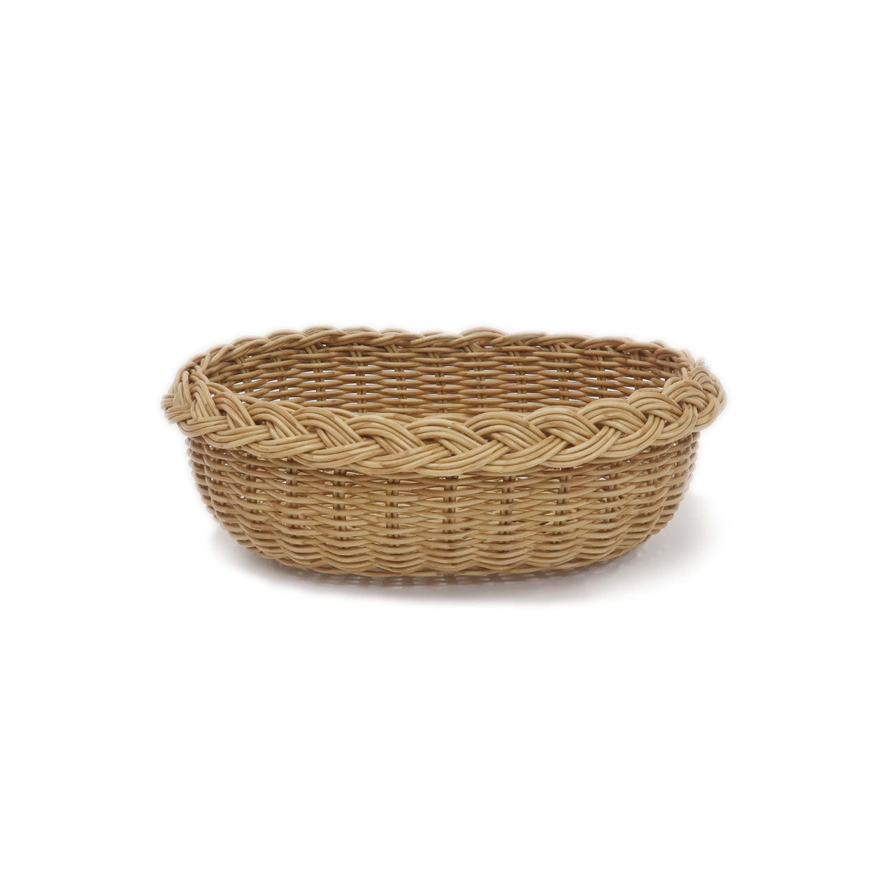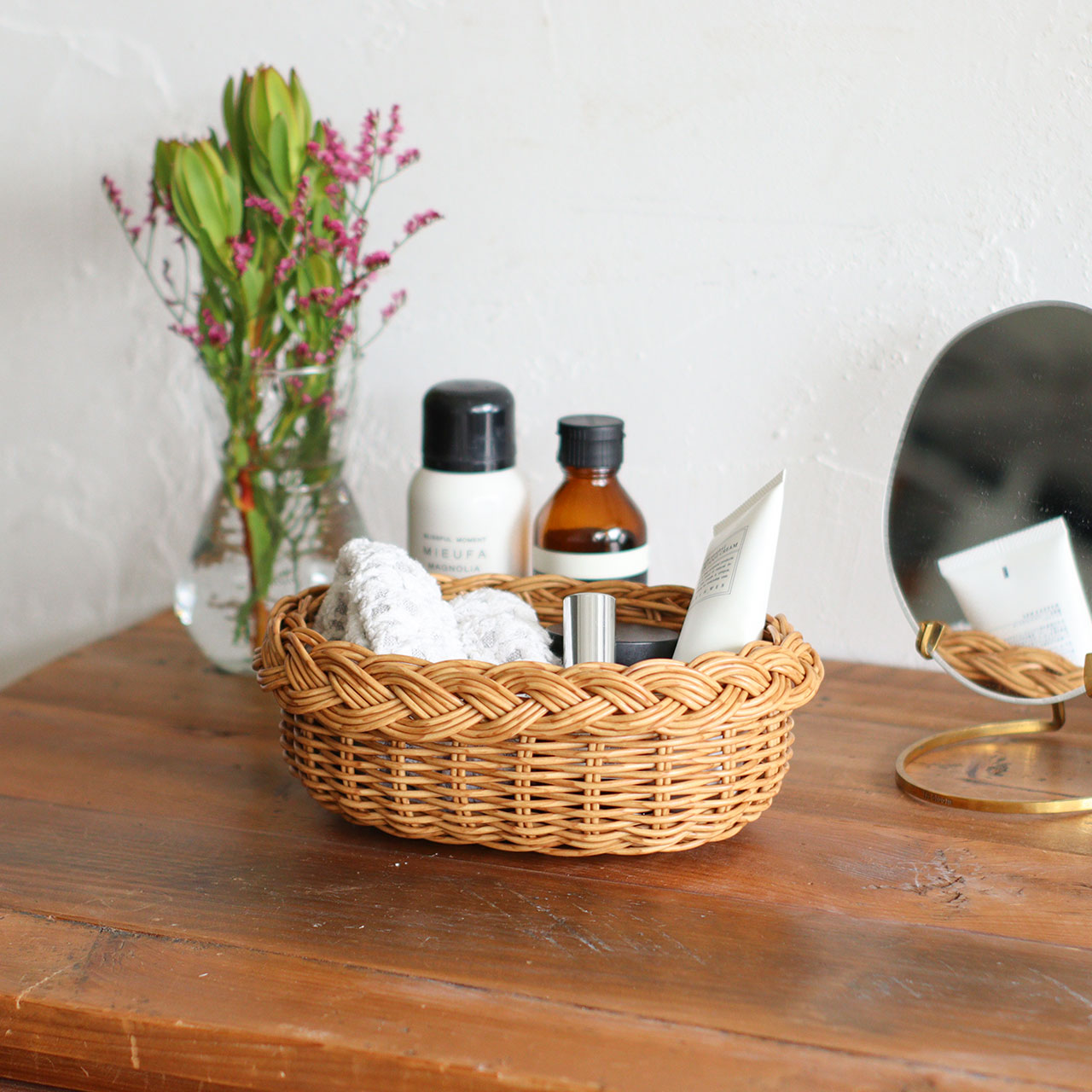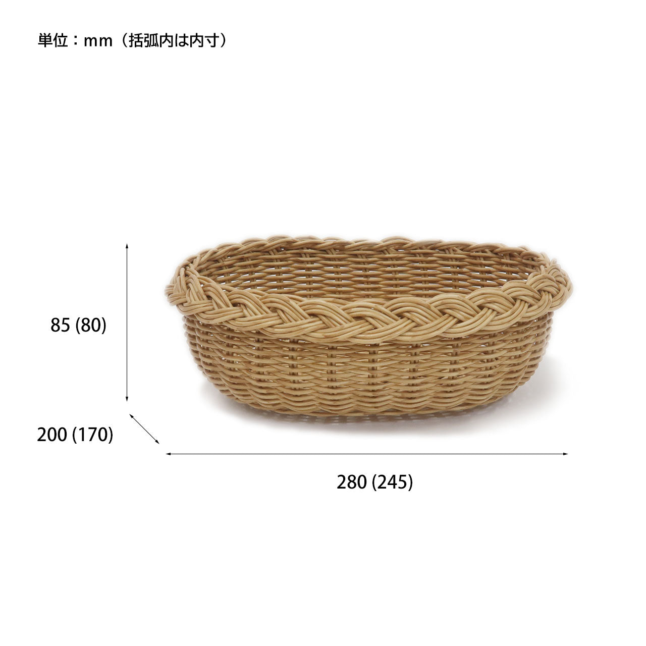 天然素材で編まれたような自然な温かみのあるバスケット。 オーバル型の小ぶりなバスケットは朝食のパンを入れてレンジであたためたり、 ちょっとしたお菓子の盛り合わせにも使えます。 Sサイズはコンパクトであまり底が深くない分、必要なものをサッと取り出しやすいので 毎朝使う化粧品やハンドクリームなどケア用品の収納にもおすすめのサイズ感です。Lサイズは果物もたっぷり入る大きさで、果物以外に 野菜かごやパン、お椀などを入れる食器かごにもお使いいただけます。 縁取りを加えることで素朴なかわいらしい印象に。 見える場所に置いていても絵になるデザインです。 よりナチュラルな雰囲気にこだわったナイールカラー。 同シリーズで揃えてご使用いただくと統一感が出ておすすめです。