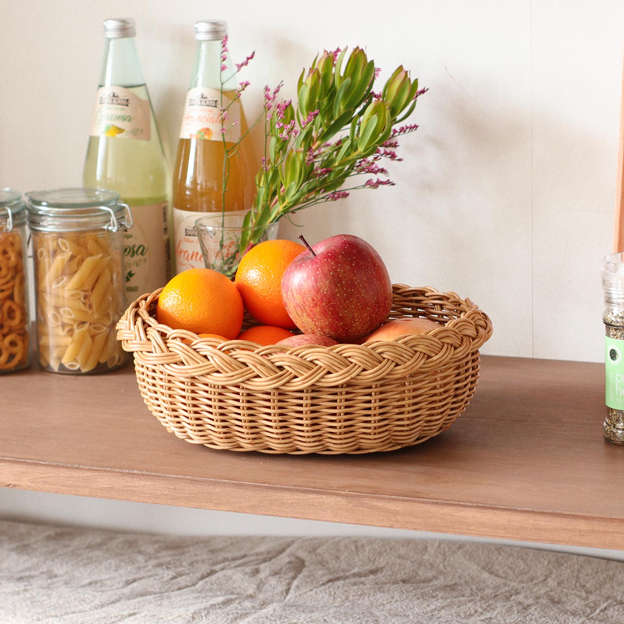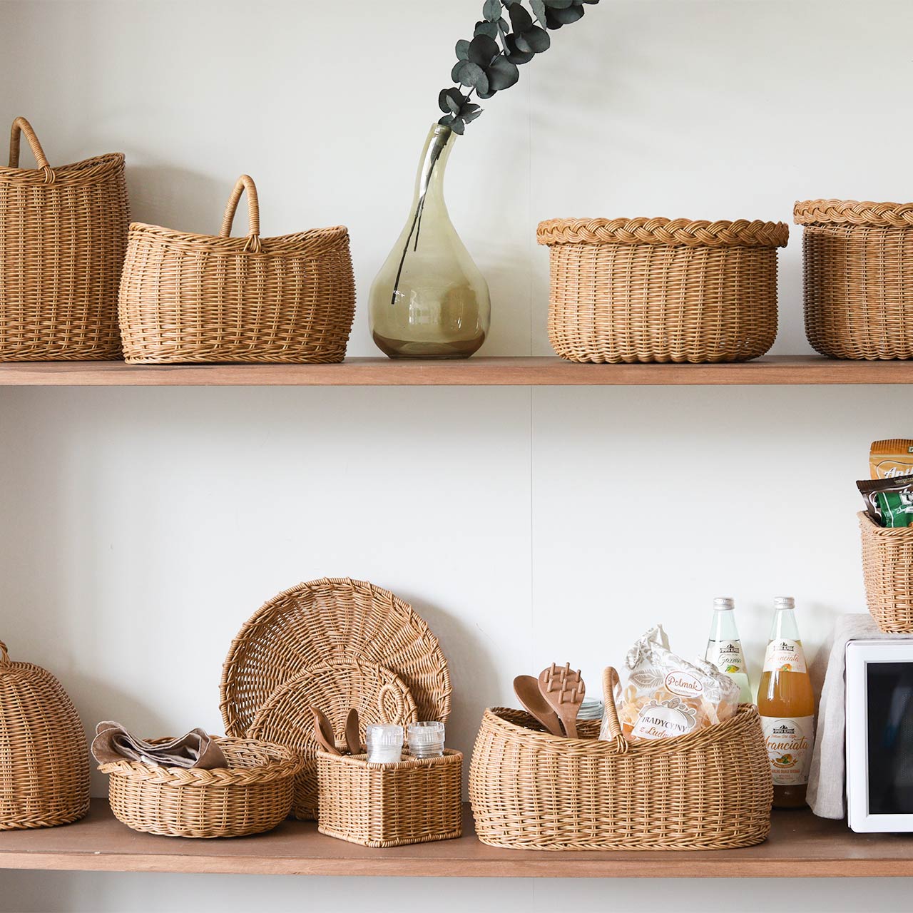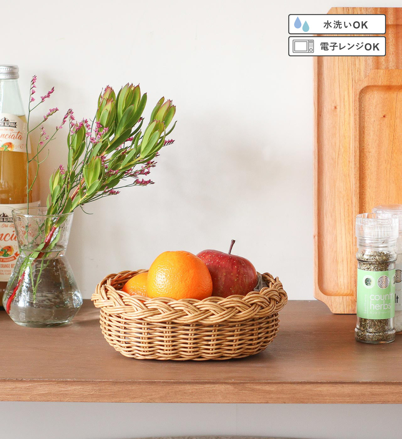 天然素材で編まれたような自然な温かみのあるバスケット。 オーバル型の小ぶりなバスケットは朝食のパンを入れてレンジであたためたり、 ちょっとしたお菓子の盛り合わせにも使えます。 Sサイズはコンパクトであまり底が深くない分、必要なものをサッと取り出しやすいので 毎朝使う化粧品やハンドクリームなどケア用品の収納にもおすすめのサイズ感です。Lサイズは果物もたっぷり入る大きさで、果物以外に 野菜かごやパン、お椀などを入れる食器かごにもお使いいただけます。 縁取りを加えることで素朴なかわいらしい印象に。 見える場所に置いていても絵になるデザインです。 よりナチュラルな雰囲気にこだわったナイールカラー。 同シリーズで揃えてご使用いただくと統一感が出ておすすめです。