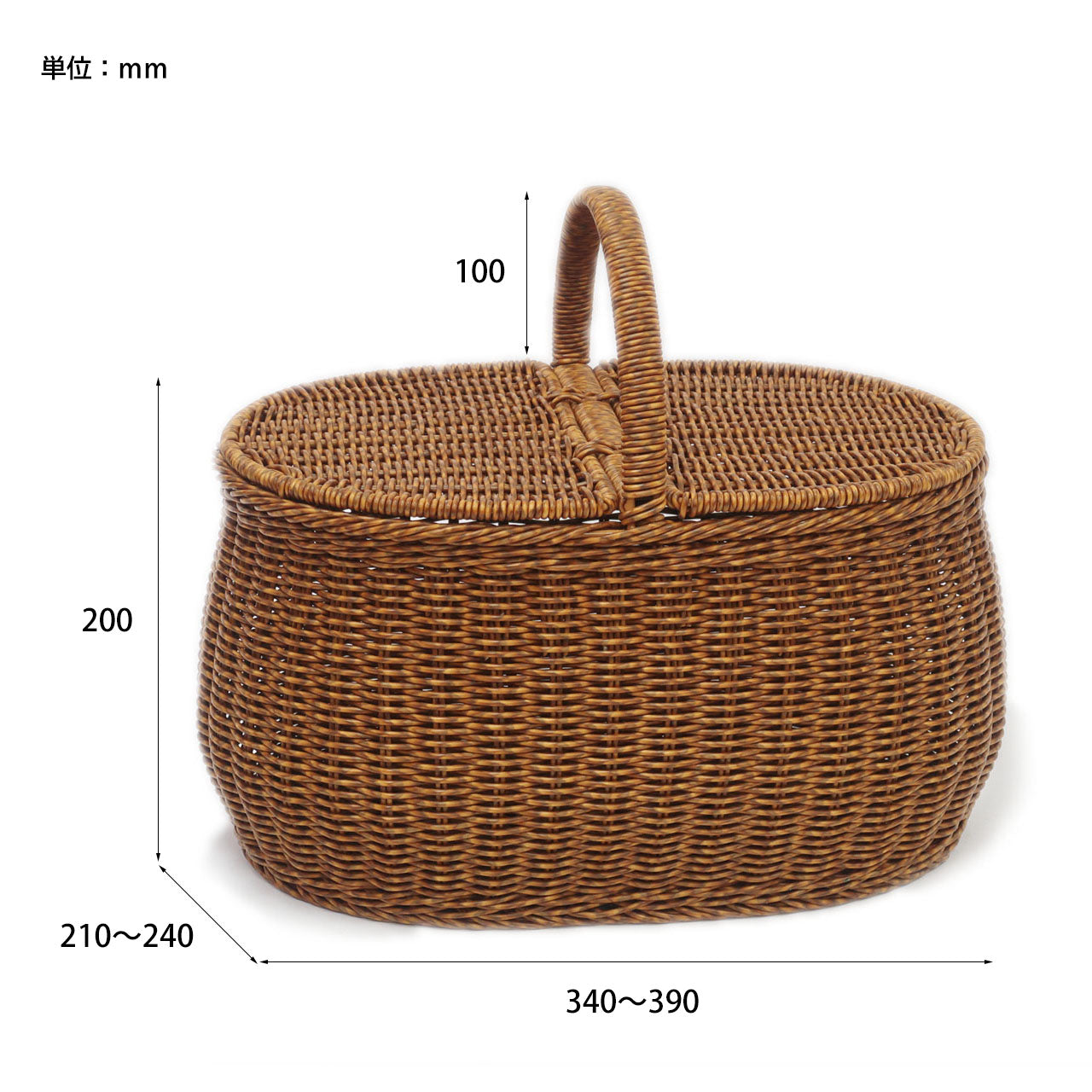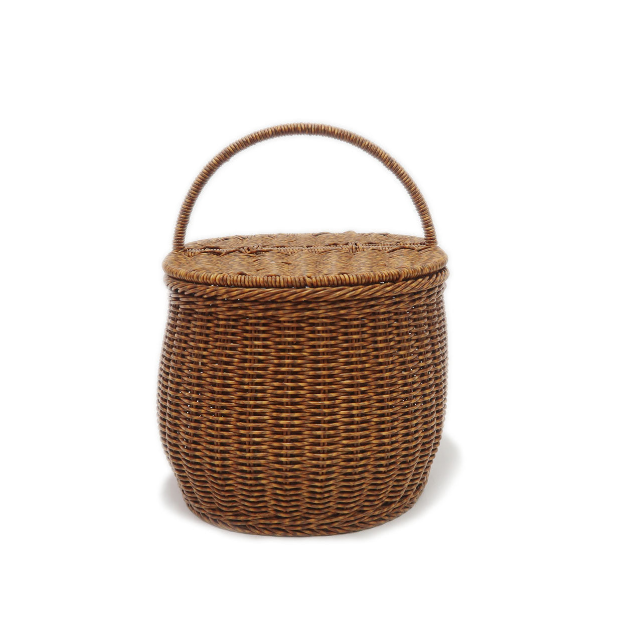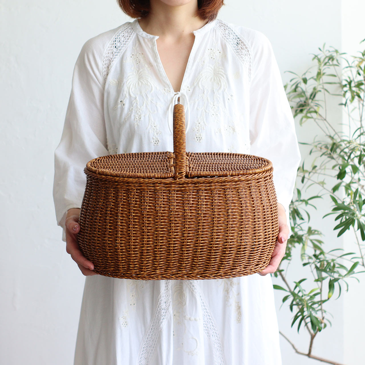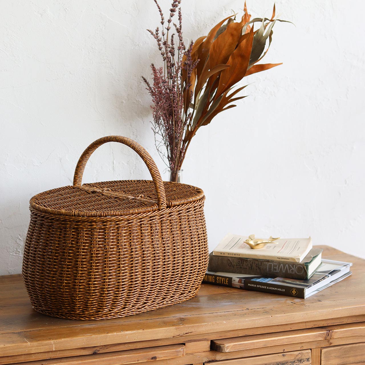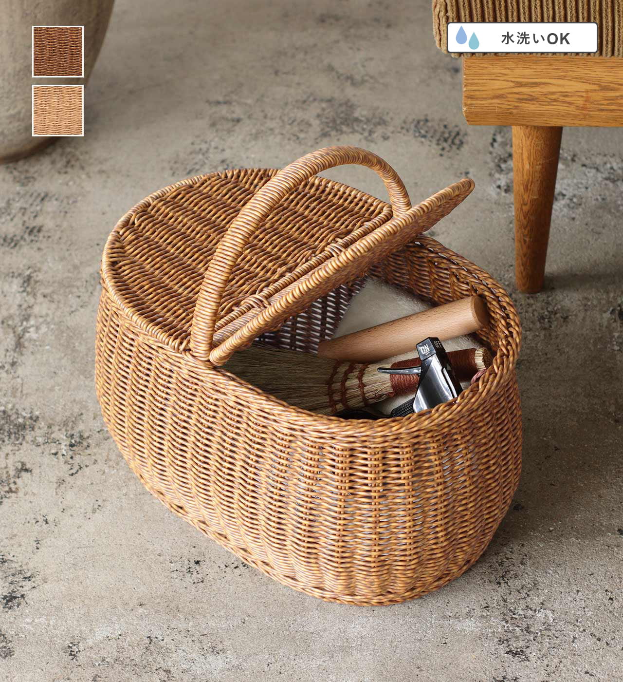 オーバル型のフタ付きワンハンドルバスケット。水に強いポリプロピレン・ポリエチレンチューブを使って手作業で編まれたバスケットです。膨らみのあるころんとしたかわいらしいフォルム。ランチを入れてお出かけに連れていったり、家の中では掃除道具や日用品などの小物収納に役立ちます。幅約39cm、高さ約20cmの余裕のあるサイズ感。フタは両方から開くので取り出しやすく、化粧品やボトル系のクリームをまとめて収納したり、おむつのストックや おもちゃなどを収納しつつさっと持って移動できる便利な形です。日用品のほか、ゲーム機や充電器のケーブル類など隠したい物の収納にもおすすめです。天然素材のようなナチュラル雰囲気を持ちつつ、使いやすさも大切にしたバスケットです。