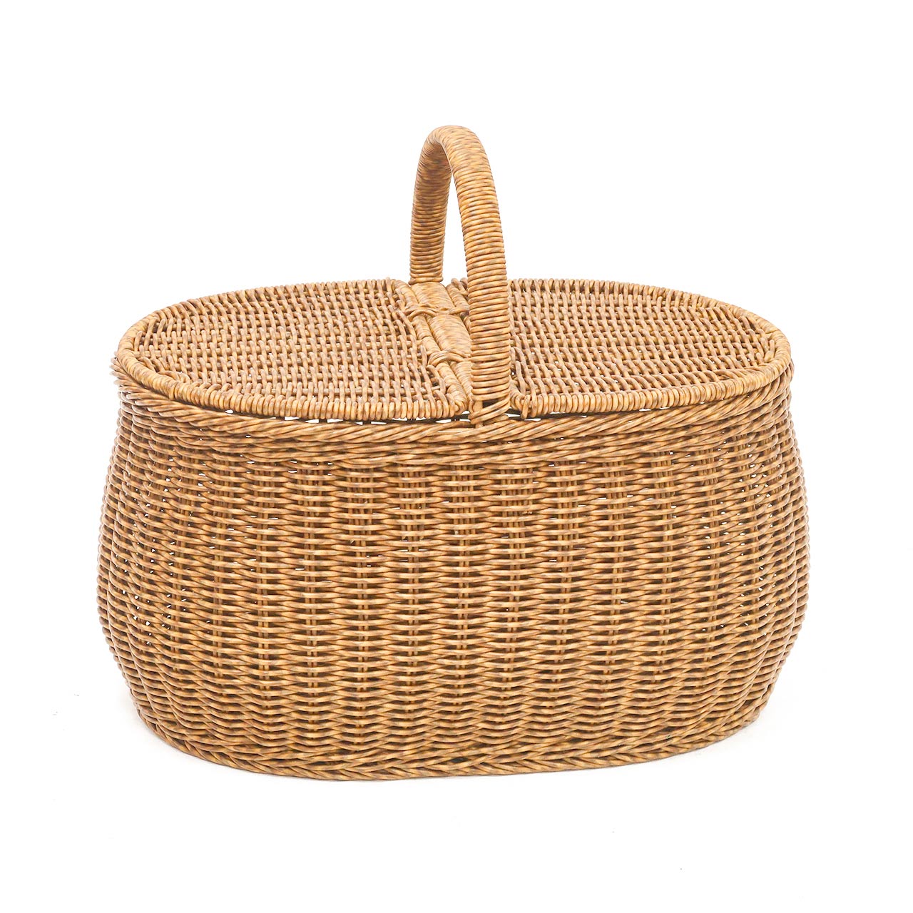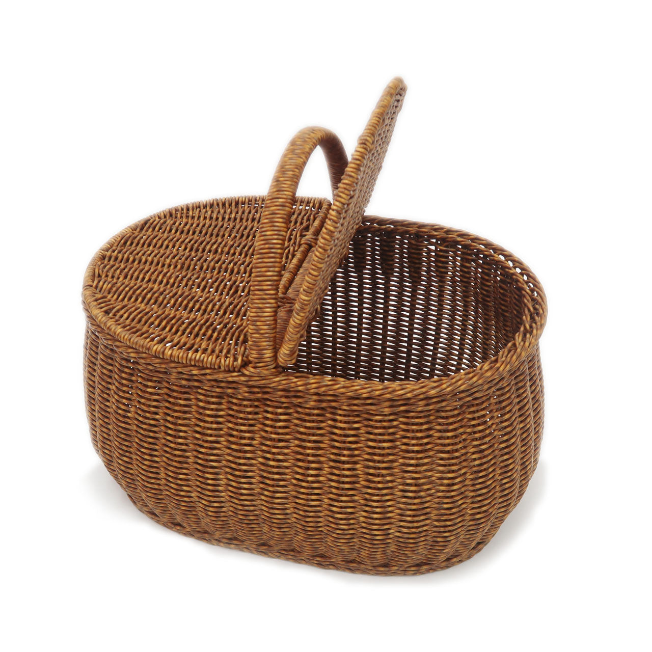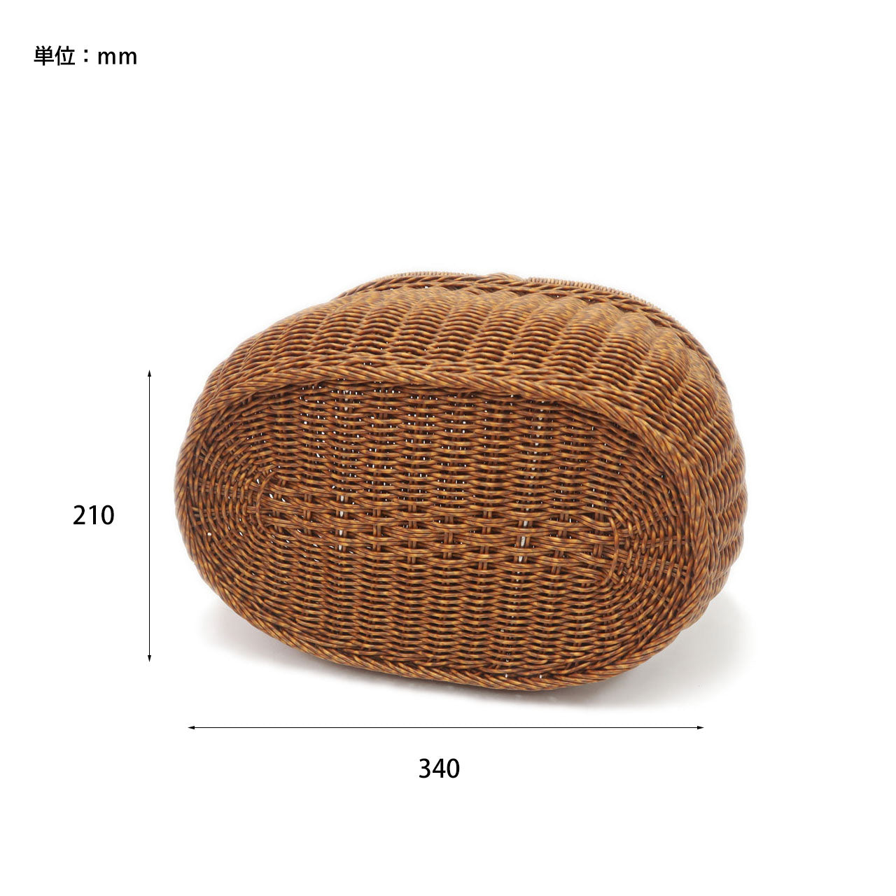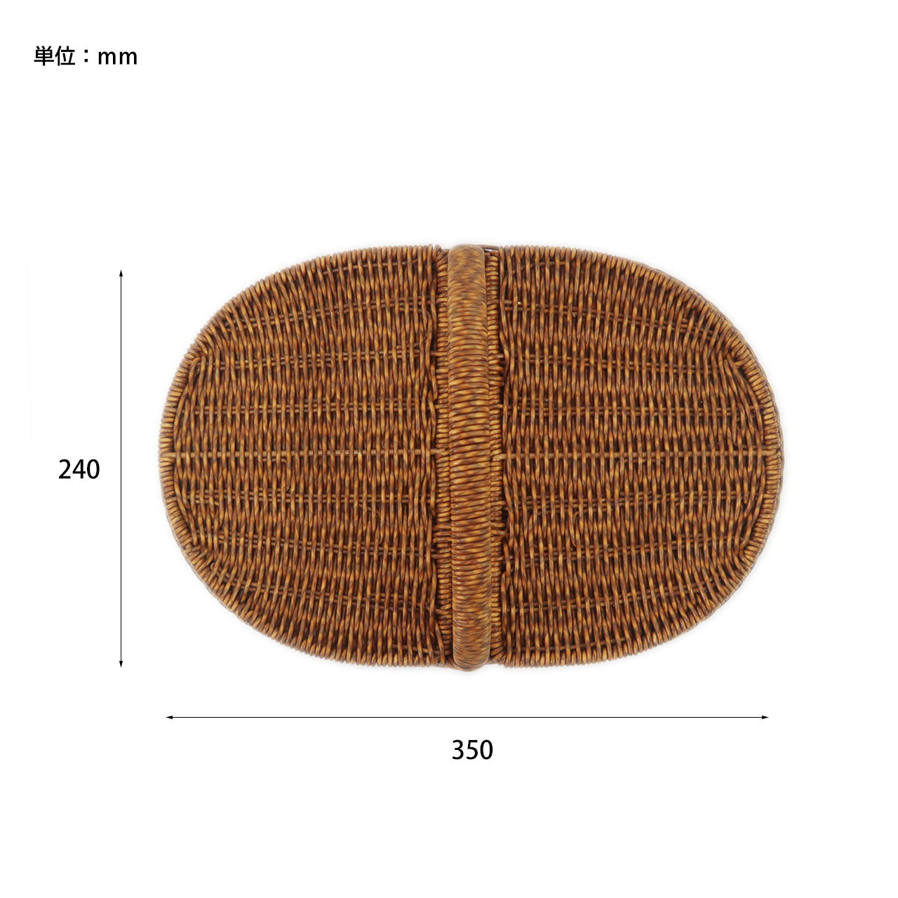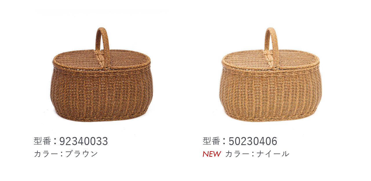 オーバル型のフタ付きワンハンドルバスケット。水に強いポリプロピレン・ポリエチレンチューブを使って手作業で編まれたバスケットです。膨らみのあるころんとしたかわいらしいフォルム。ランチを入れてお出かけに連れていったり、家の中では掃除道具や日用品などの小物収納に役立ちます。幅約39cm、高さ約20cmの余裕のあるサイズ感。フタは両方から開くので取り出しやすく、化粧品やボトル系のクリームをまとめて収納したり、おむつのストックや おもちゃなどを収納しつつさっと持って移動できる便利な形です。日用品のほか、ゲーム機や充電器のケーブル類など隠したい物の収納にもおすすめです。天然素材のようなナチュラル雰囲気を持ちつつ、使いやすさも大切にしたバスケットです。