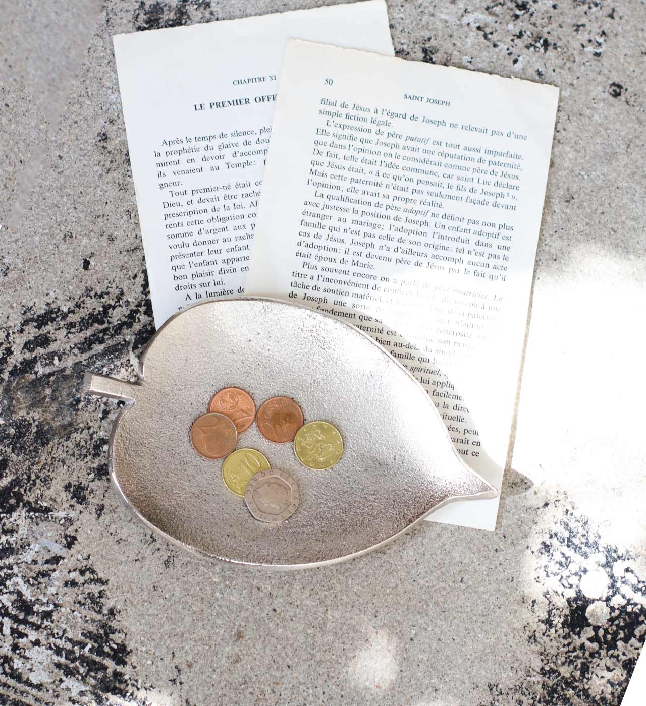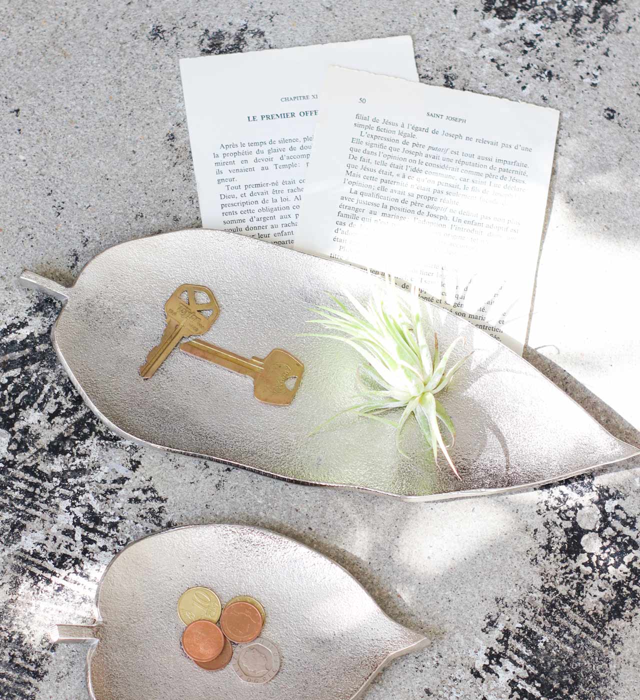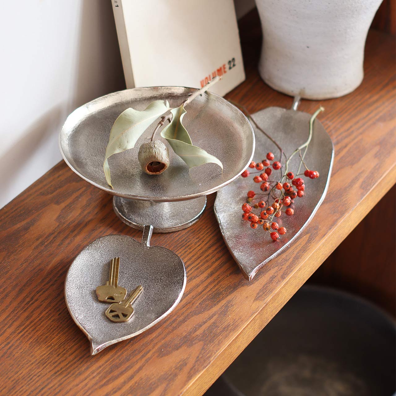 アルミ本来のシルバー色を活かしたハンドメイドのアルミトレイ。 『再生・成長・希望・信頼』などの意味を持つといわれるリーフモチーフです。 アルミ本来のシルバー色を活かしたサントリナシリーズ。 クールなアルミの輝きがお気に入りのアクセサリーや小物をより引き立ててくれます。 SとLの2サイズ。横に長いLサイズは御香立てと合わせて香皿としてもお使いいただけます。 毎日つけるアクセサリー置き場やペンなどを置くデスクトレイとして、ちょっとしたギフトにもおすすめのインテリアトレイです。
