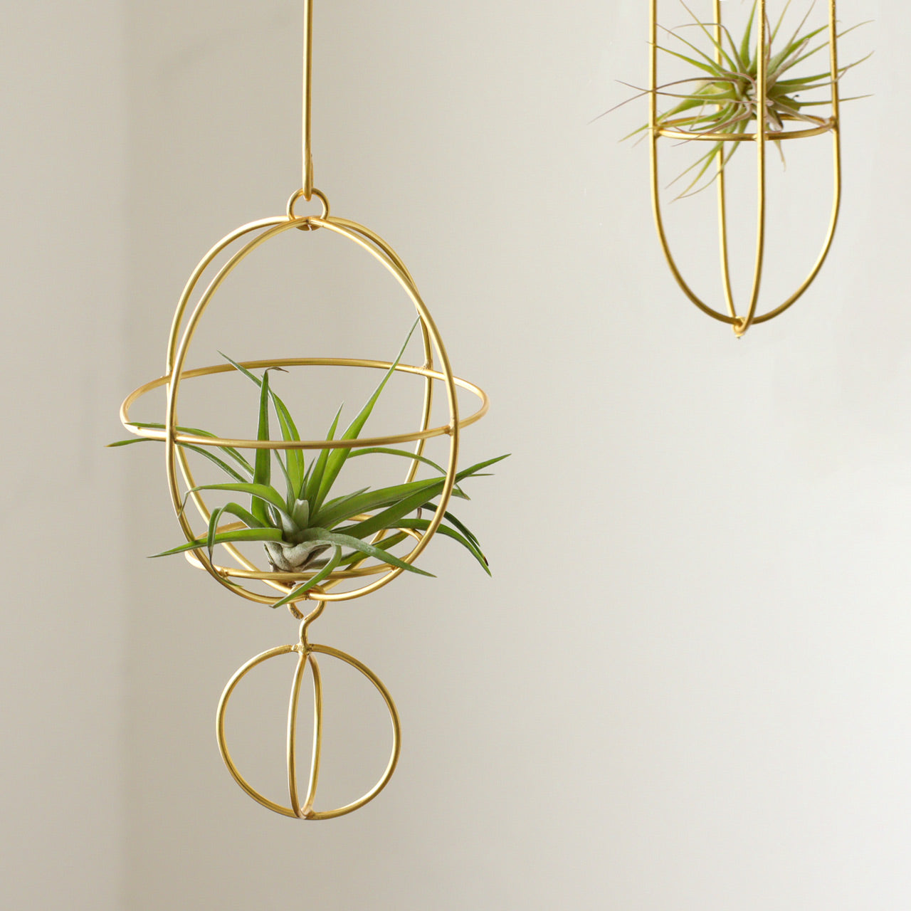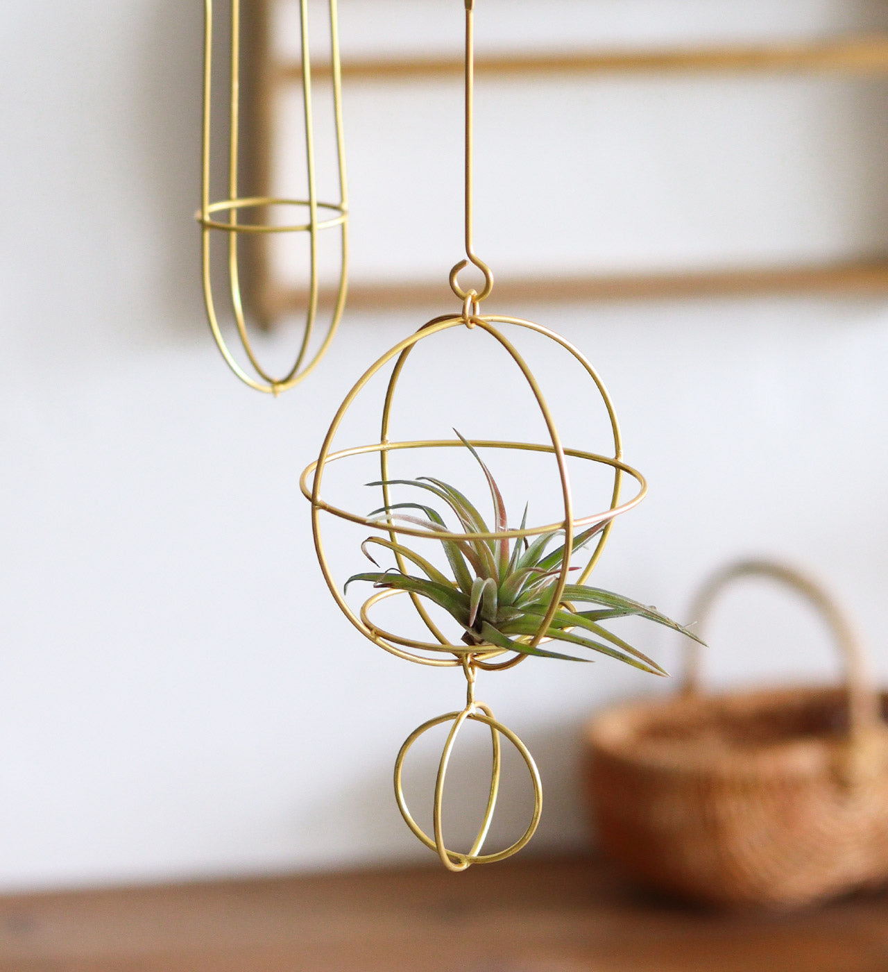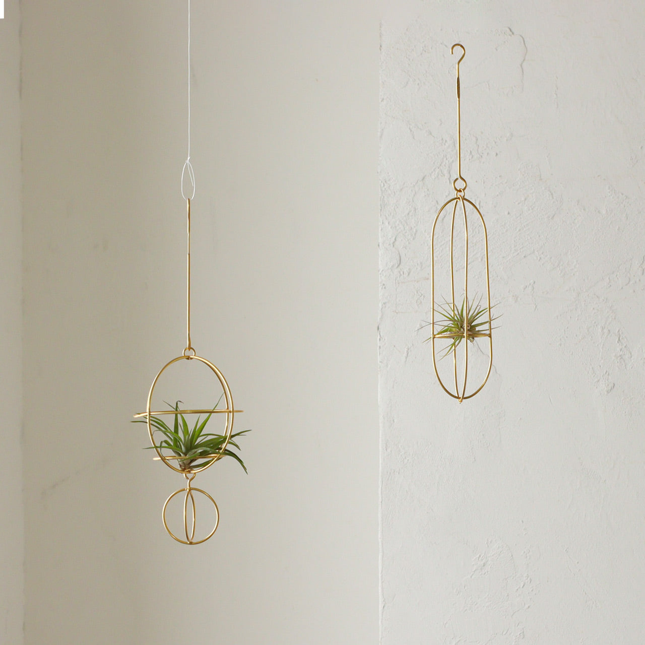 エアプランツがすっぽり収まるようにデザインされたラウンドオーナメント。引き延ばしたような形が特徴のロングタイプ。円形のパーツを組み合わせた2連タイプ。エアプランツやドライフラワーの置き場所にぴったりです。そのままオーナメントとして飾ったり、お気に入りのアクセサリーを飾っても◎先端はフックになっているので、カーテンレールやS字フックと組み合わせて気軽に飾っていただけます。天井から吊るして揺れる様子を楽しんだり、空間をおしゃれに彩ることができるアイテムです。