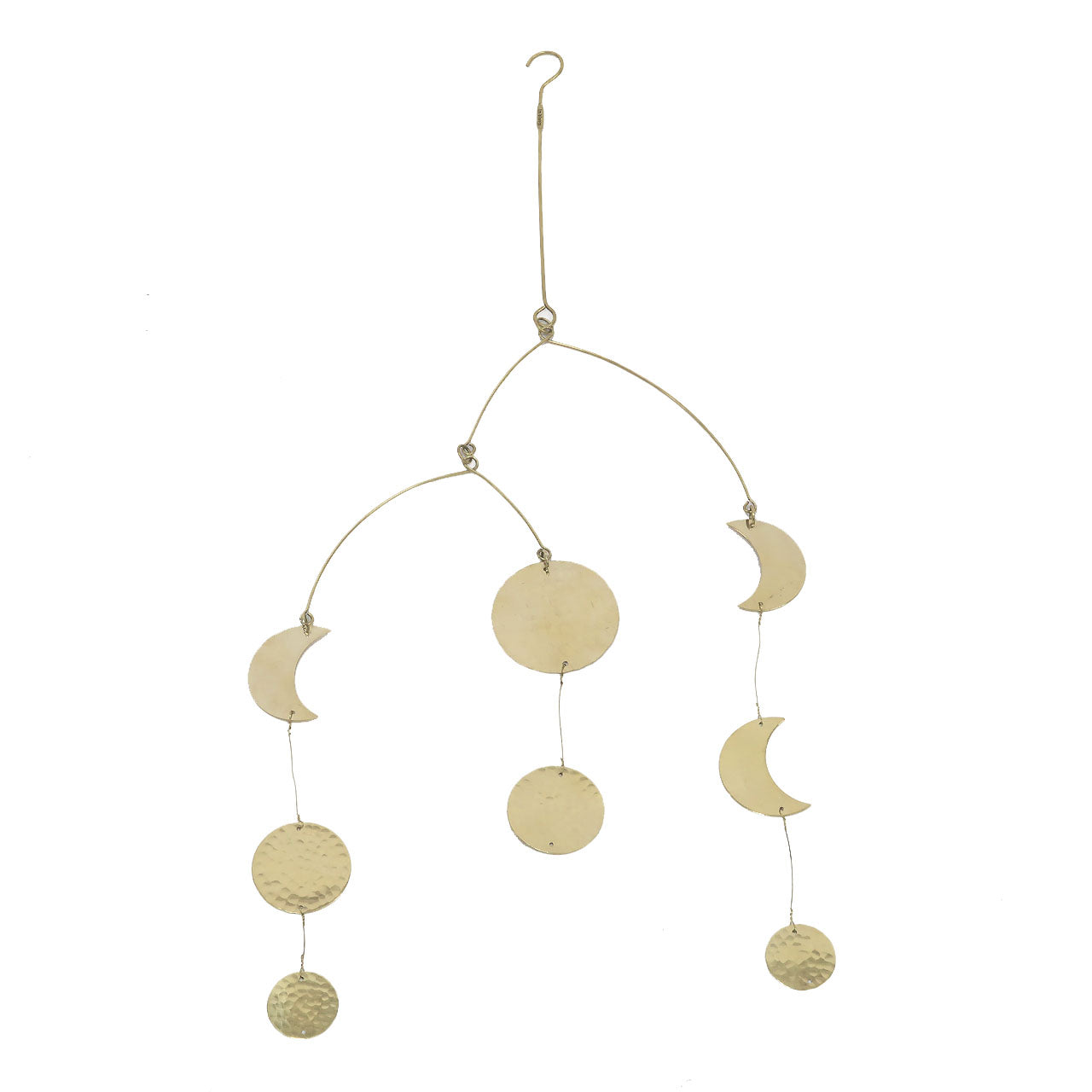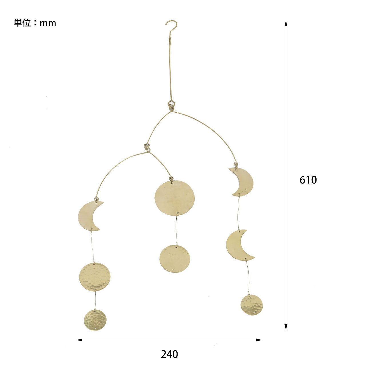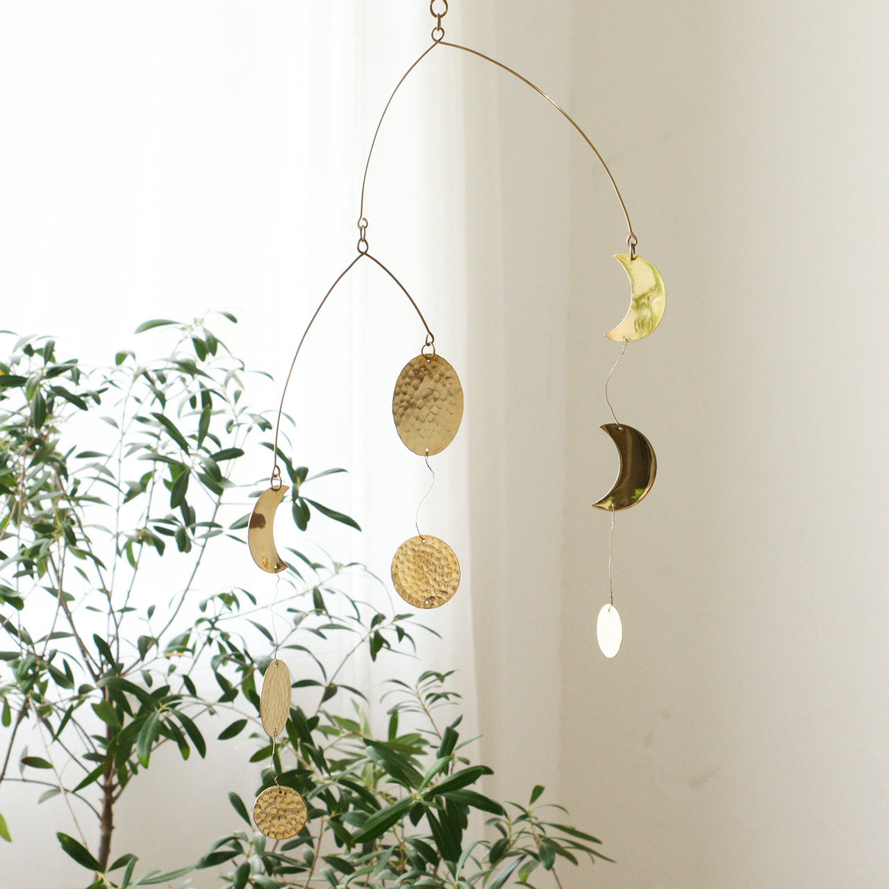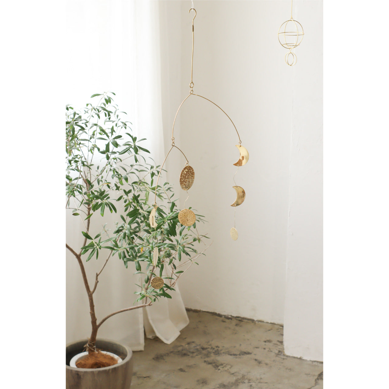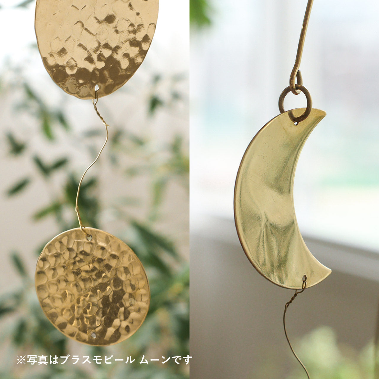 お部屋を彩る真鍮性のモビール。月の満ち欠けをモチーフにしたムーンタイプ、丸や三角などのモチーフをつなげたマルチタイプの2タイプ。風合いあふれる鎚目(つちめ)模様はハンドメイドならではの魅力の一つ。無塗装仕上げのため黒くくすんでいきますが、経年変化として時間の経過をお楽しみください。先端はフックになっているので、カーテンレールやS字フックと組み合わせて 気軽に飾っていただけます。天井から吊るして揺れる様子を楽しんだり、空間をおしゃれに彩ることができるアイテムです。揺れる様子を眺めながらゆったりとした時間をお過ごしください。