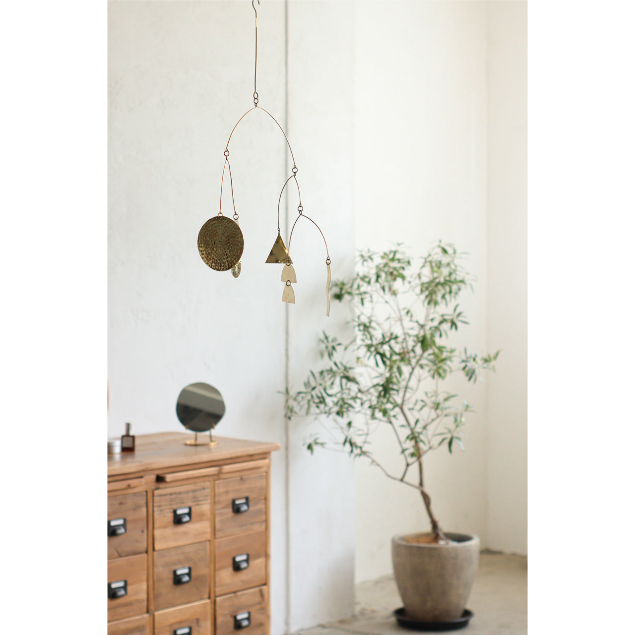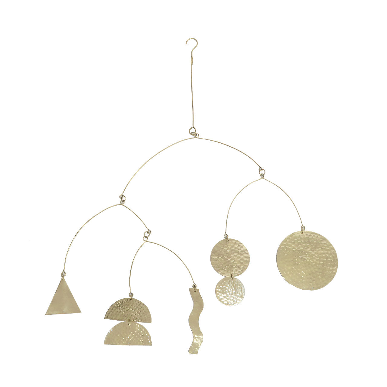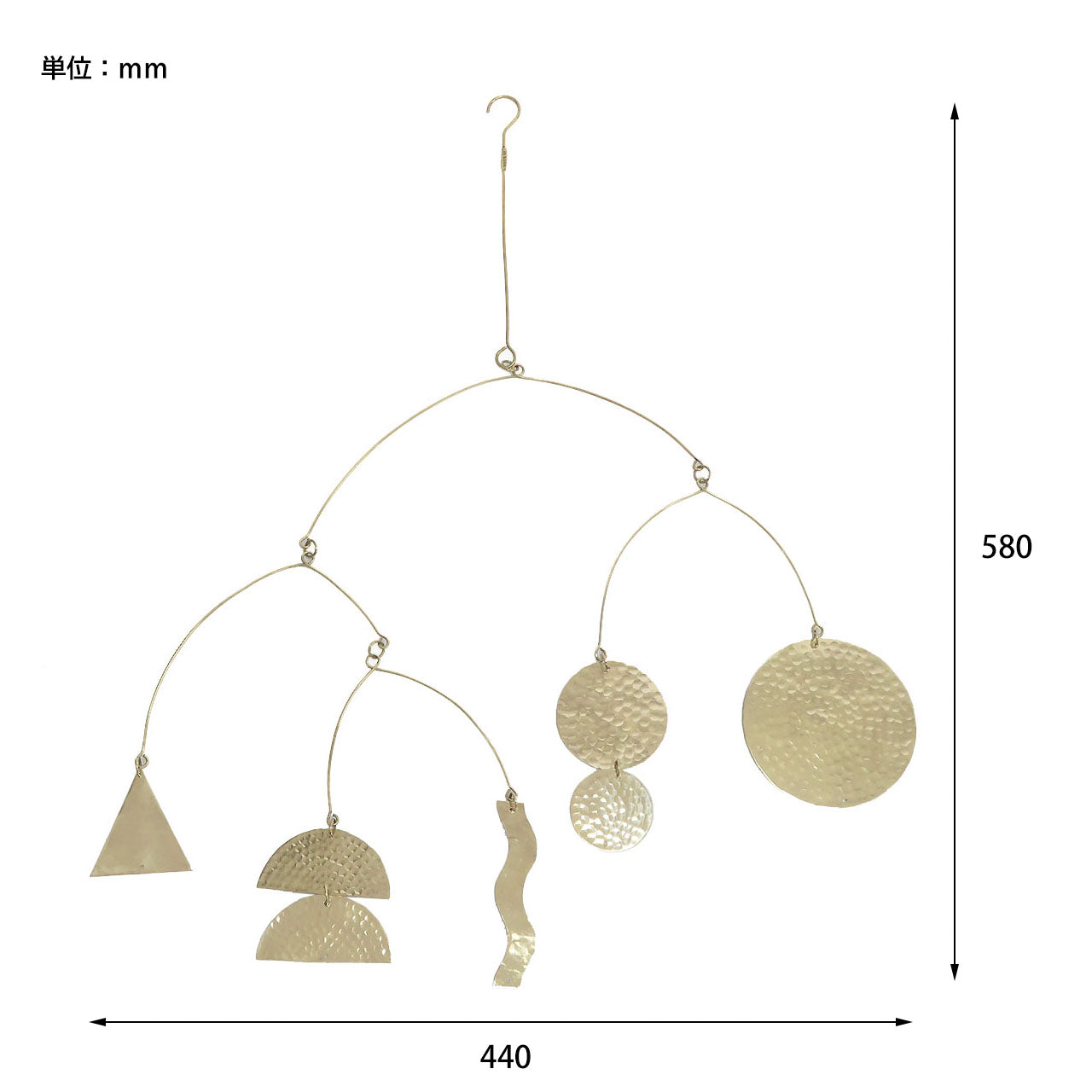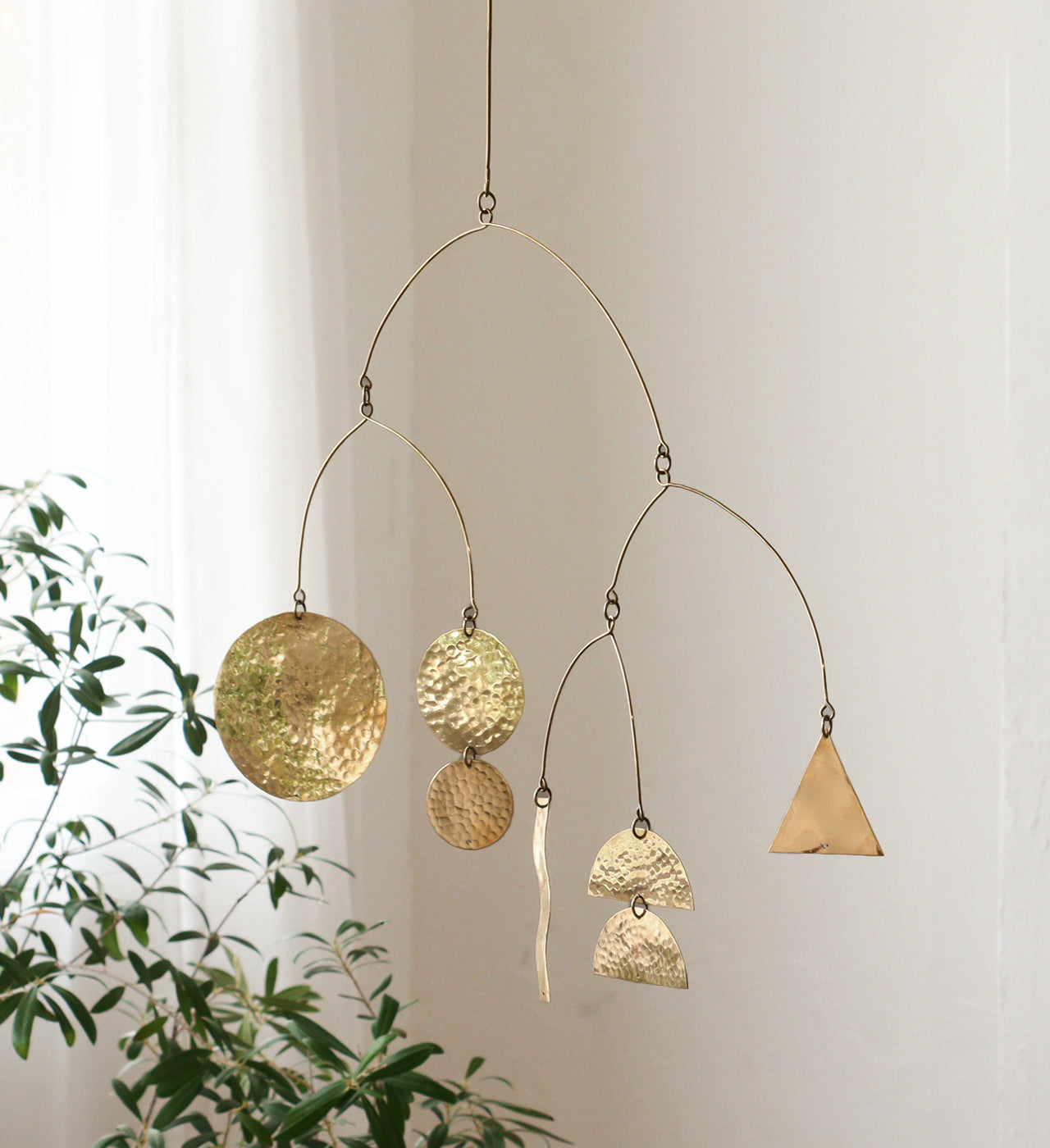 お部屋を彩る真鍮性のモビール。月の満ち欠けをモチーフにしたムーンタイプ、丸や三角などのモチーフをつなげたマルチタイプの2タイプ。風合いあふれる鎚目(つちめ)模様はハンドメイドならではの魅力の一つ。無塗装仕上げのため黒くくすんでいきますが、経年変化として時間の経過をお楽しみください。先端はフックになっているので、カーテンレールやS字フックと組み合わせて 気軽に飾っていただけます。天井から吊るして揺れる様子を楽しんだり、空間をおしゃれに彩ることができるアイテムです。揺れる様子を眺めながらゆったりとした時間をお過ごしください。