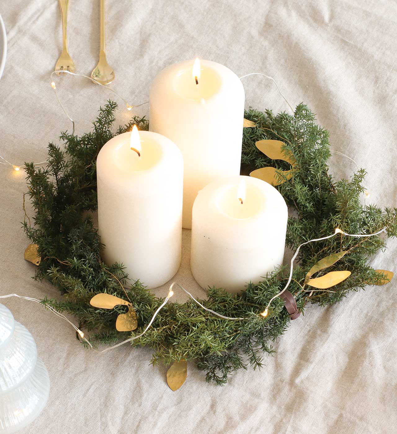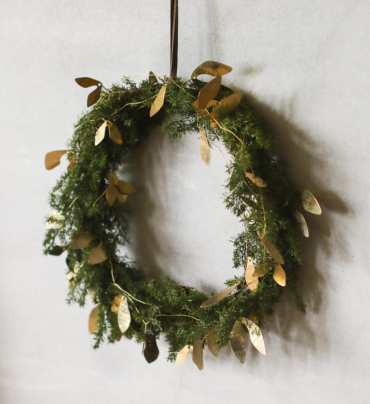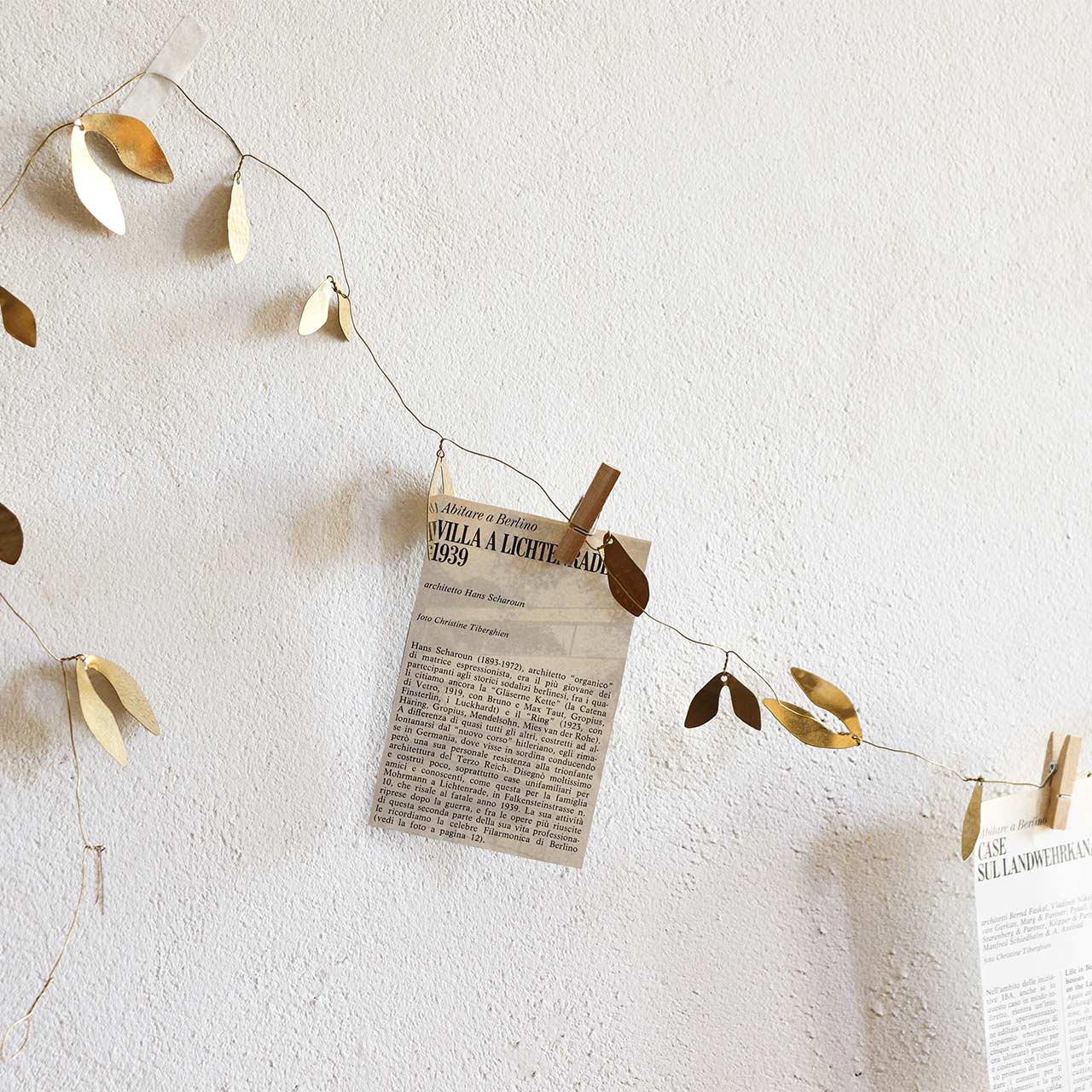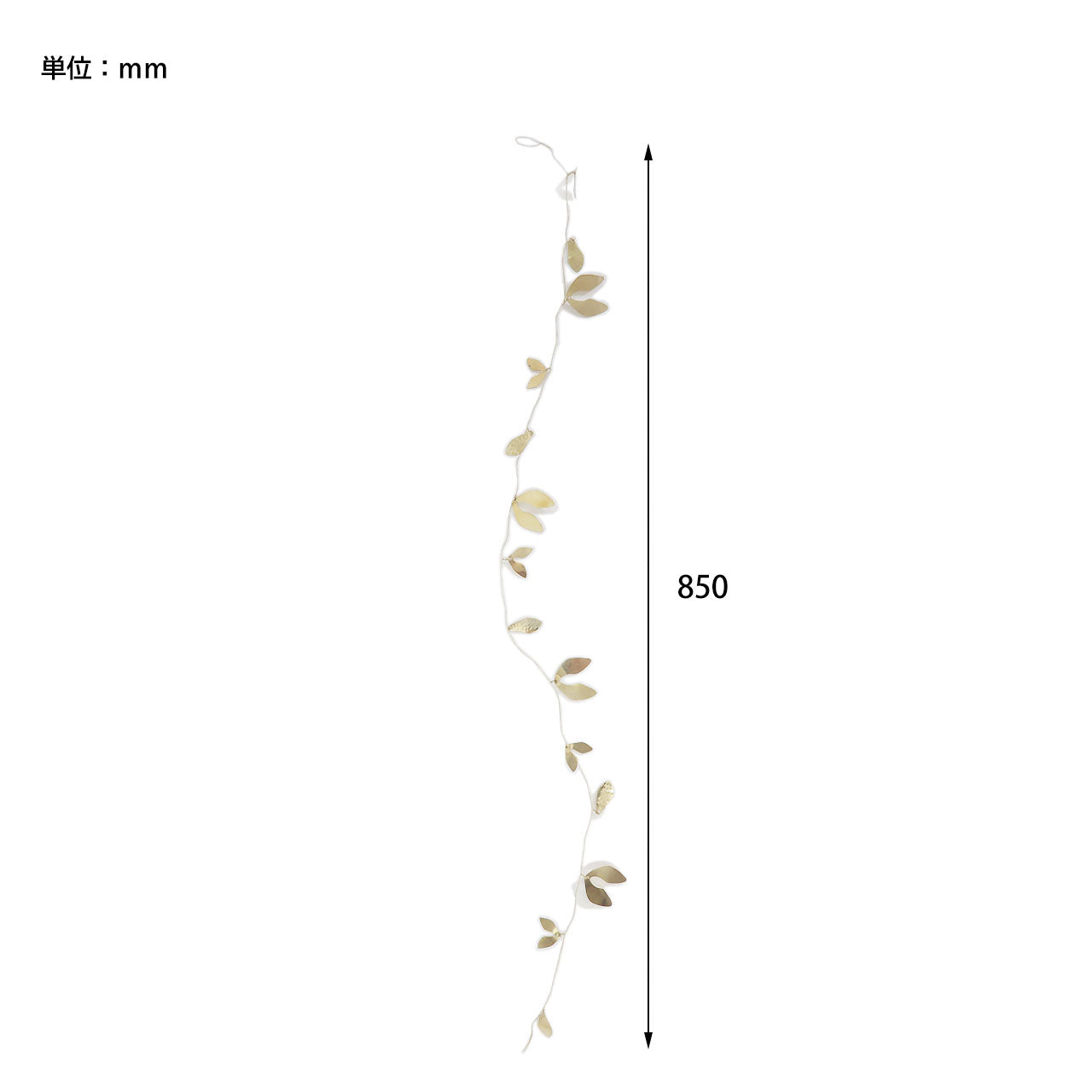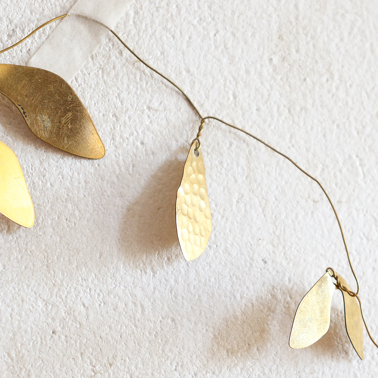 いろいろな飾り方を楽しめるリーフモチーフのガーランド。長さが異なるSとLの2サイズ。細い針金で出来たガーランドなのでくるくる丸めてリースのようにしたり、好きな場所から吊るしたり自由にディスプレイを楽しめます。モチーフの中には槌目(つちめ)と呼ばれる表面加工を施したパーツも含まれており、ちょっとしたディテールの違いにもこだわりました。光沢があり高級感のある真鍮素材は、経年変化によりヴィンテージ感のある色味に変化していきます。風合いの変化も真鍮素材ならではの味わいとしてお楽しみください。伸ばした状態で壁に留めれば、お気に入りのポストカードのディスプレイにも。通年飾れるシンプルなモチーフ。冬はキャンドルやリースと合わせると素敵なクリスマスのディスプレイに。