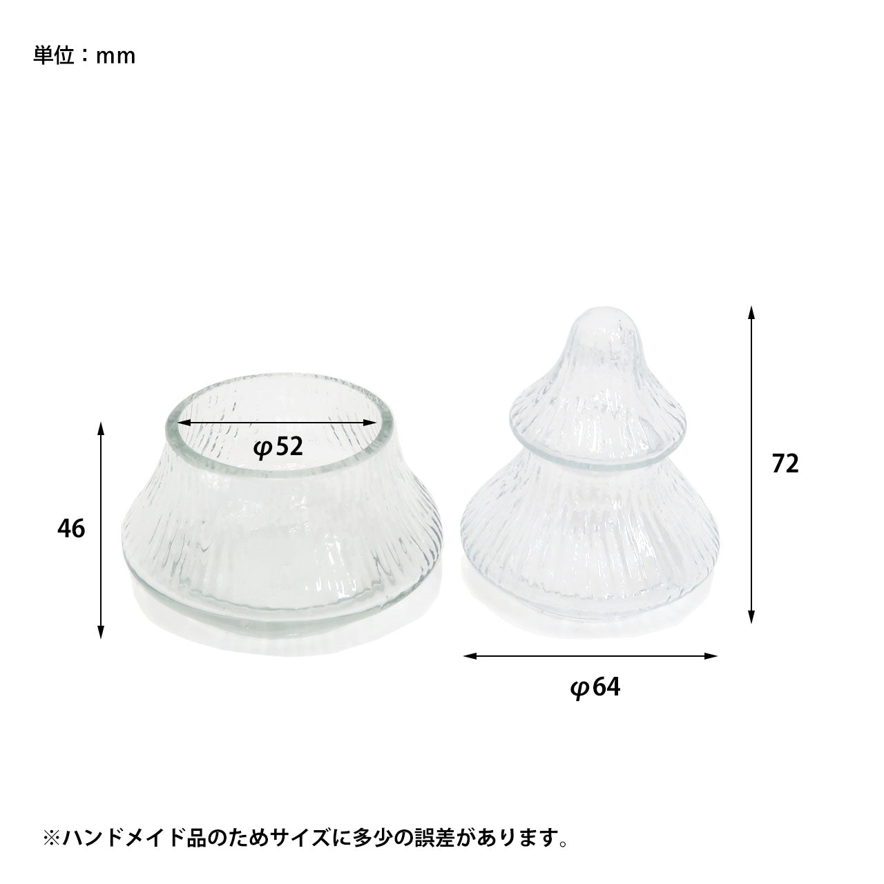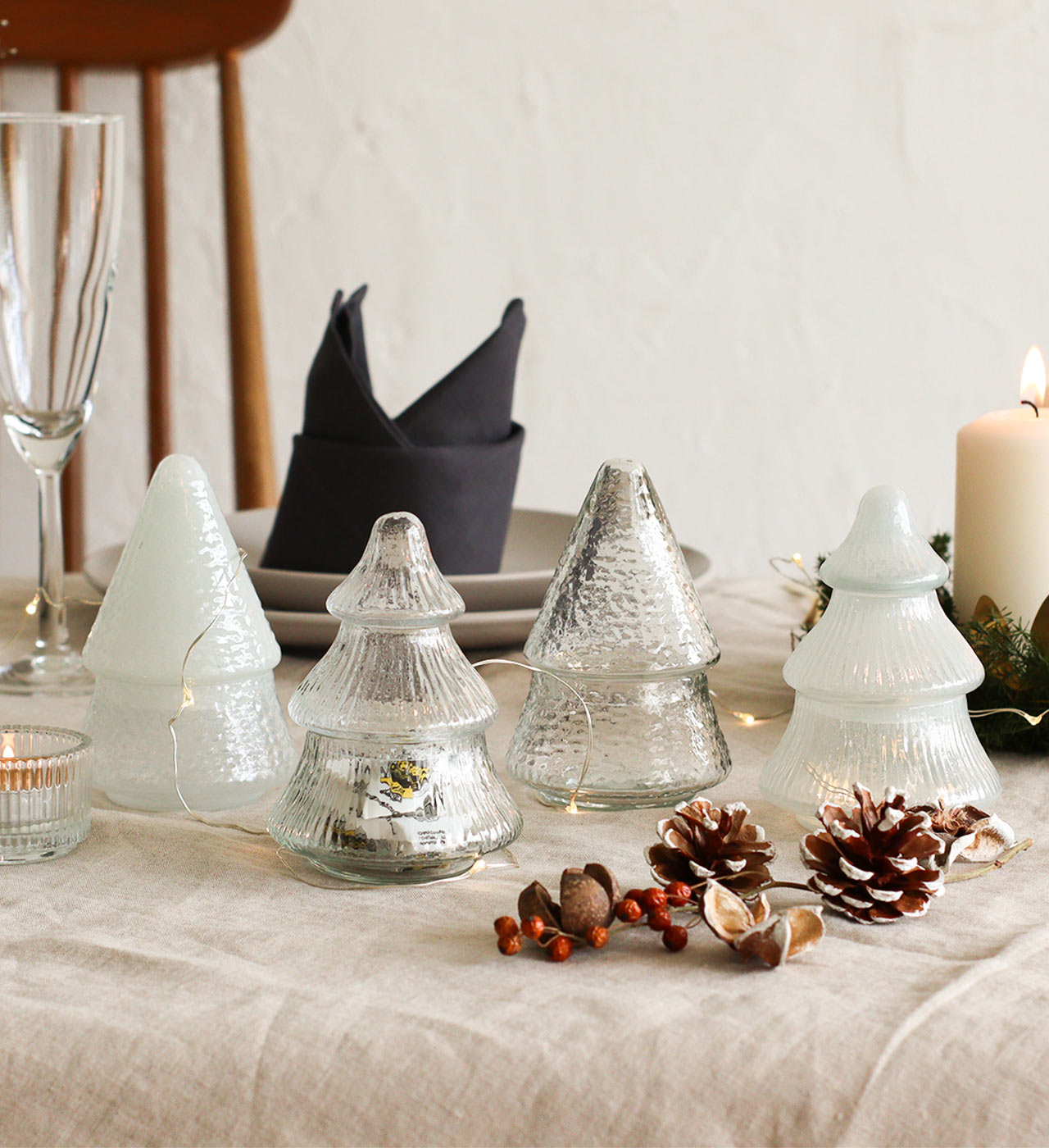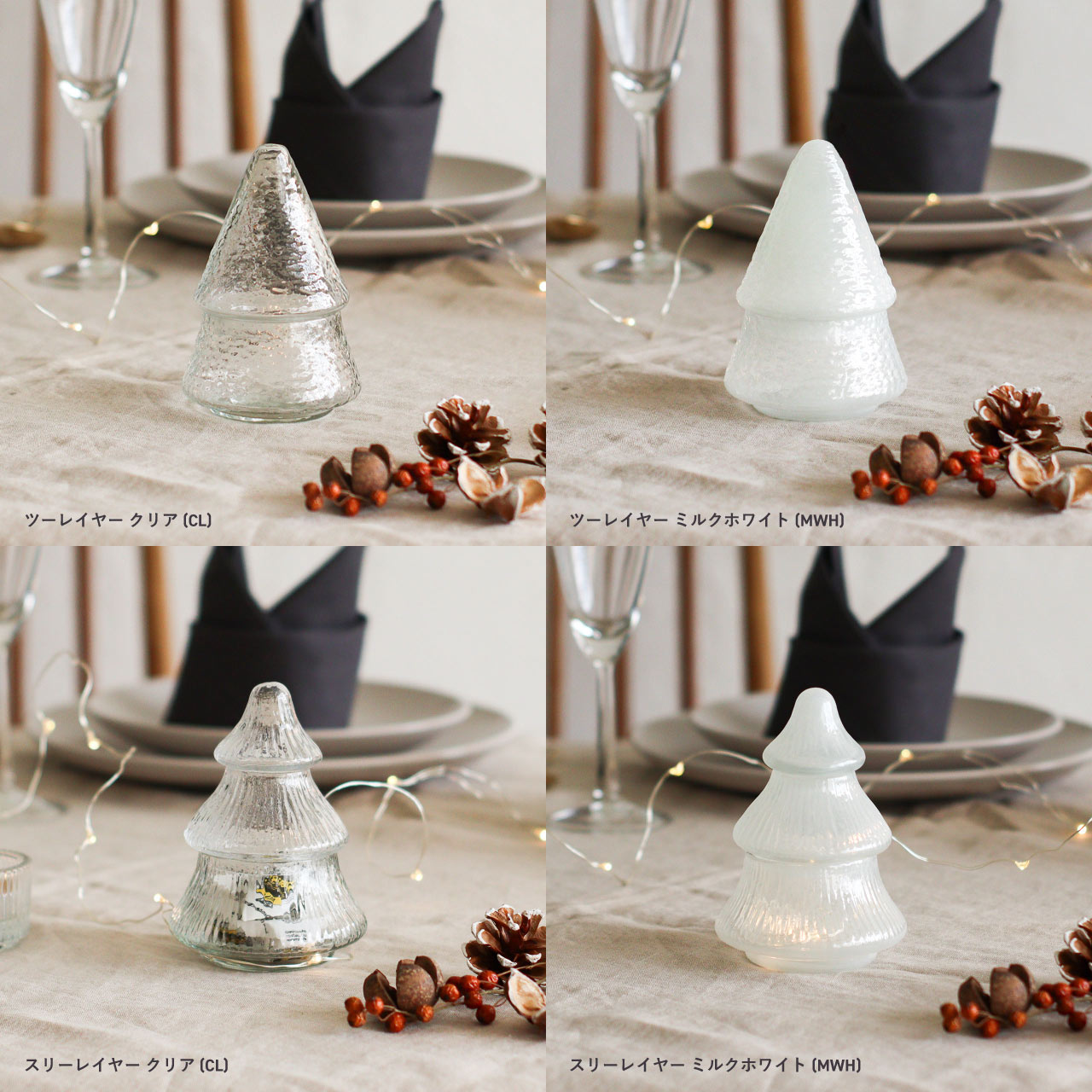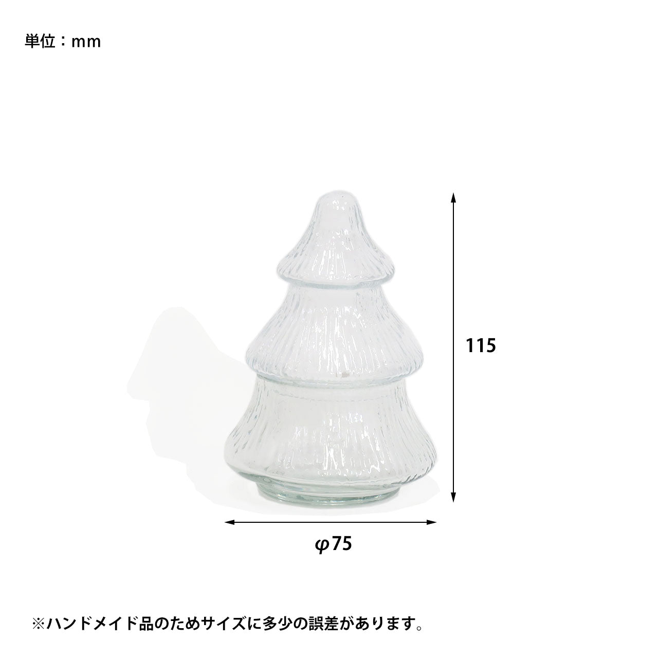 小物入れにもなるガラス製のツリーモチーフキャニスター。ガラスの表面の凹凸がキラキラと光を反射する、繊細な印象のガラスキャニスターです。オブジェとして楽しみながら、お気に入りのアクセサリーやクリップなど小物の収納に年中お使いいただけます。LEDランプやLEDキャンドルを中に入れると、キャンドルのような暖かな雰囲気に。2種類のデザインと2つのカラー「クリア(CL)」「ミルクホワイト(MWH)」をご用意しました。複数並べていただくと、より雰囲気が出ておすすめです。【形やサイズ・色味について】ハンドメイド品のため、形やサイズ・色味に個体差がございます。製品の特徴として予めご了承ください。また、できるだけ実物の色に近くなるように努めていますが、お使いの環境(モニター、ブラウザ等)の違いにより、 色の見え方が実物と若干異なる場合がございます。