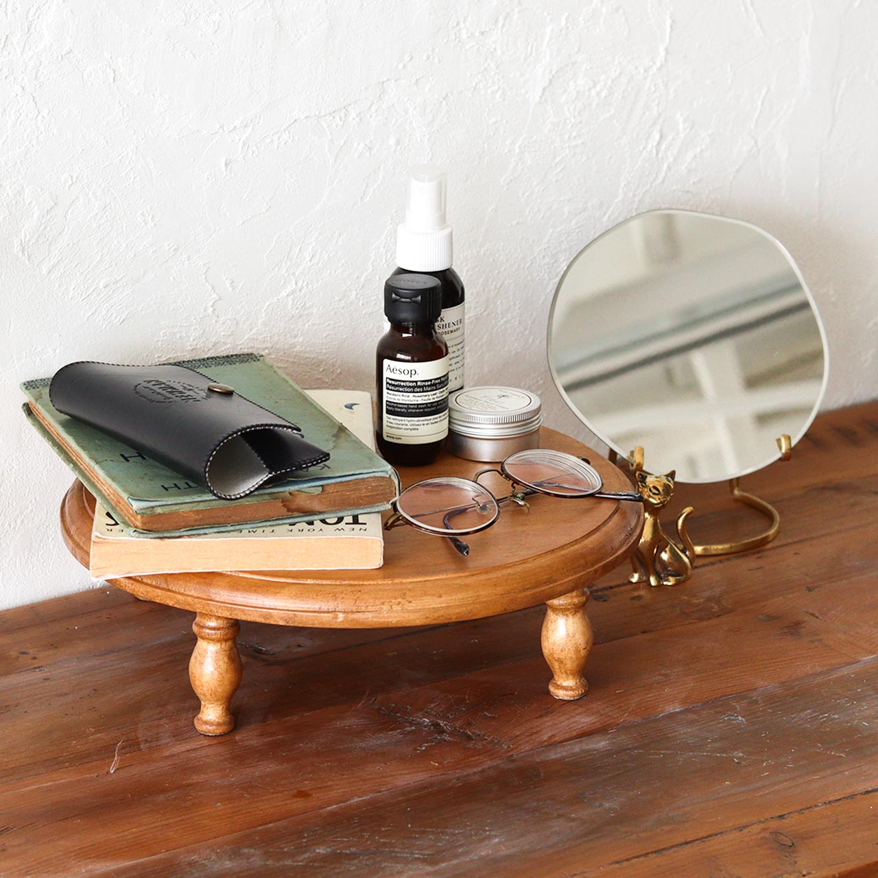 ディスプレイの幅が広がる円形のアンティーク風スタンド。デスクや棚の上に置くだけで お気に入りのアクセサリーやオブジェをお店のようにディスプレイできるスタンドです。キズを予防するフェルトシールを貼った状態でお届けします。また、素材には軽いパイン材を使用しており、アンティークのような重厚感を出すために一つ一つ手作業で塗装を行っています。※天然木を使用しているため、木目や節の出方、色合いに個体差があります。予めご了承ください。少し脚の長いSサイズはお気に入りのアクセサリーや小さな物のディスプレイにおすすめ。天板が大きいLサイズはメガネや読みかけの本を置くだけでおしゃれな雰囲気に。季節のオブジェの飾り台としてもおすすめのスタンドです。