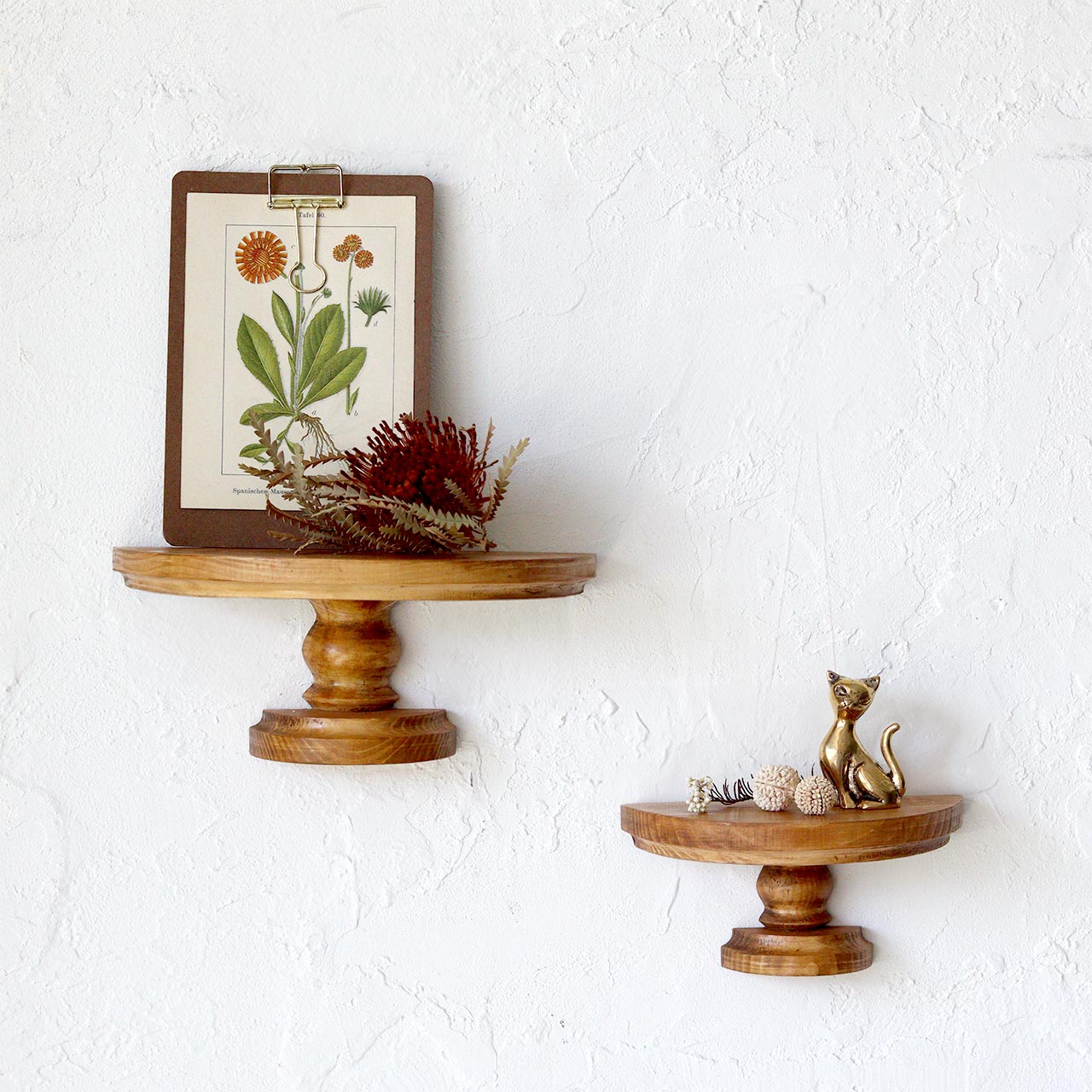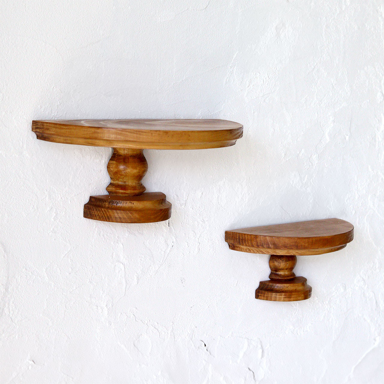 アンティークのような雰囲気を持つパイン材のウォールスタンドシェルフ。オブジェや植物、写真立てなどを飾ることで、壁面がお気に入りのスペースに変わります。軽量なパイン材を使用し、さらにアンティークのような重厚感を出すために一つ一つ手作業で塗装を施しています。本体の背面に2箇所ビスを引っ掛けるための金具があるため、壁にビスなどを打ちこんで、引っ掛けるだけで簡単に設置いただけます。(※取り付け用のビスは付属しません。)自然なパイン材の木目が美しく、ディスプレイ用としてはもちろんメガネやアクセサリー、鍵など日常の小物を置くのにもおすすめです。玄関、洗面所、リビングなど様々な場所でお楽しみいただけるシェルフです。(※天然木を使用しているため、木目や節の出方、色合いに個体差があります。予めご了承ください。)