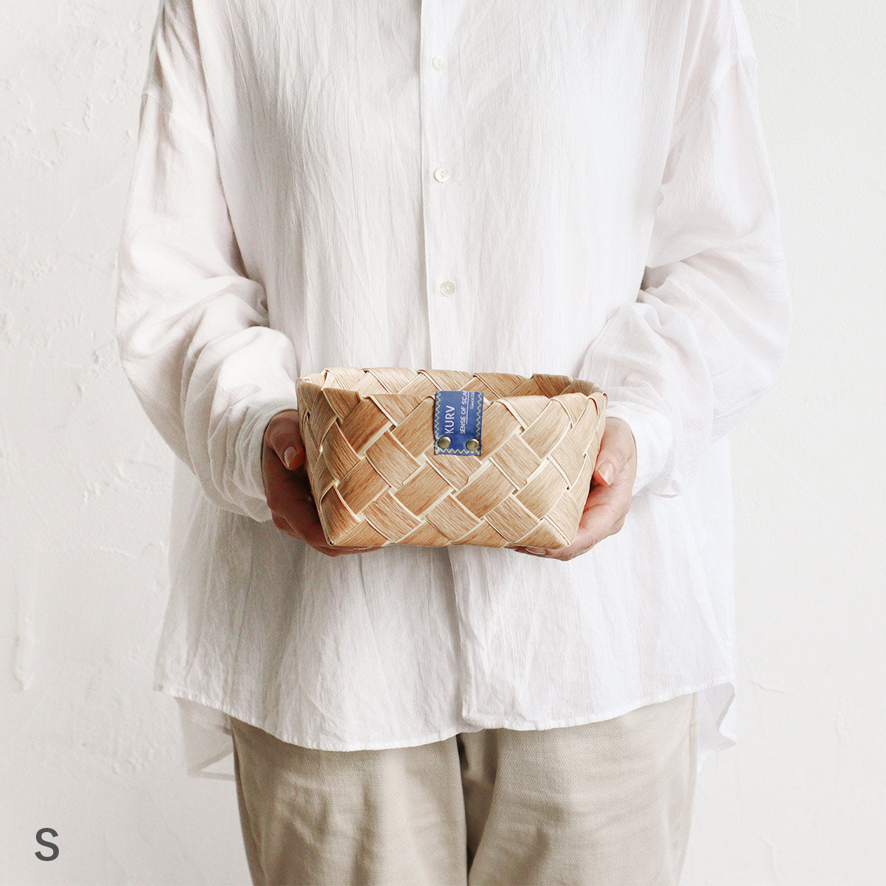 KURV(クルヴ)シリーズは北欧の白樺かごのような雰囲気が特徴の、コットンウッドのスライス材とペーパーを重ねて格子状に編んだバスケットです。手編みならではの温かみと、コットンウッドとペーパーの優しい風合いが魅力のバスケット。 見せる収納として置いておくだけで、お部屋にナチュラルな雰囲気をプラスしてくれます。四角に編まれた底辺から、上部へいくほど緩やかな円形に変化していく形状も特徴のひとつ。大きさはSとLの2サイズ。Sサイズはキッチンで果物やパンを入れたり、リビングではリモコンや充電器などのちょっとした小物収納に便利なサイズ。Lサイズはキッチン周りの収納としてはもちろん、玄関では鍵や定期入れなどお出かけセットの収納にもおすすめです。とても軽量なので、様々な場所に手軽に持ち運んでお使いいただけます。その他KURV(クルヴ)シリーズで揃えて収納することで、見た目もきれいに整頓できます。