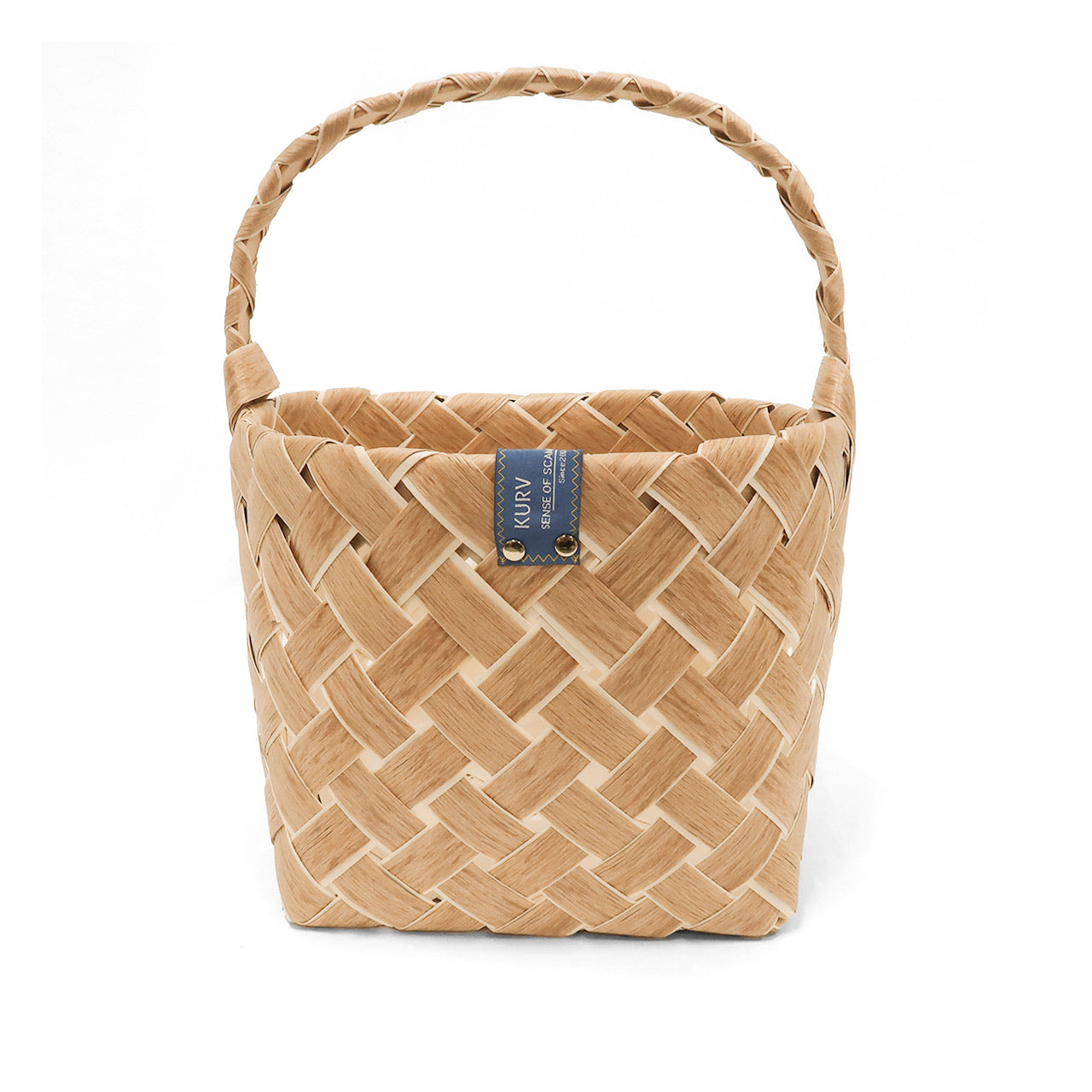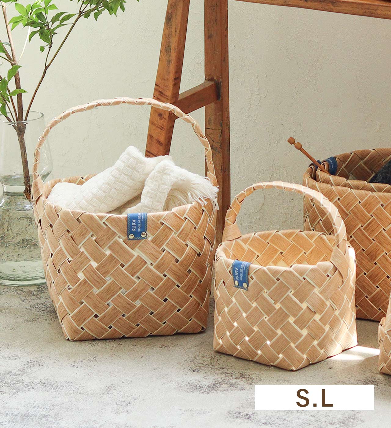 北欧の白樺かご風の軽量でシンプルなワンハンドルバスケット。KURV(クルヴ)シリーズは北欧の白樺かごのような雰囲気が特徴の、コットンウッドのスライス材とペーパーを重ねて格子状に編んだバスケットです。手編みならではの温かみと、コットンウッドとペーパーの優しい風合いが魅力のバスケット。見せる収納として置いておくだけで、お部屋にナチュラルな雰囲気をプラスしてくれます。大きさはSとLの2サイズ。Sサイズはリビングでの編み物セットの収納や、ハンドクリームやヘアワックス、ブラシなどケア用品の収納に。Lサイズはブランケットや雑誌の収納、玄関でのスリッパの収納などにおすすめです。持ち手も付いており軽量なので、持ち運びも楽々。様々な場所に手軽に持ち運んでお使いいただけます。その他KURV(クルヴ)シリーズで揃えて収納することで、見た目もきれいに整頓できます。