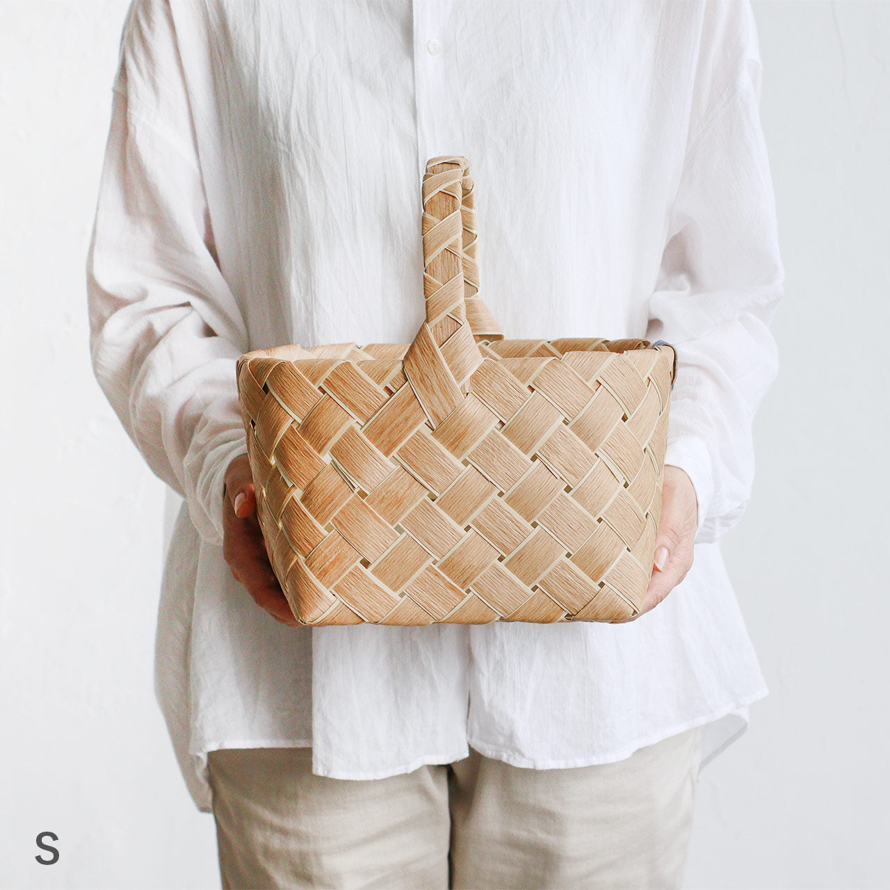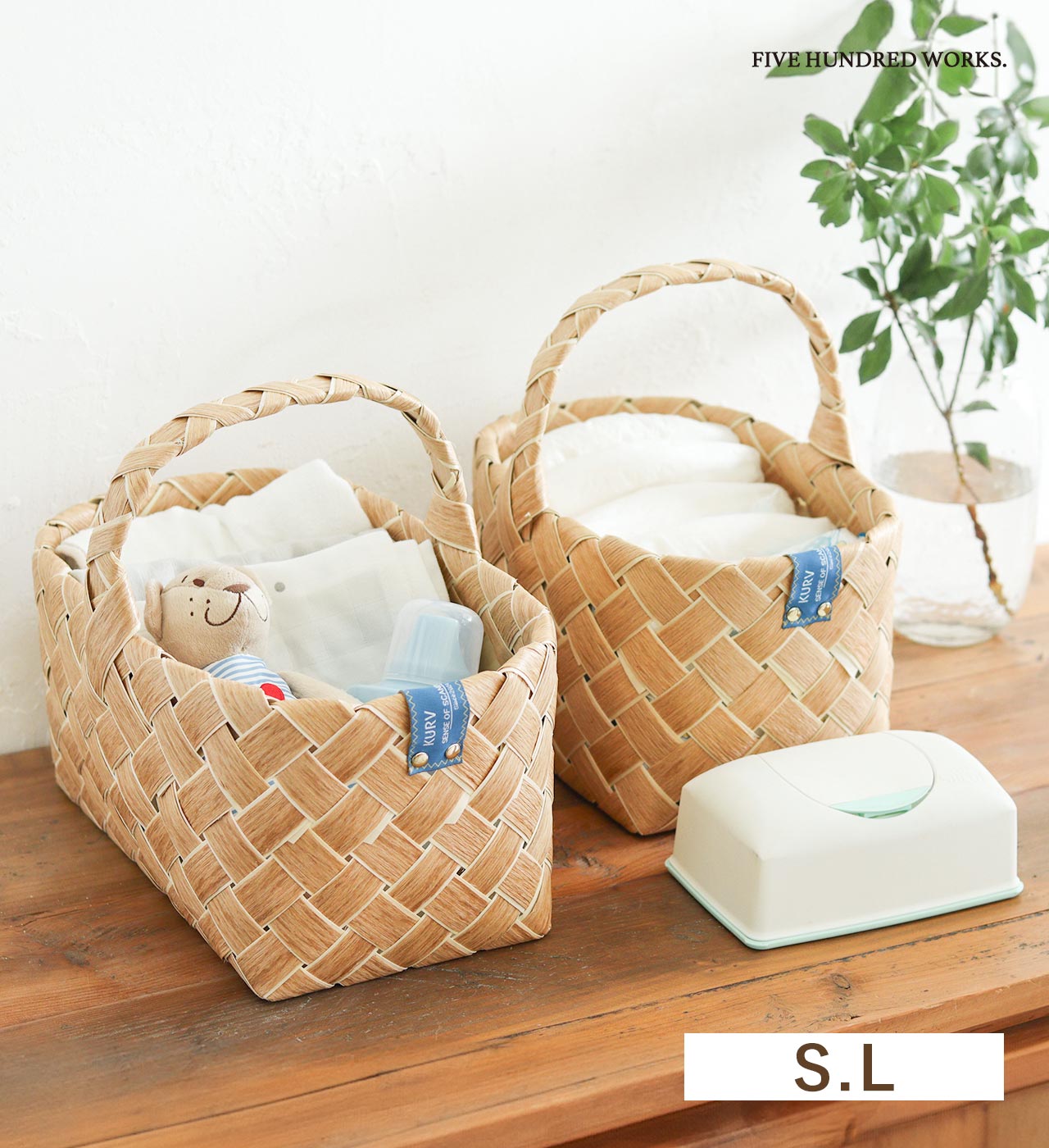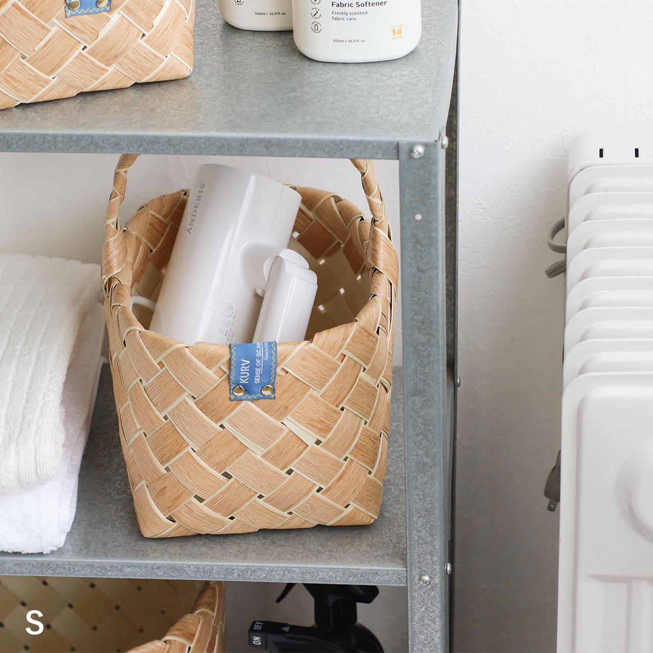 北欧の白樺かご風の軽量でシンプルなワンハンドルバスケット。KURV(クルヴ)シリーズは北欧の白樺かごのような雰囲気が特徴の、コットンウッドのスライス材とペーパーを重ねて格子状に編んだバスケットです。手編みならではの温かみと、コットンウッドとペーパーの優しい風合いが魅力のバスケット。見せる収納として置いておくだけで、お部屋にナチュラルな雰囲気をプラスしてくれます。大きさはSとLの2サイズ。Sサイズは洗面所でのタオル収納やドライヤーの収納に、Lサイズは掃除用具やトイレットペーパーのストック収納にもおすすめです。持ち手付きのかごは子育て中にもとても便利なアイテム。Sサイズに保湿クリームや綿棒、爪切りなどのケア用品。Lサイズにはオムツを入れて2つのバスケットを並べておくと、使い勝手の良い育児セットの出来上がりです。とても軽量なので様々な場所に手軽に持ち運んでお使いいただけます。その他KURV(クルヴ)シリーズで揃えて収納することで、見た目もきれいに整頓できます。