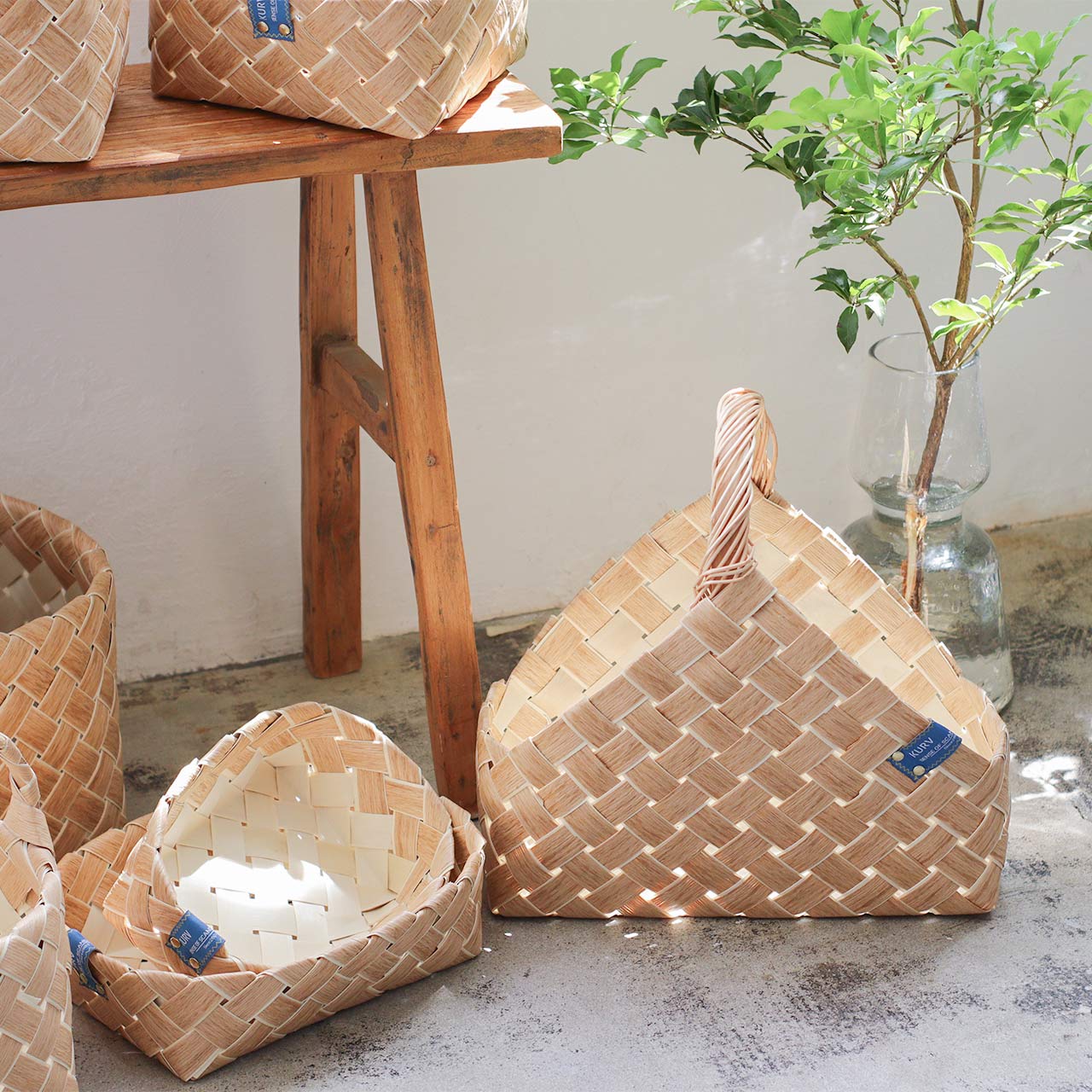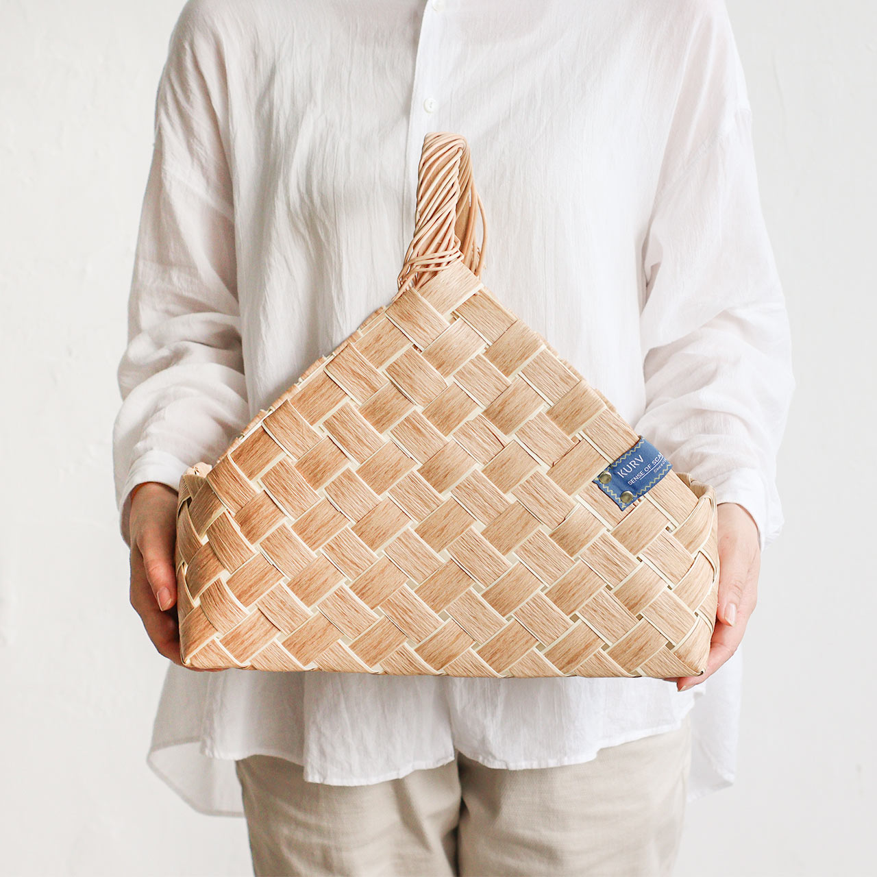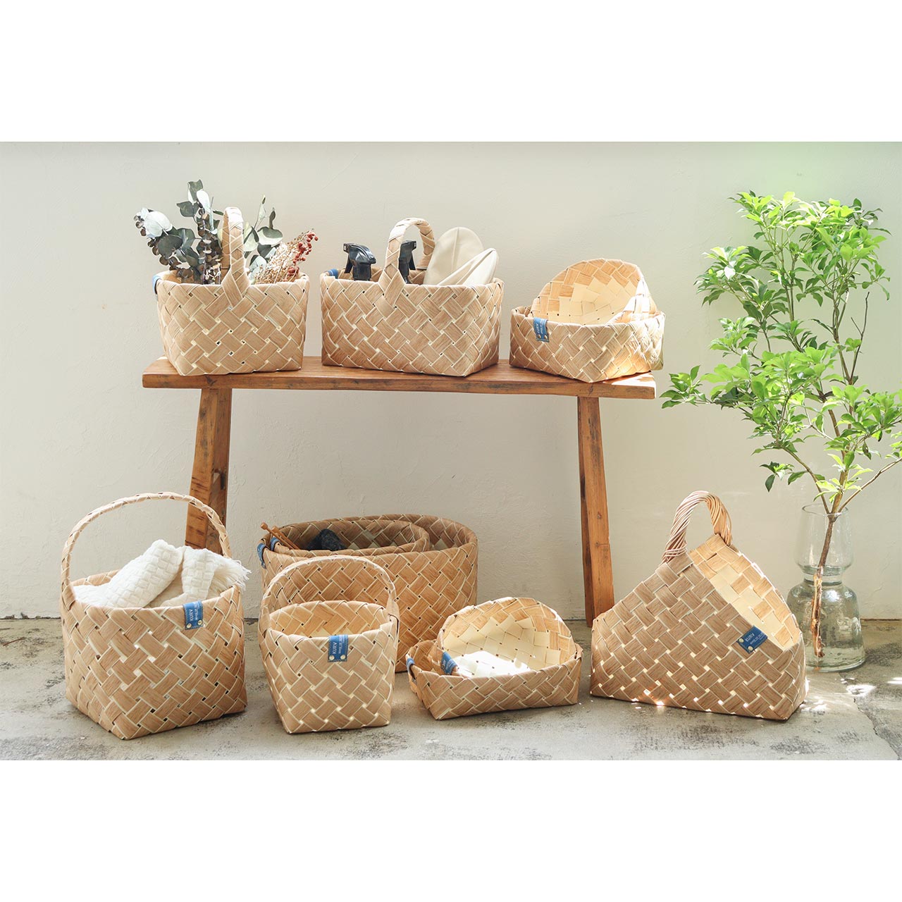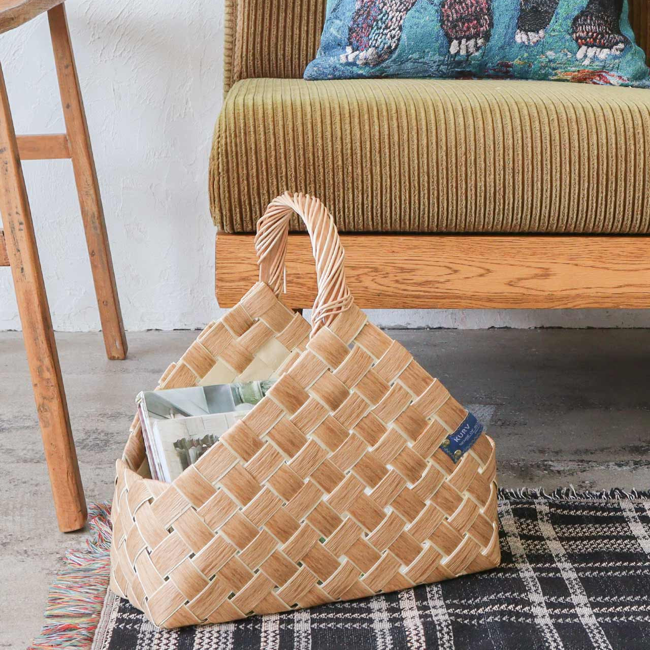 やわらかく軽量な北欧の白樺かご風バスケット。KURV(クルヴ)シリーズは北欧の白樺かごのような雰囲気が特徴の、コットンウッドのスライス材とペーパーを重ねて格子状に編んだバスケットです。手編みならではの温かみと、コットンウッドとペーパーの優しい風合いが魅力のバスケット。見せる収納として置いておくだけで、お部屋にナチュラルな雰囲気をプラスしてくれます。マガジンラックとしてソファサイドに置いたり、生活感の出やすいタブレットやガジェット類の収納、玄関でのスリッパ収納など幅広いシーンで様々な使い方をお楽しみいただけます。とても軽量なので、様々な場所に手軽に持ち運んでお使いいただけます。その他KURV(クルヴ)シリーズで揃えて収納することで、見た目もきれいに整頓できます。