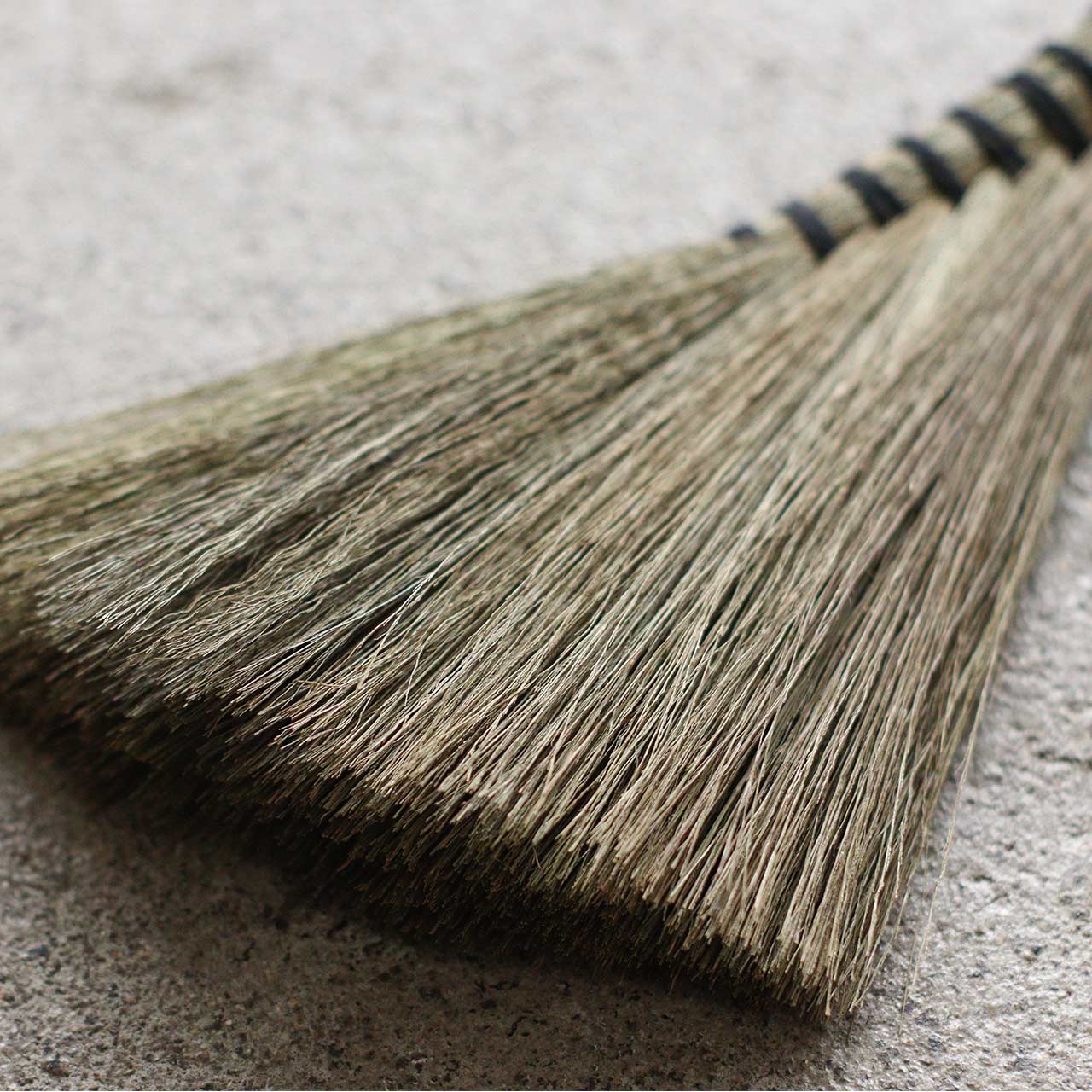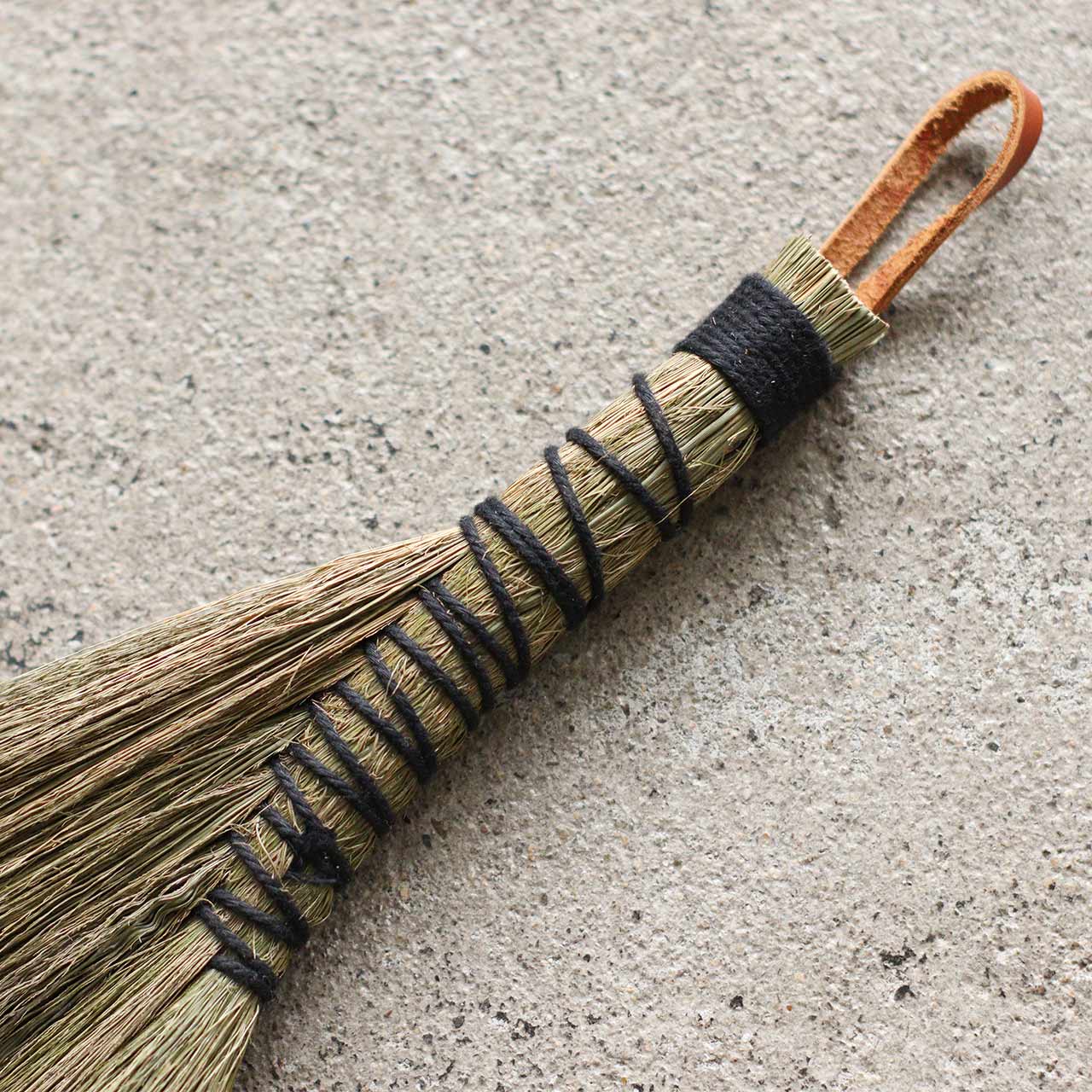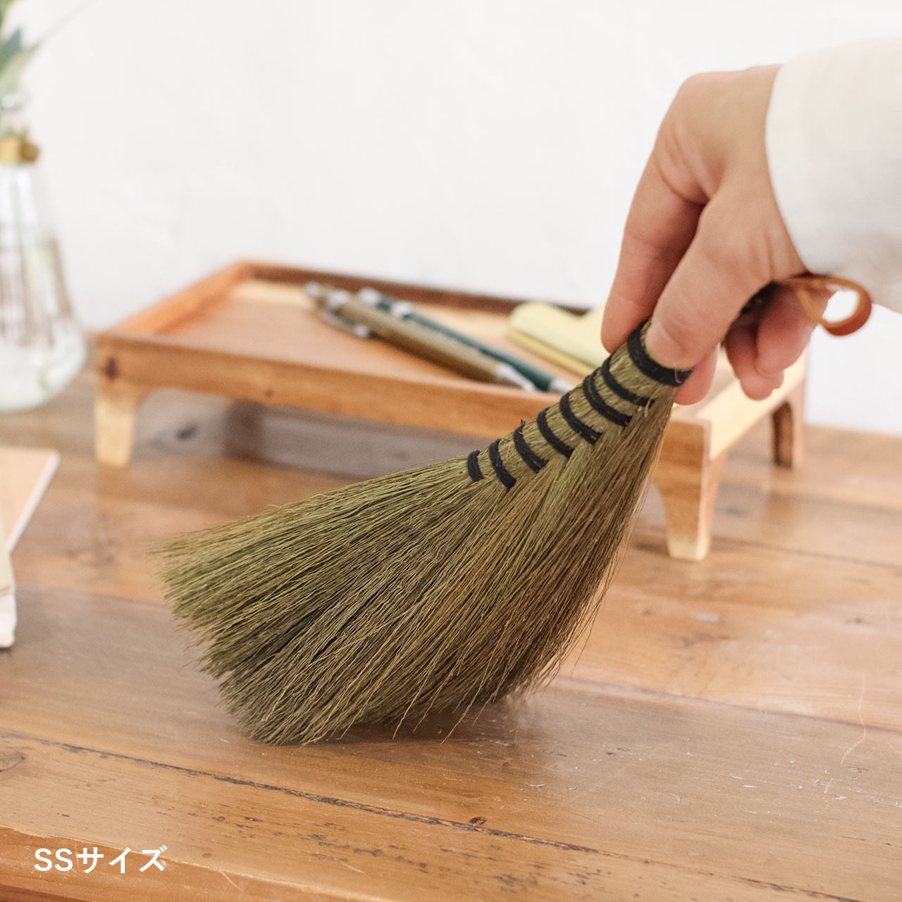 天然素材の「タイガーグラス」というい草を使って編まれたほうきです。やわらかな掃き心地が特徴で、気づいた時にさっと取り出しやすいハンディサイズはデスク上や棚などの掃除にぴったりです。SSサイズとSサイズどちらも斜めにカットが入っているため、サッシの隙間など細かい場所の掃除にもおすすすめです。吊り下げて収納できる革紐付きで、お掃除の後もそのまま出して飾っておきたくなる、昔ながらの素朴な魅力溢れるほうきです。ハンディサイズの他に、フロア掃除にぴったりの持ち手が長いタイプもございます。