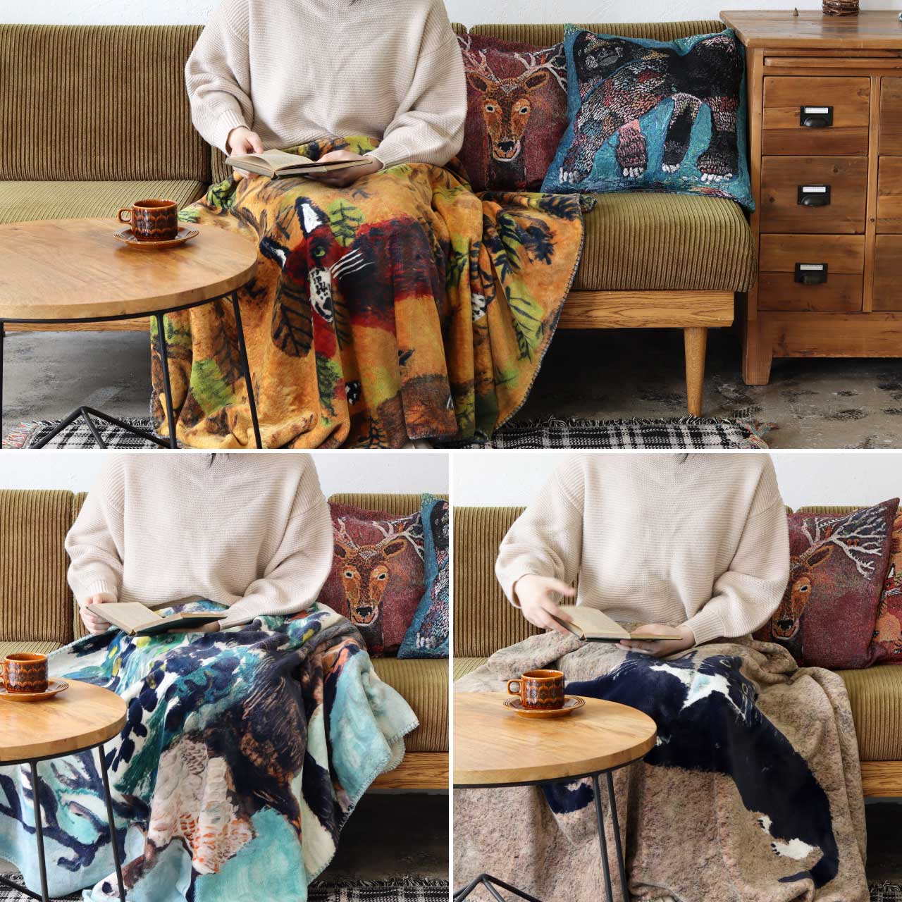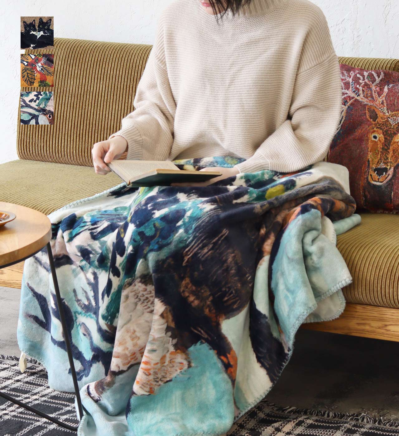 作家「KOTETSU」さんのイラストが描かれたフリースブランケット。色彩豊かで生き生きとした動物たちのイラストは見ているだけで元気を与えてくれます。イラストは3パターン。コテツさんが大好きな面白くてかっこいい動物達のイラストです。フリースは毛布より軽く持ち運びしやすいので、普段使いにぴったり。ポリエステル100%のふんわりなめらかな肌触り。お昼寝にもちょうど良い身体をすっぽり覆うサイズ感。膝掛けはもちろん、寝具としてもおすすめです。その他のKOTETSU(コテツ)シリーズでインテリアを揃えても 統一感が出ておすすめです。