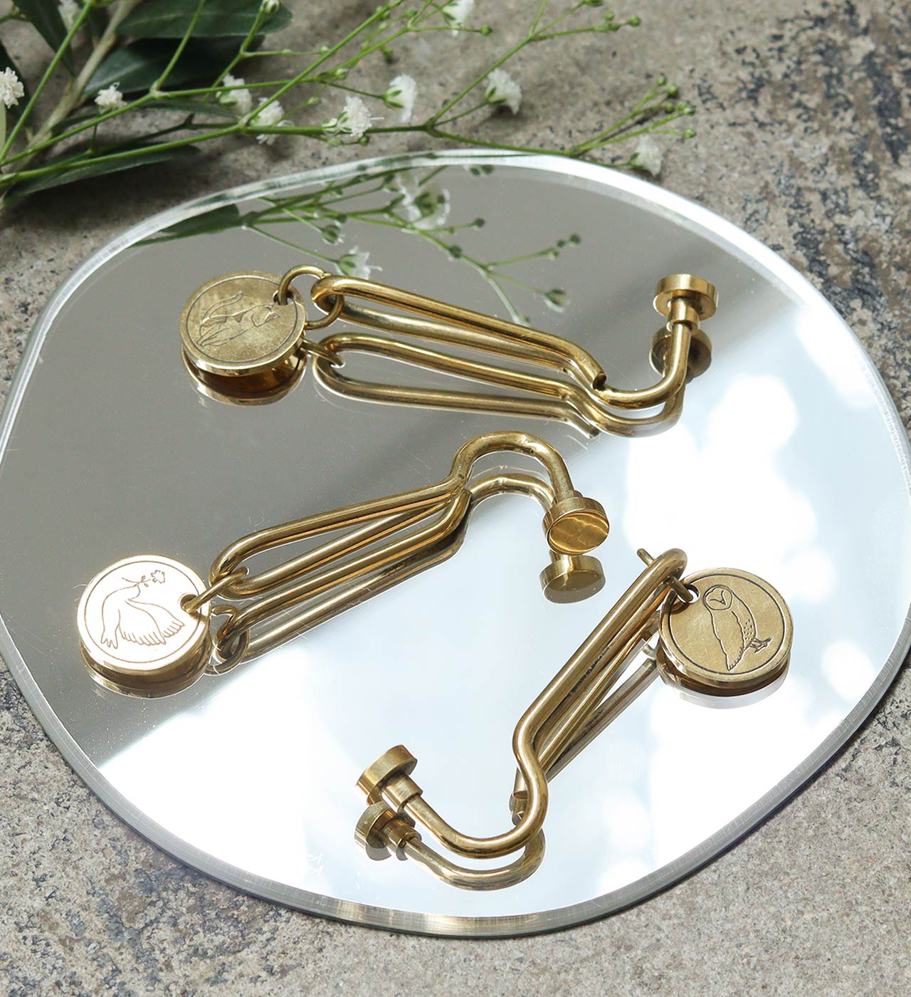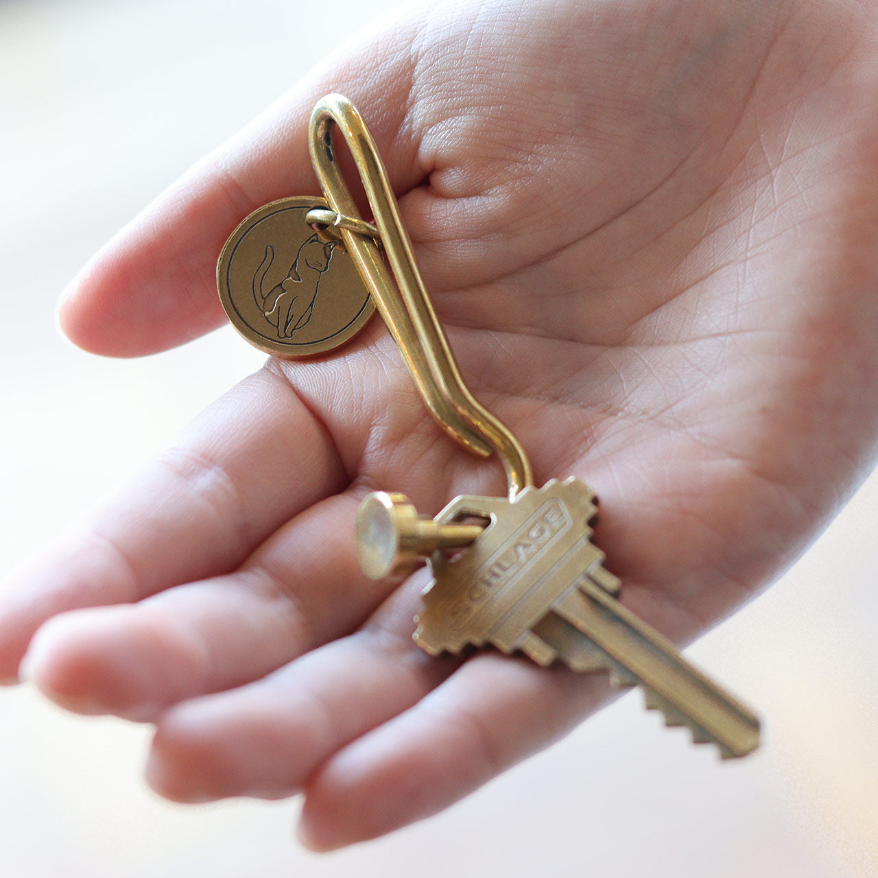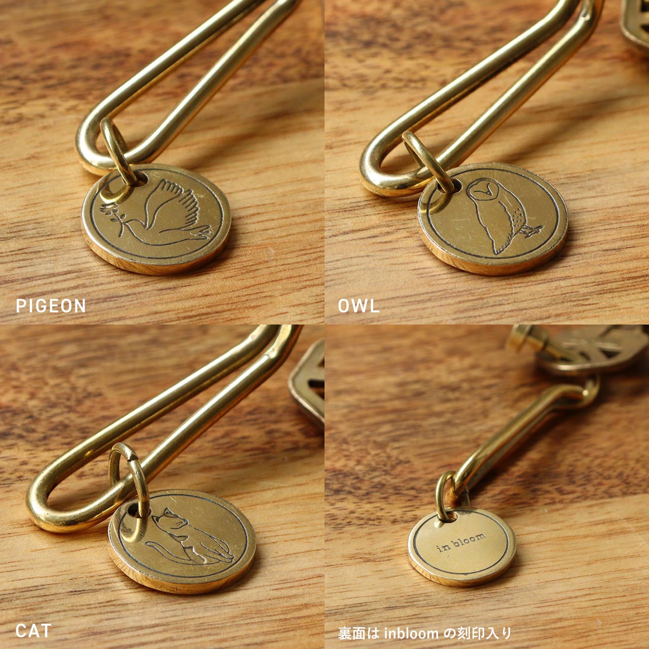 動物の刻印が入った真鍮製アンティーク風キーホルダー。真鍮(ブラス)製のフックとオリジナルの刻印パーツを組み合わせたキーホルダーです。パーツの表面には「ハト(PIGEON)」「フクロウ(OWL)」「ネコ(CAT)」をデザイン。裏面には「inbloom」のブランドロゴの刻印が入っています。ネジ式のパーツを取り外して鍵を装着するデザインなので、リング式のキーホルダーに比べて取り外しも簡単。ネイルをした指でも簡単に鍵の付け外しをしていただけます。平和のシンボルの「ハト(PIGEON)」と、幸運の鳥と言われている「フクロウ(OWL)」、かわいい「ネコ(CAT)」の3タイプ。ちょっとした贈り物にもぴったりな 縁起の良い動物をセレクトした、ハンドメイドのキーホルダーです。