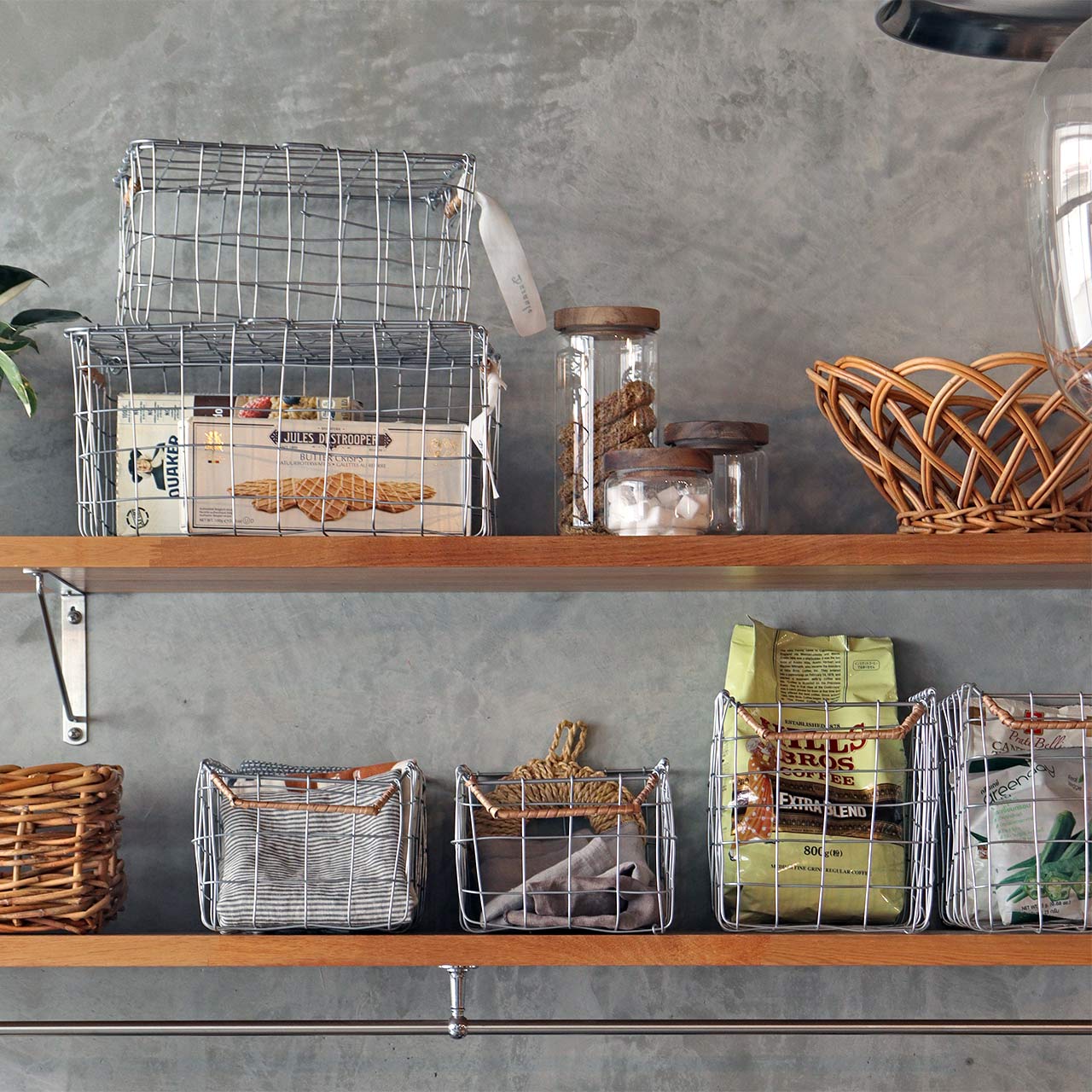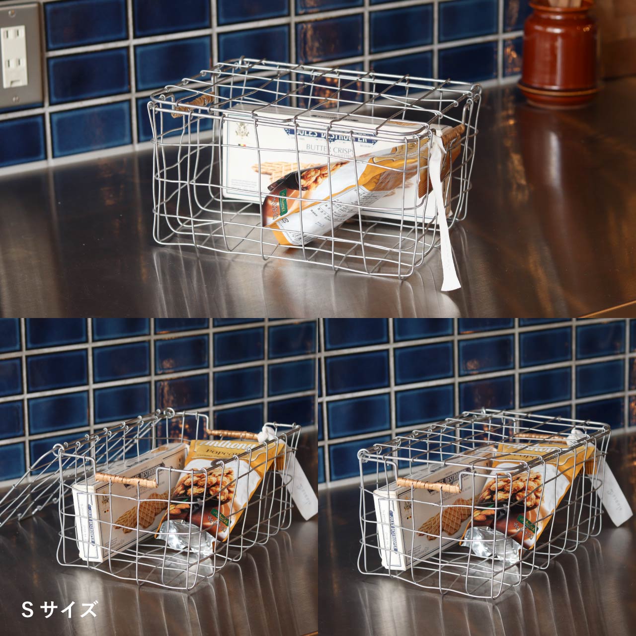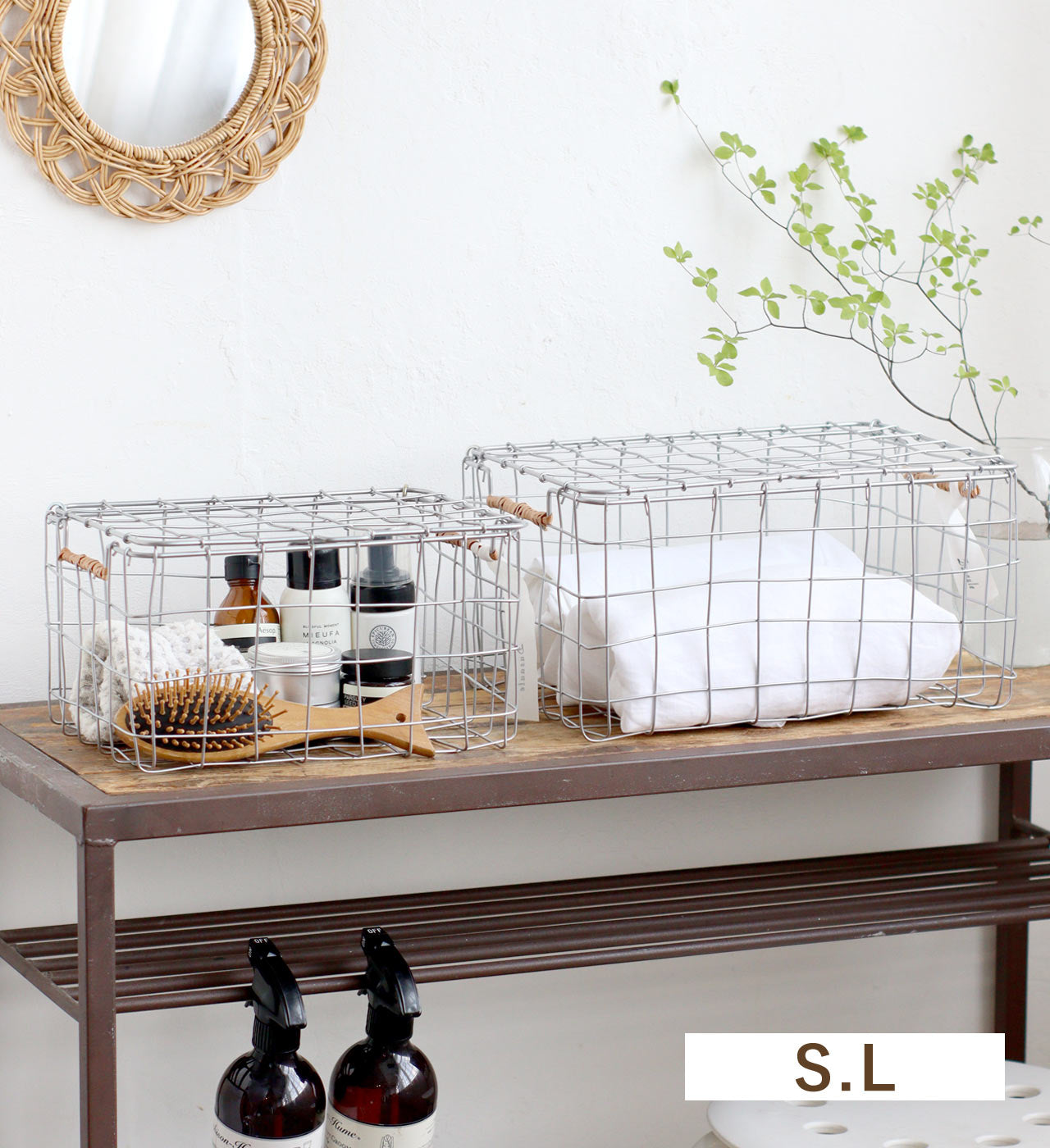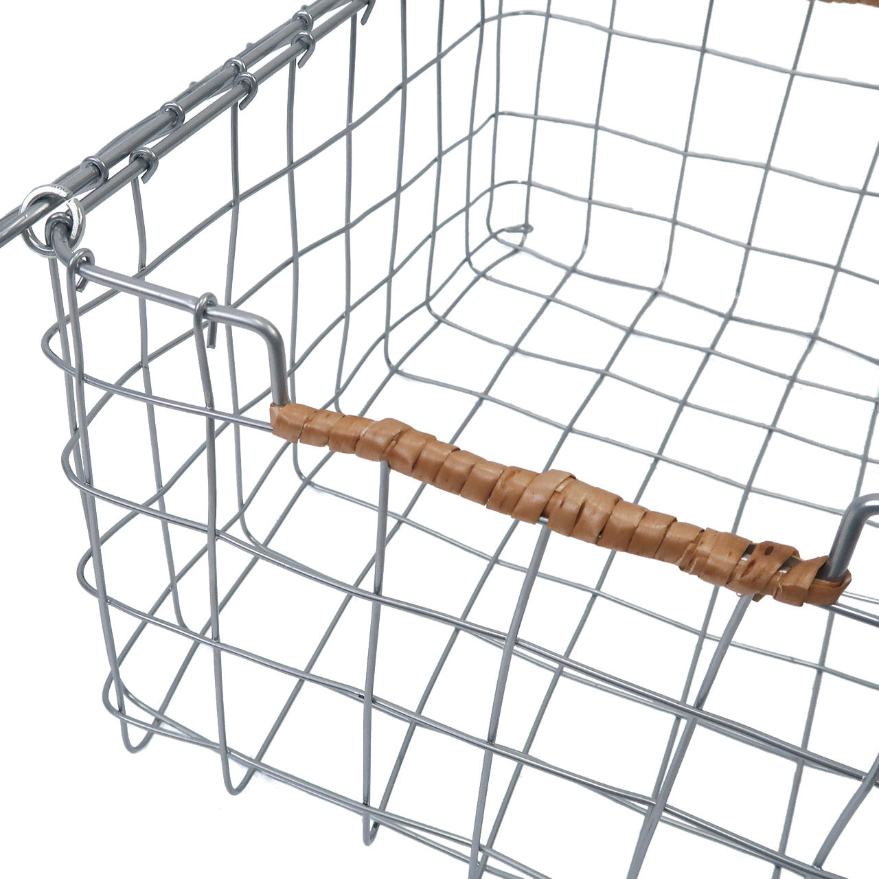 ワイヤーを使ってハンドメイドで編まれたふた付きバスケット。Dusaule(デュソール)シリーズは落ち着いたシルバー塗装で仕上げ、アクセントに柳を使ったワイヤーバスケットです。統一感のないものでもワイヤーバスケットに入れることでまとまりが生まれ、お洒落なカフェのような雰囲気に。両サイドに編まれた柳がワンポイントに。ふた付きなので、軽いものであれば重ねて置く事も可能です。Sサイズは、キッチンでの調味料など小さい容器の収納やバスルームのコスメ収納に。Lサイズは、キッチンでのストック品の収納としてはもちろん、バスルームでのタオル収納にもおすすめです。収納以外にも、ドライフラワーや洋書などを入れてお部屋のディスプレイとしてもお楽しみいただけます。その他のDusaule(デュソール)シリーズで収納を揃えても統一感が出ます。