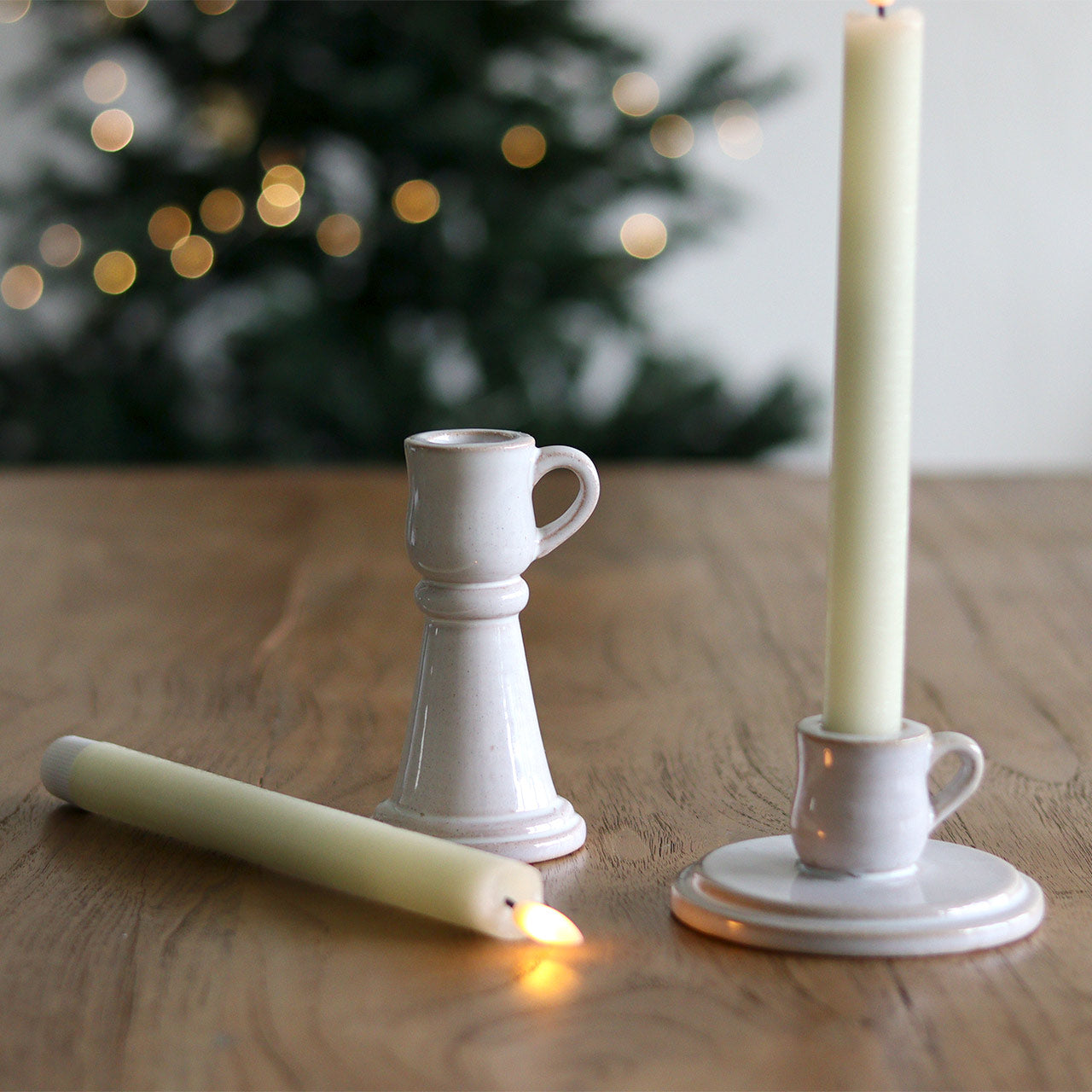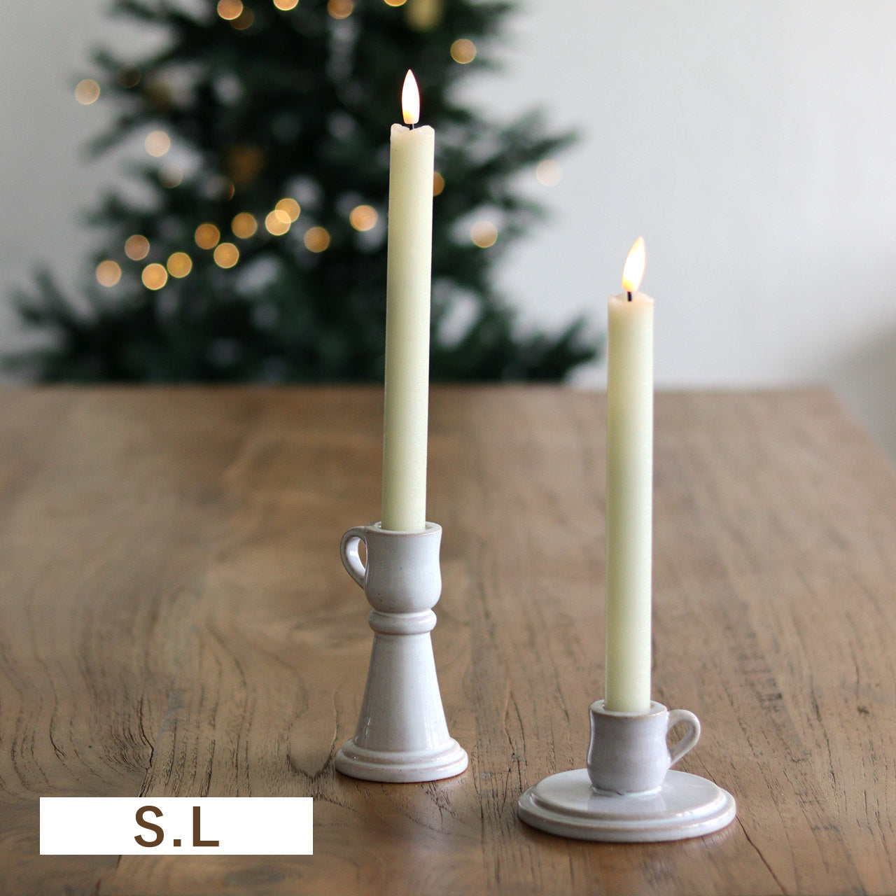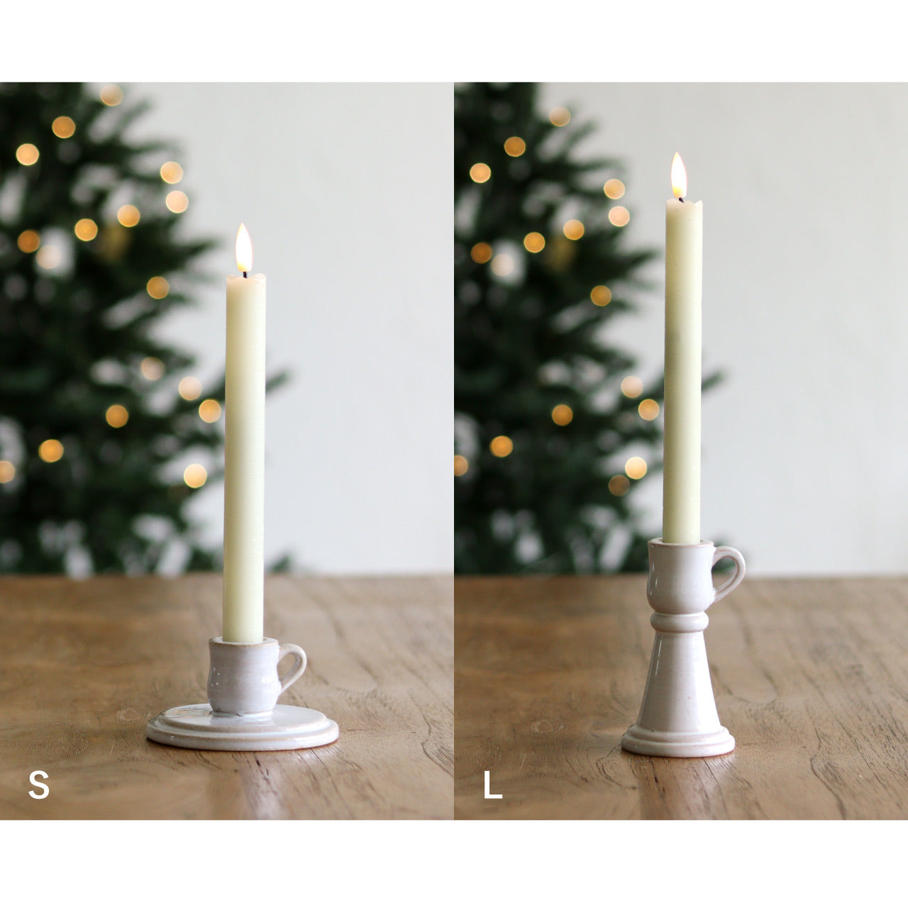 クラシカルな雰囲気のある 磁器スタンドとLEDキャンドルライトのセット。小さなマグカップのような形が 可愛らしいデザイン。磁器ならではの光沢感と繊細さが、インテリアに洗練された印象を加えてくれます。釉薬のかかり具合によって色合いやムラなど1点1点異なりますが、味わいとしてお楽しみください。LEDキャンドルライトは 本物の炎のように心地よく揺らめき、リラックスした空間を演出してくれます。本体の表面は蝋でコーディングされており、表面の凹凸や上面の自然に溶けたようなフォルムがまるで本物のキャンドルのような仕上がりです。単4電池2本で、約100時間の連続点灯が可能で、ON・OFFの切り替えは底面のスイッチを手動で押すだけの簡単な仕様。火を使わないLEDライトなので、小さなお子様やペットのいる空間でも 安心してお使いいただけます。クリスマスシーズンの雰囲気作りや、夜のリラックスタイムなど 様々なシーンでお楽しみください。