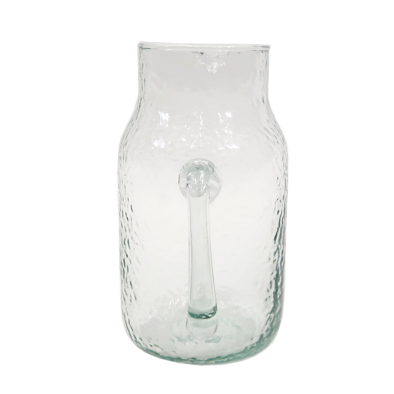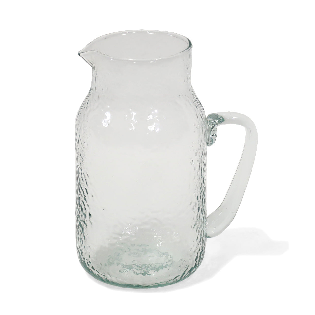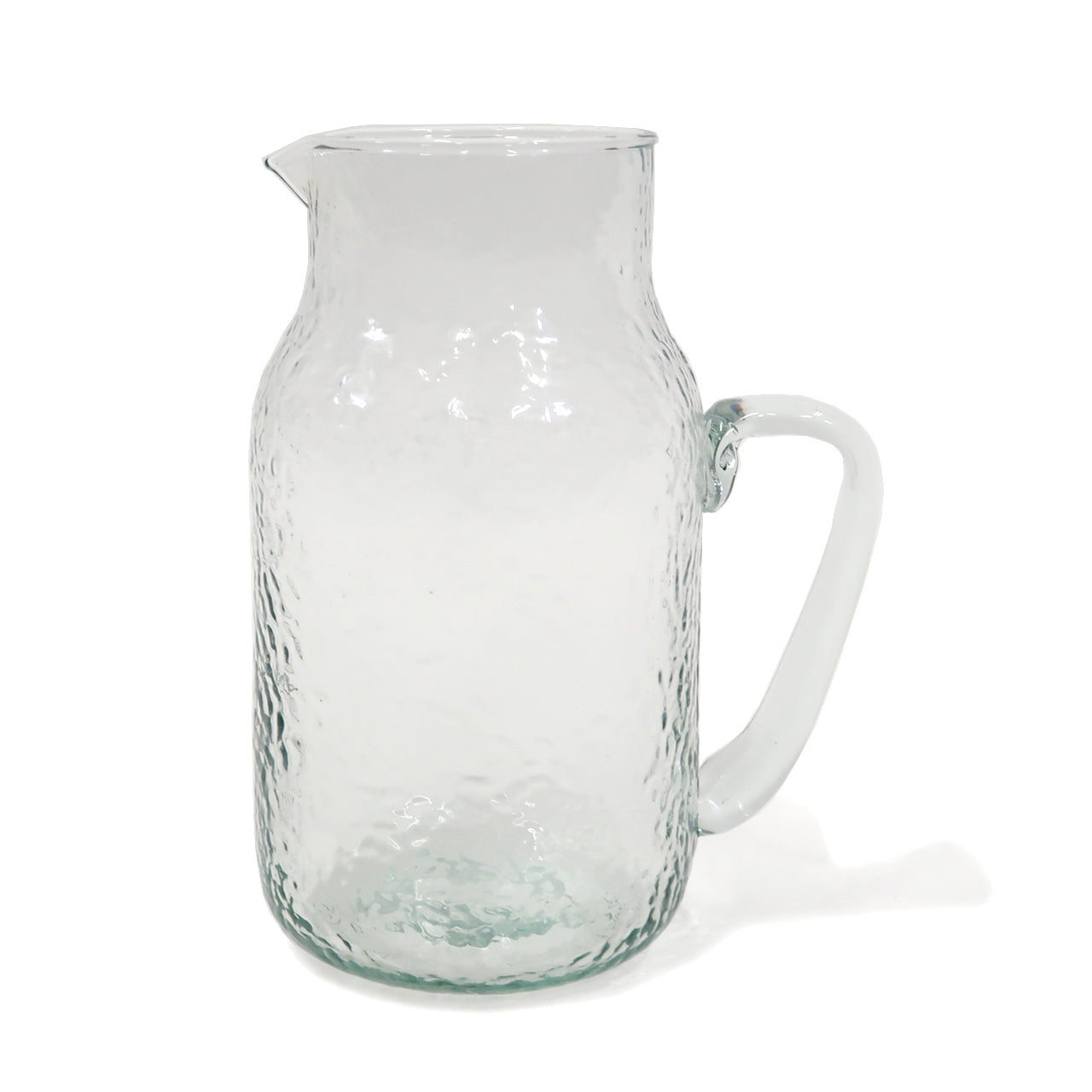 花瓶にもなる凹凸のあるテクスチャー入りのガラスピッチャー。ガラスを再利用して作られた容量約1200mlのガラスピッチャー。ガラスの厚みや角度により淡いブルー/グリーンに見えるカラーが爽やかで魅力的です。開口部が広いので、たっぷりと氷を入れたりレモンやミントをいれたデトックスウォーターにぴったり。花瓶としてのご使用もおすすめです。ハンドメイド品のため歪みや繋ぎ目などひとつ一つに個体差がありますが、リサイクルガラスの味わいとしてお楽しみください。リサイクルガラスを使ったアイテムは、ガラスピッチャーの他にグラスやキャニスターなどもございます。