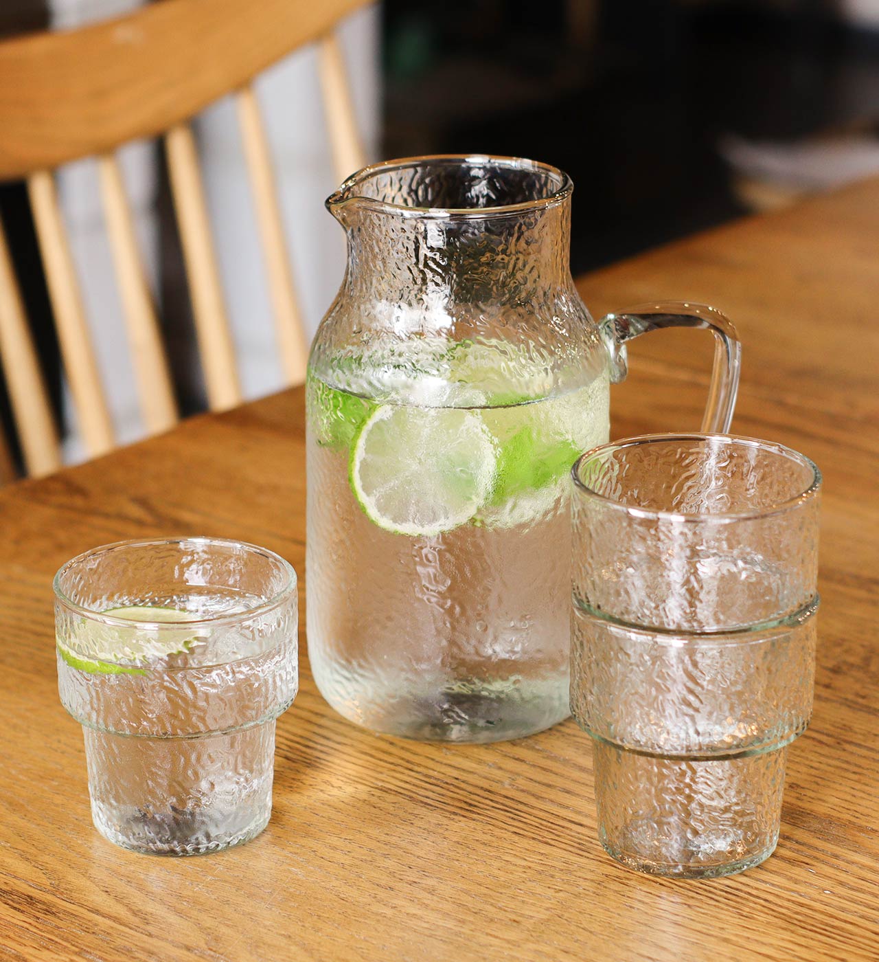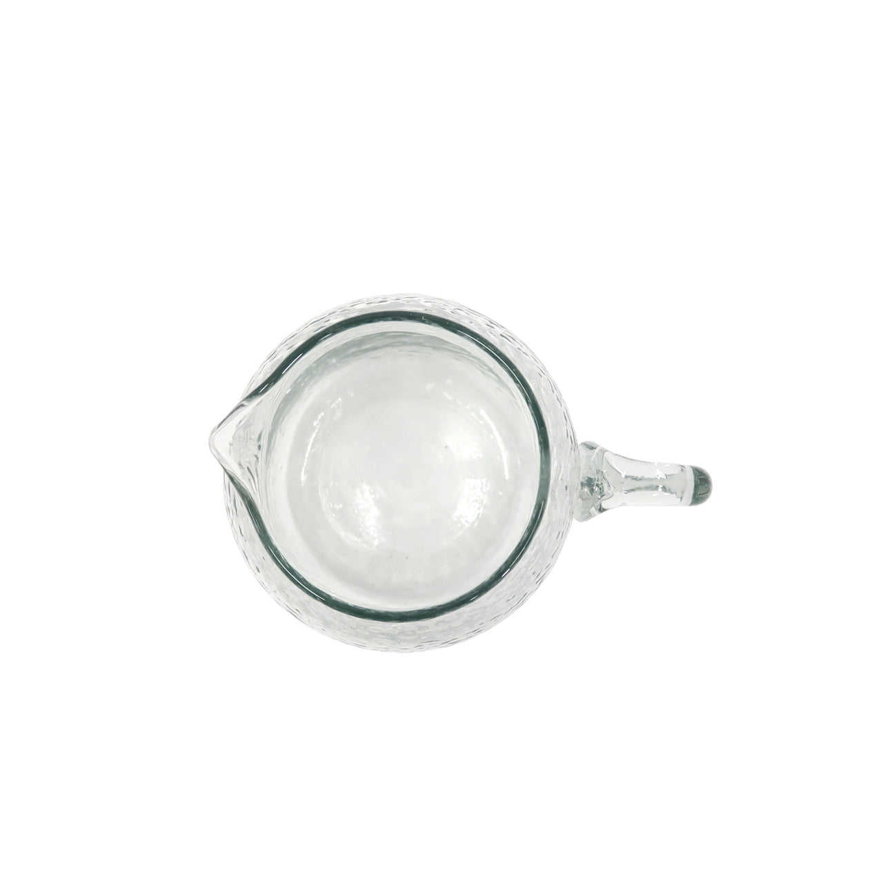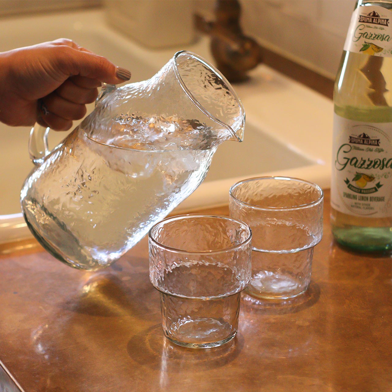 花瓶にもなる凹凸のあるテクスチャー入りのガラスピッチャー。ガラスを再利用して作られた容量約1200mlのガラスピッチャー。ガラスの厚みや角度により淡いブルー/グリーンに見えるカラーが爽やかで魅力的です。開口部が広いので、たっぷりと氷を入れたりレモンやミントをいれたデトックスウォーターにぴったり。花瓶としてのご使用もおすすめです。ハンドメイド品のため歪みや繋ぎ目などひとつ一つに個体差がありますが、リサイクルガラスの味わいとしてお楽しみください。リサイクルガラスを使ったアイテムは、ガラスピッチャーの他にグラスやキャニスターなどもございます。