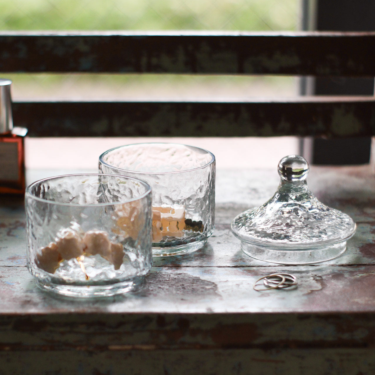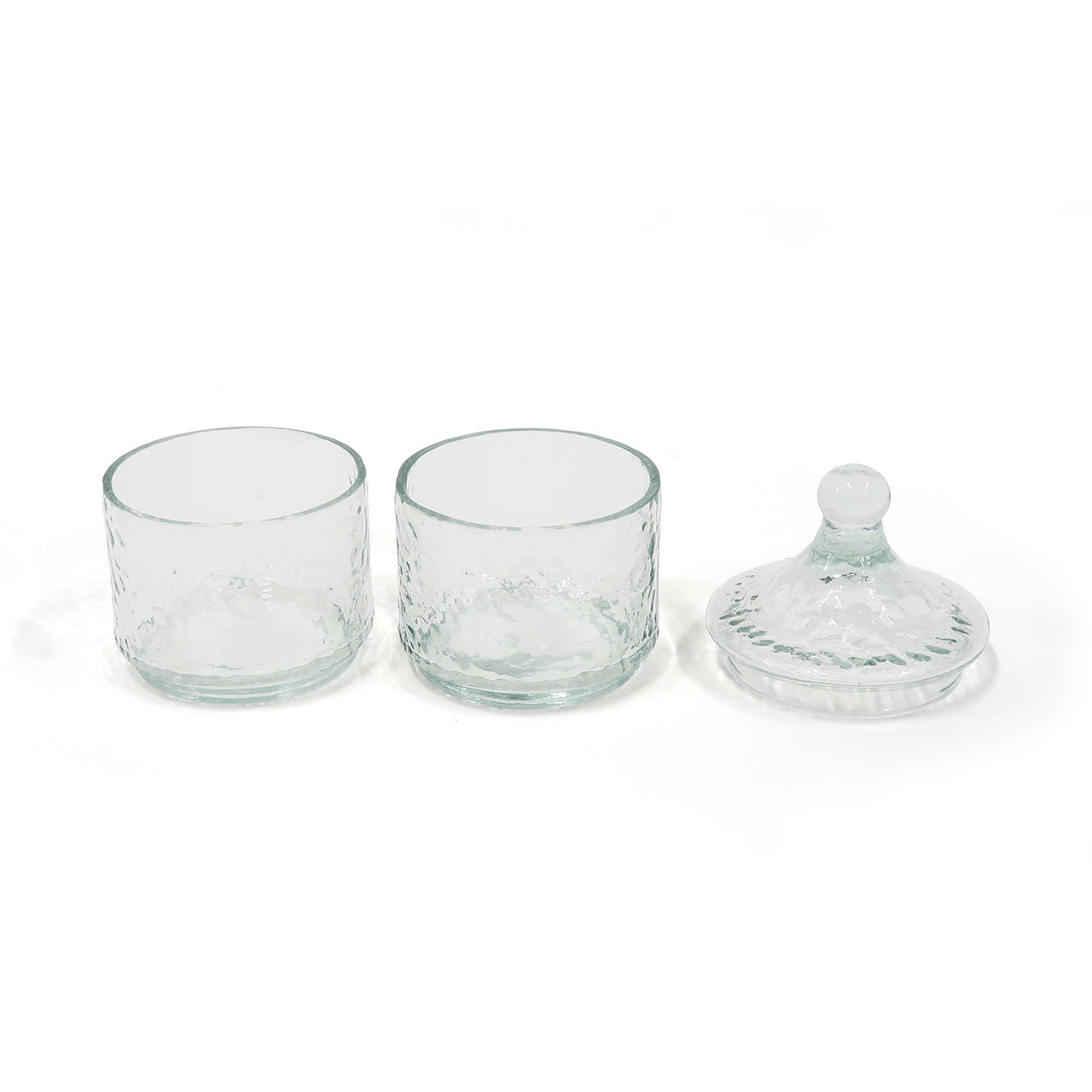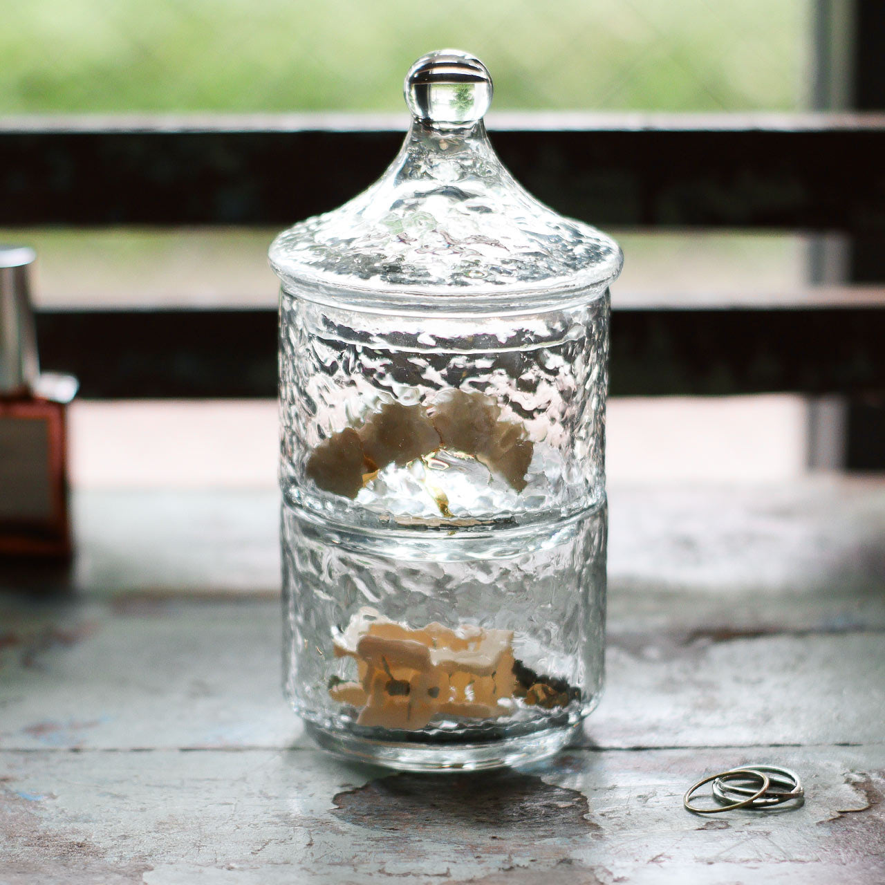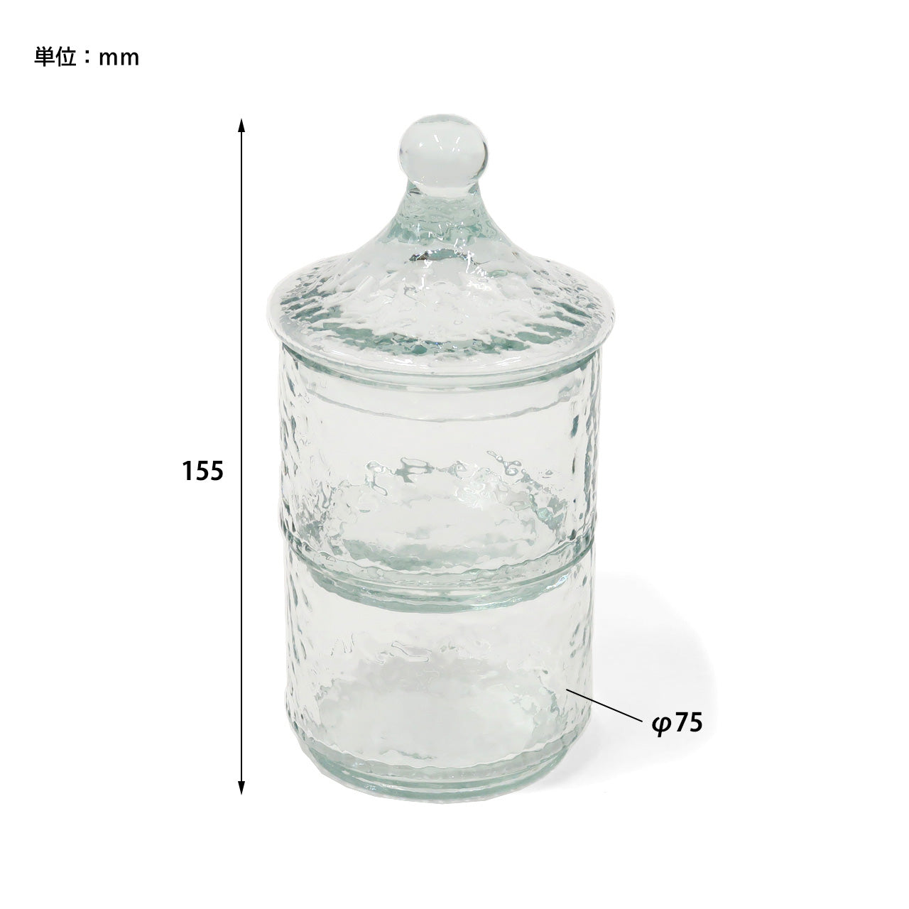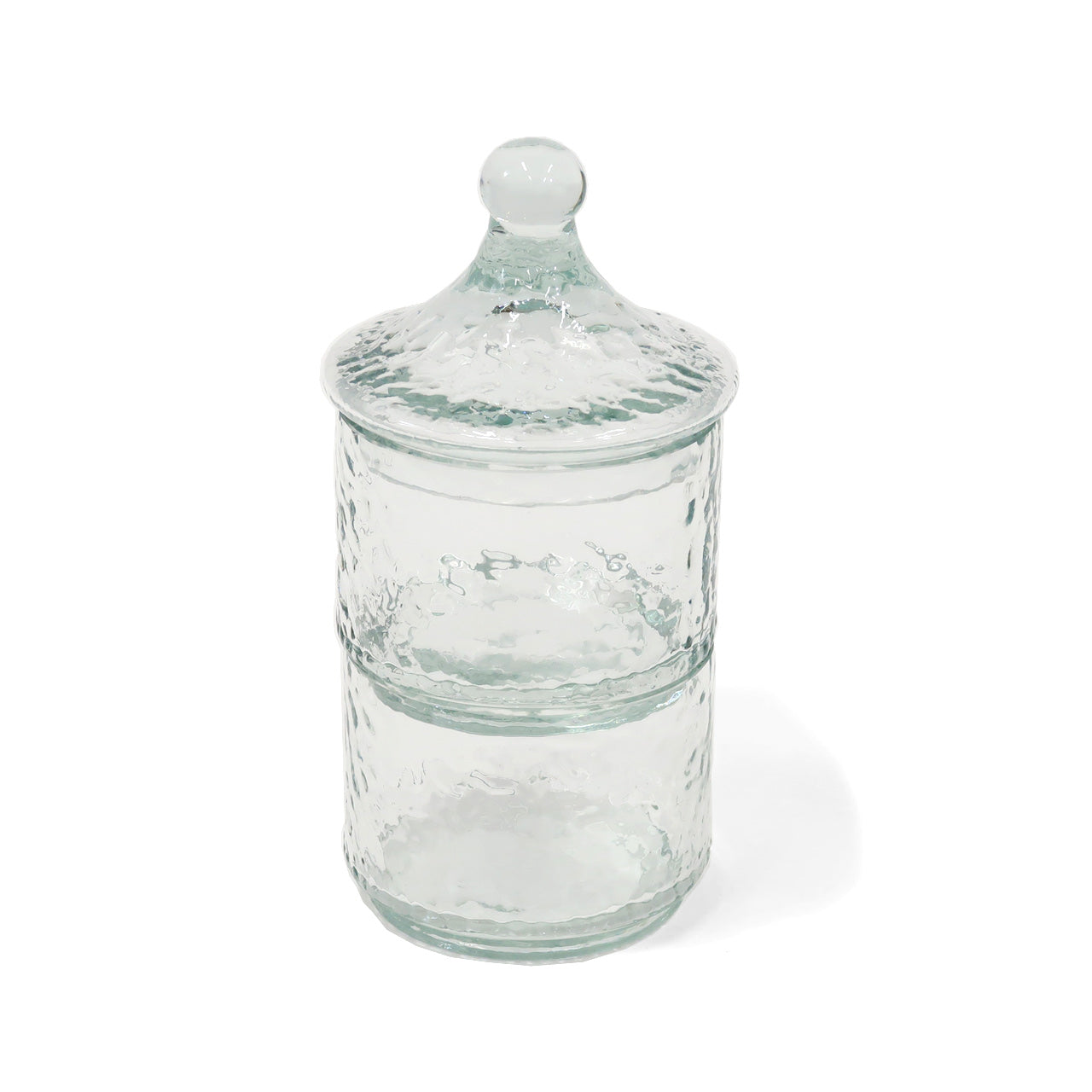 ガラスのゆらぎが美しい凹凸のあるテクスチャー入りガラスキャニスターの2段タイプ。ガラスを再利用して作られたキャニスターの2段タイプ。ガラスの厚みや角度により淡いブルー/グリーンに見えるカラーが魅力的です。アンティーク風の絵になる小物入れ。2段重ねになっているのでピアスやイヤリングなどを種類ごとに分けておしゃれに収納いただけます。ハンドメイド品のため歪みや繋ぎ目などひとつ一つに個体差がありますが、リサイクルガラスの味わいとしてお楽しみください。リサイクルガラスを使ったアイテムは、キャニスターの他グラスやピッチャーなどもございます。