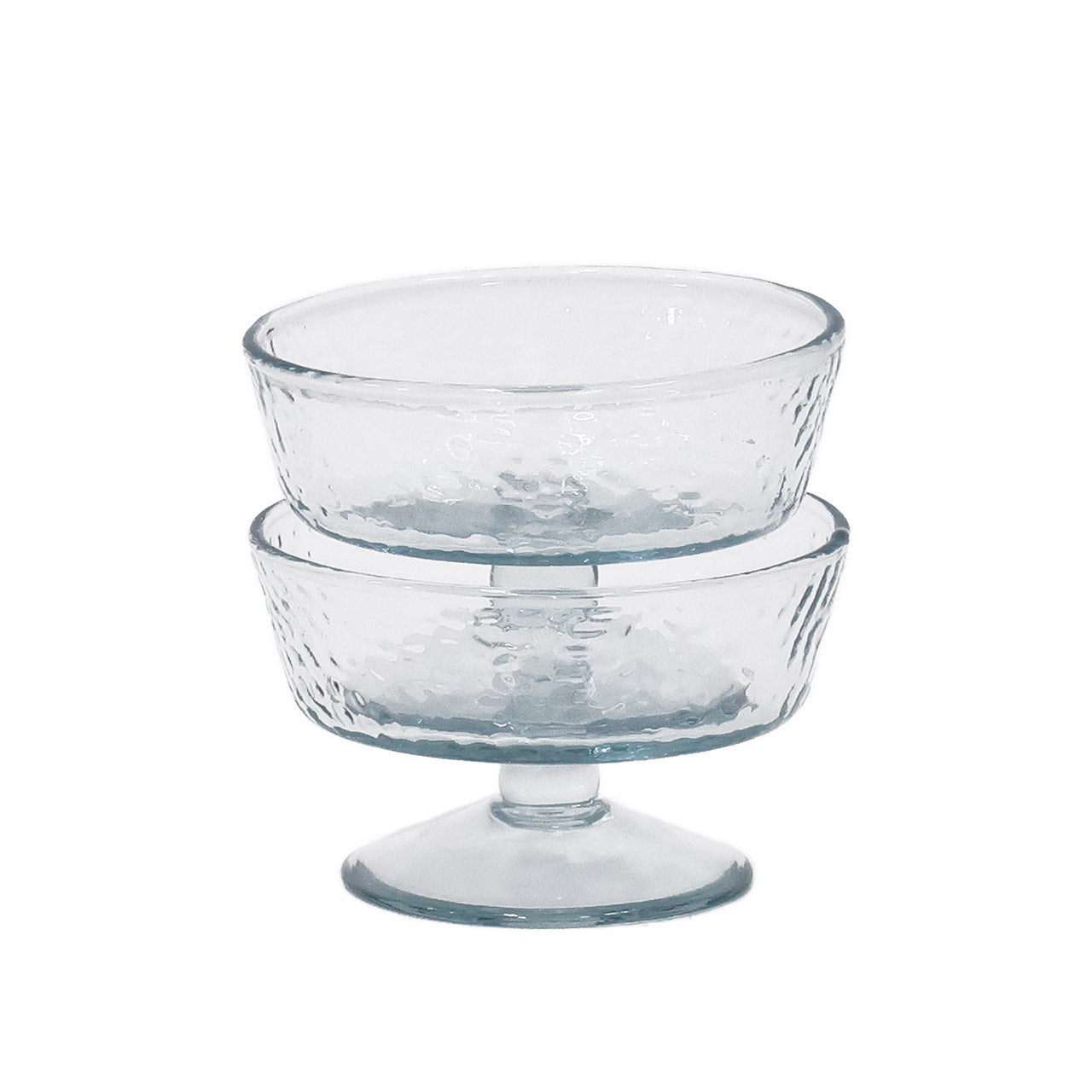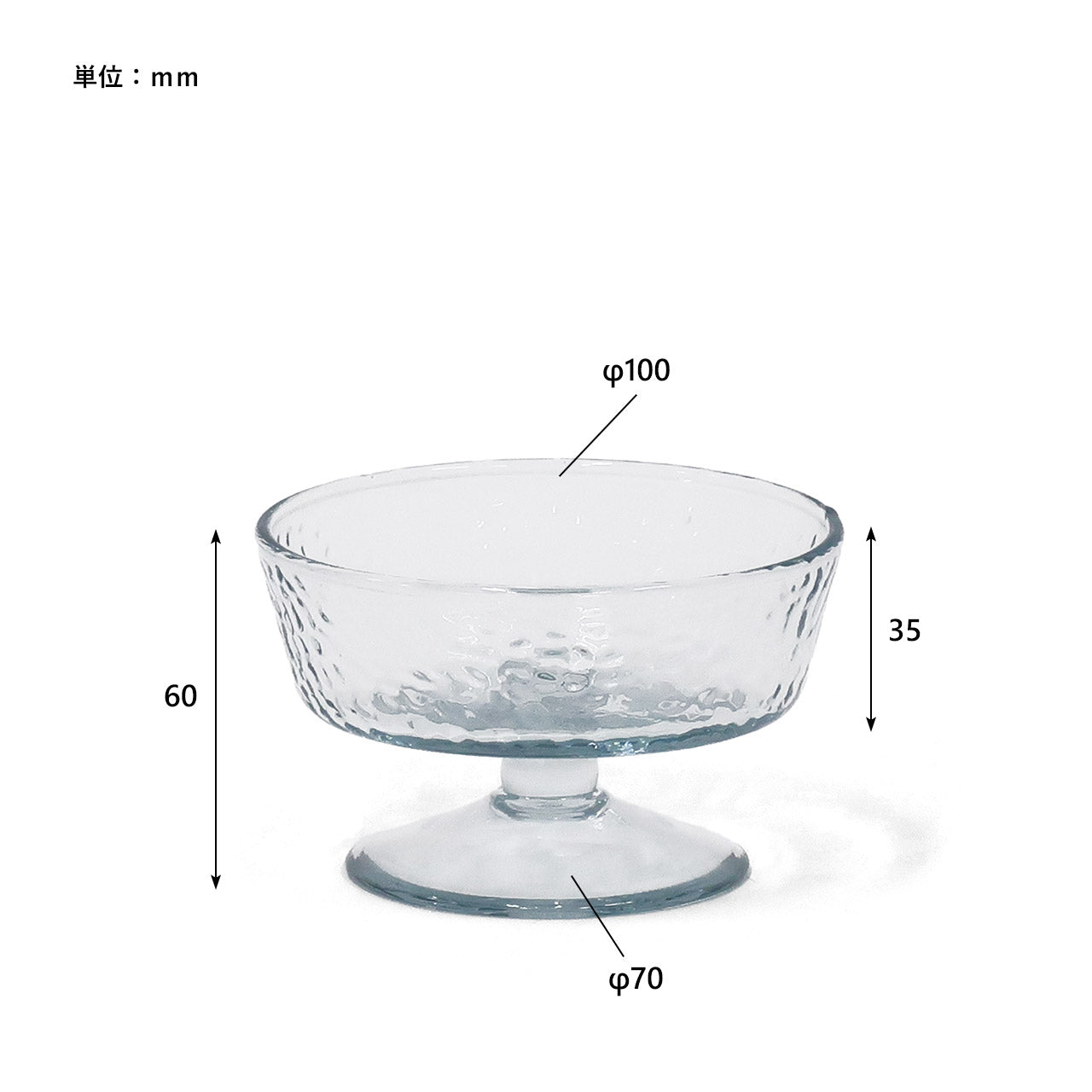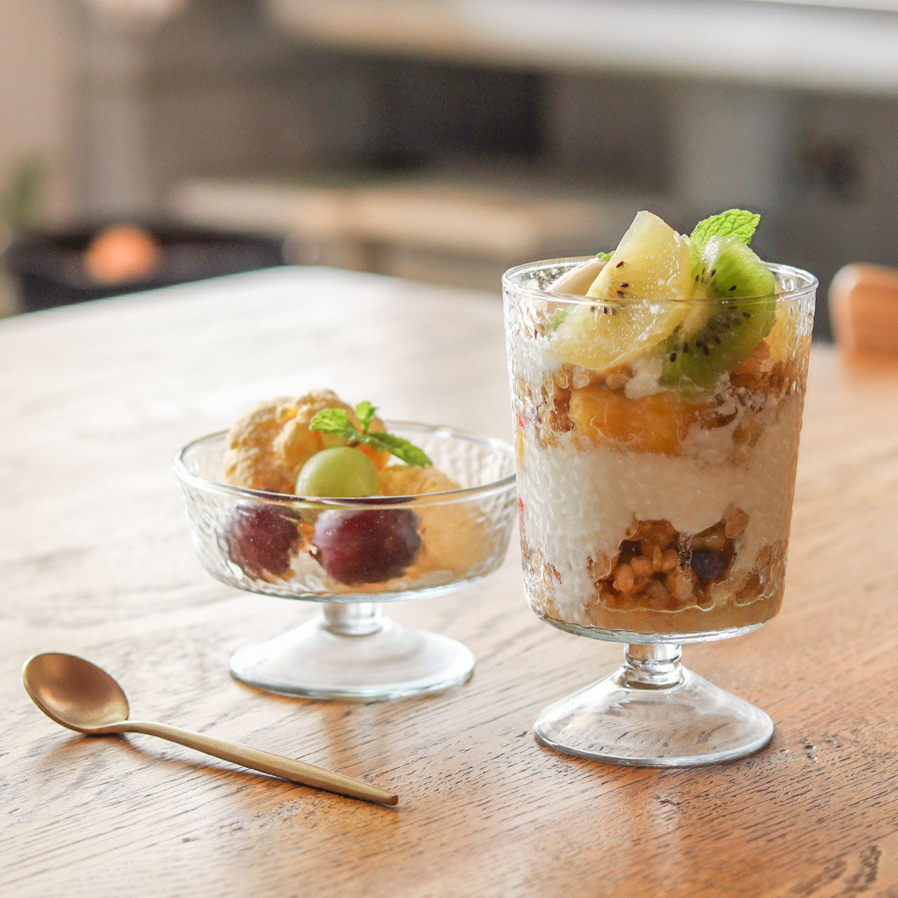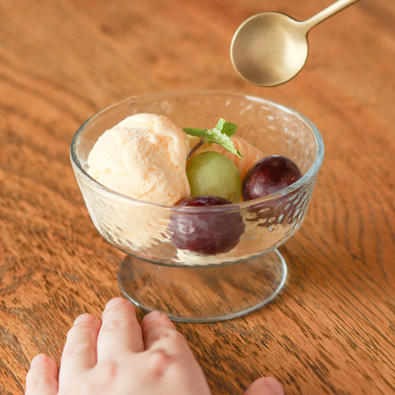 いつものデザートタイムが特別になる、脚付きのアイスクリームグラス。どこか懐かしい脚付きのレトロなデザインが、可愛らしいグラス。ガラス表面に施された凹凸のテクスチャーが涼しげで、いつものデザートタイムを特別な気分にさせてくれます。スタッキング可能なので、コンパクトに収納できるのも嬉しいポイント。アイスクリーム以外にも、フルーツやプリン、ヨーグルト、前菜など 様々なデザートや料理の盛り付けに活躍してくれます。同じSceneryvase(シナリーベース)シリーズのパフェグラスと合わせていただくと、よりテーブルが華やかになりおすすめです。