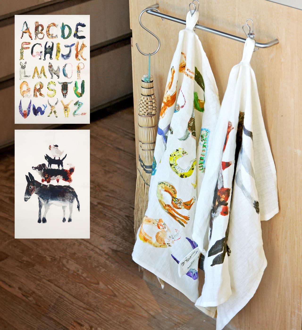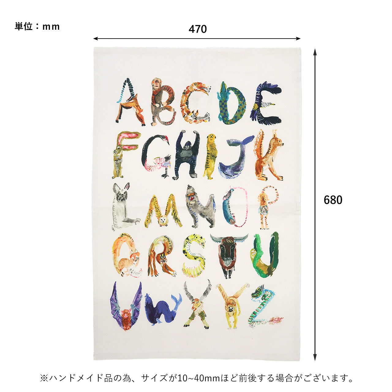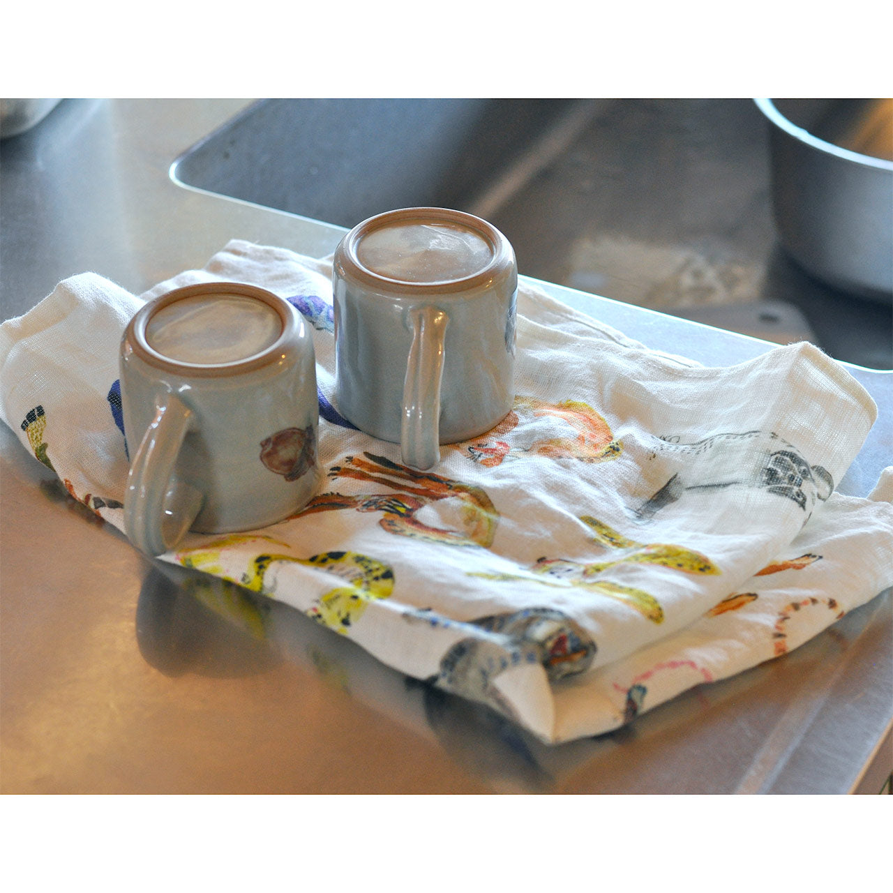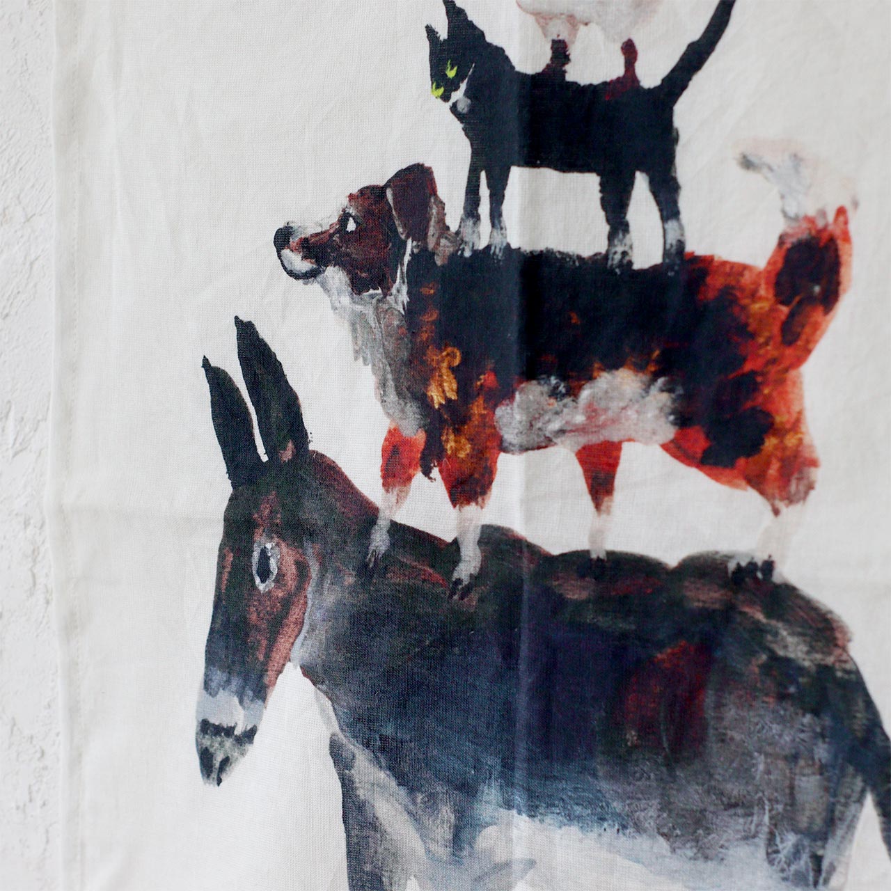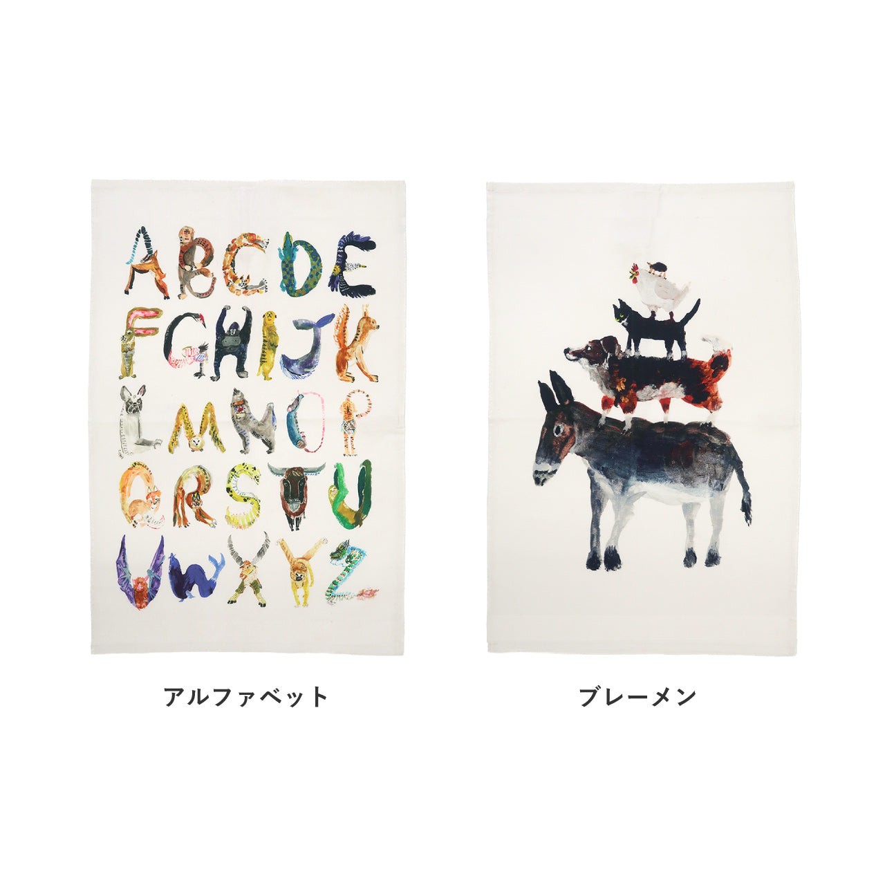 作家「KOTETSU」さんのイラストが描かれたキッチンタオル。色彩豊かで生き生きとした動物たちのイラストは見ているだけで元気を与えてくれます。動物たちをアルファベットの形になぞらえた「アルファベット」と、有名なグリム童話の1シーンを描いた「ブレーメン」の2種類。麻のシャリ感にコットンが合わさった少し柔らかな手触りで、通気性にも優れているためキッチンタオルにぴったりです。ループ状になった「Atelier KOTETSU」のネームタグ付き。使い終わったらフックにかけておけるので場所をとりません。キッチンクロスとしてはもちろん、手ぬぐいやランチョンマットに使ったり、タペストリーのように壁面に飾ってインテリアアイテムとしてもお楽しみいただけます。その他のKOTETSU(コテツ)シリーズでインテリアを揃えても 統一感が出ておすすめです。