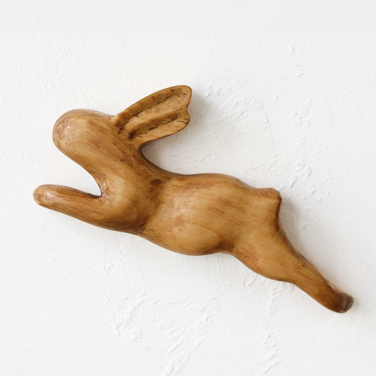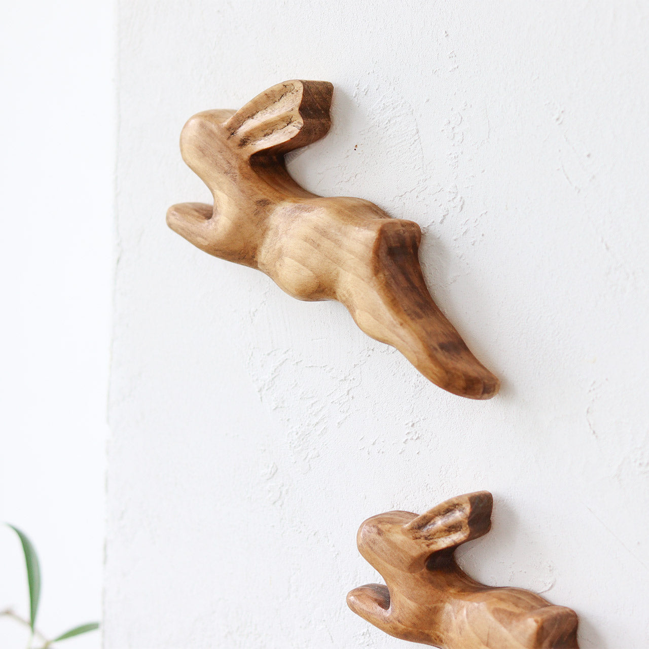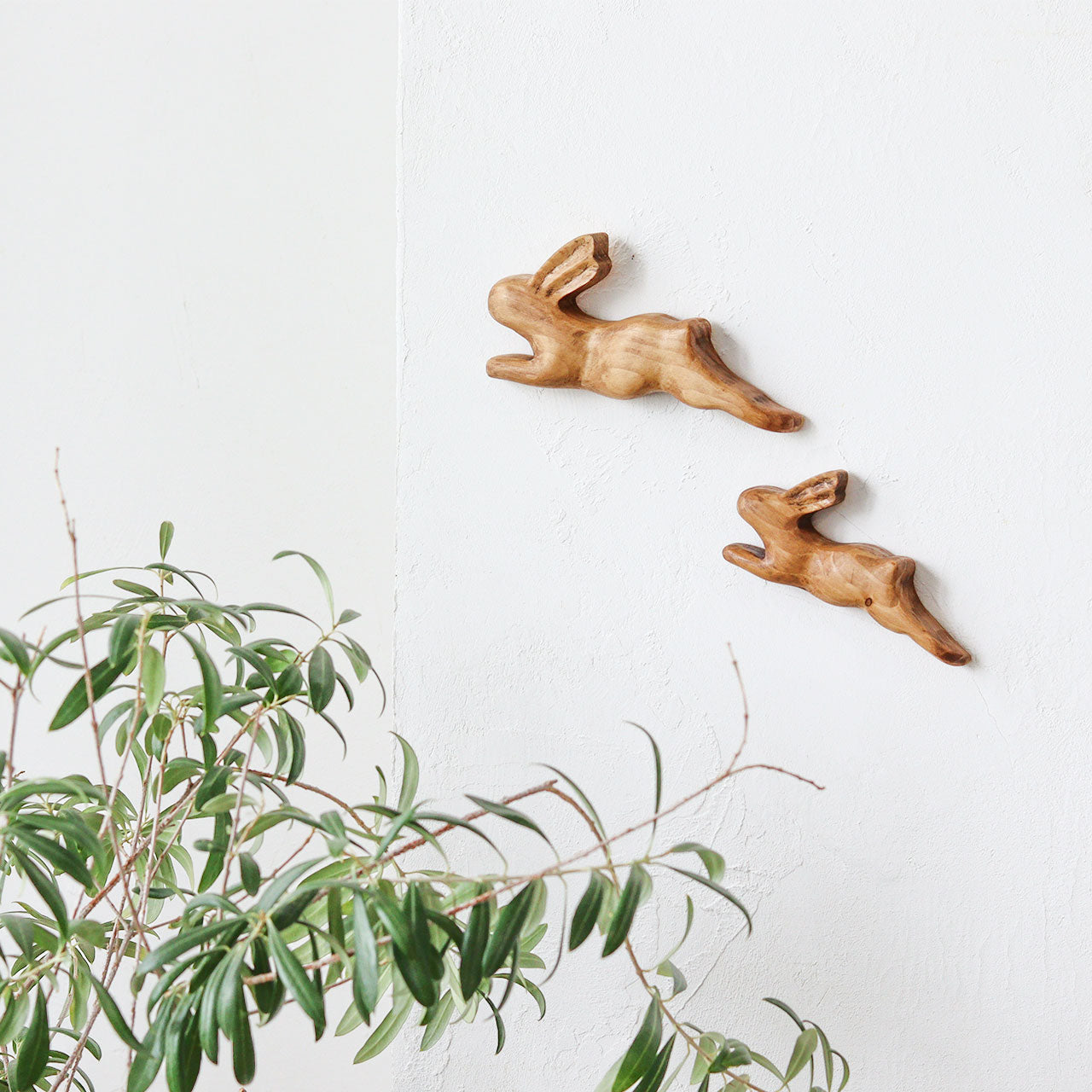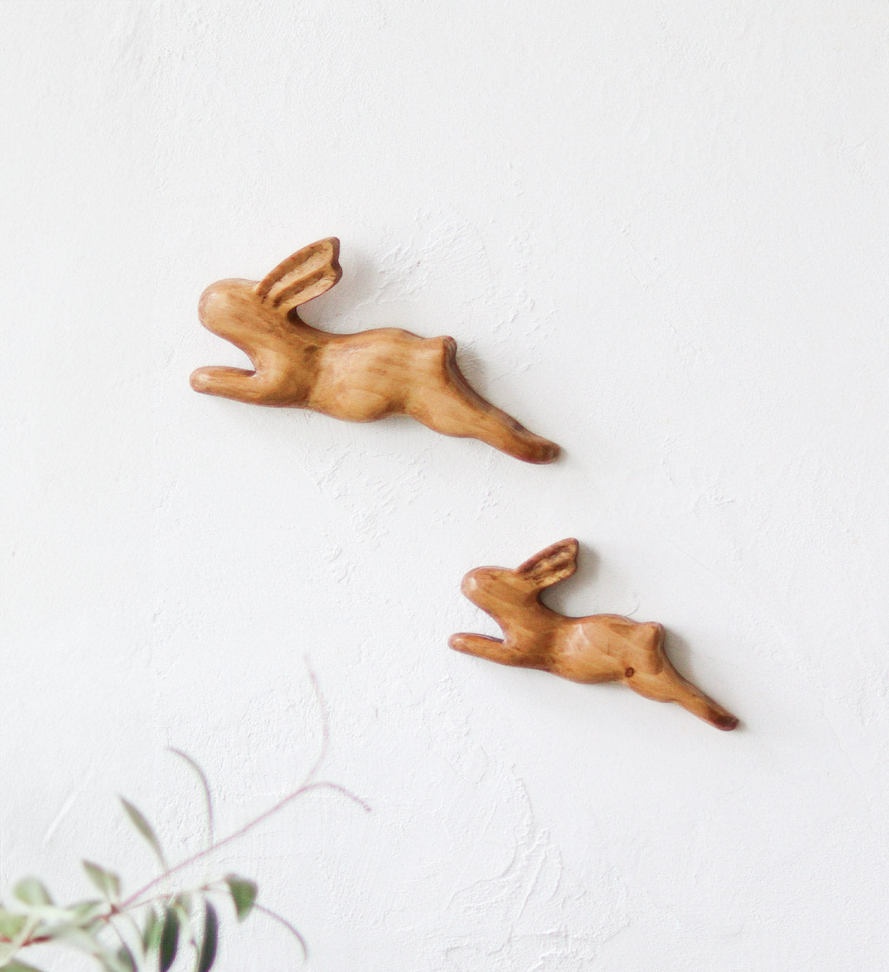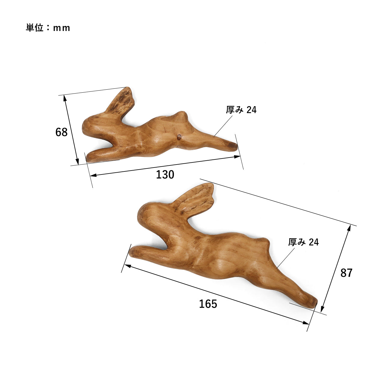 北欧テイストのお部屋にぴったりなうさぎをモチーフにした木製オブジェ。うさぎが伸びやかに跳ねる様子を、木材ならではの柔らかな曲線で表現したウォールオブジェ。壁に取り付けるための穴が裏面に2カ所設けられており、直径6mmまでのビスやプッシュピンを使って設置いただく仕様です。軽量なパイン材を使用し、さらにアンティークのような重厚感を出すために一つ一つ手作業で塗装を施しています。パイン材の自然な木目が美しく、どんなインテリアにも調和し溶け込んでくれます。(※天然木を使用しているため、木目や節の出方、色合いに個体差があります。予めご了承ください。)シンプルで愛らしいウサギのシルエットが、どんな部屋にもやさしく溶け込み空間を明るく演出します。SとL、2サイズセットでのお届けです。